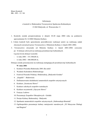Biuro Kontroli BK– 092 - 12 / 04 Informacja z kontroli w Białoruskim Towarzystwie Społeczno-Kulturalnym 15-062 Białystok, ul. Warszawska 11 1. Kontrola została przeprowadzona w dniach 10-28 maja 2004 roku na podstawie upoważnienia Nr 12/2004 Ministra Kultury. 2. Celem kontroli było sprawdzenie prawidłowości realizacji umów na realizację zadań zleconych zawartych przez Towarzystwo z Ministrem Kultury w latach 2001-2002. 3. Towarzystwo otrzymało od Ministra Kultury w latach 2001-2002 corocznie po 16 dotacji celowych na realizację przedsięwzięć kulturalnych. Łączna kwota dotacji wynosiła: - w roku 2001 - 531.500,00 zł, - w roku 2002 - 446.000,00 zł, Dotacje zostały przeznaczone na realizację następujących przedsięwzięć kulturalnych: W roku 2001 1. Konkurs Piosenka Białoruska 2001 dla szkół 2. Wydanie Kalendarza Białoruskiego 3. Festiwal Piosenki Polskiej i Białoruskiej „Białystok-Grodno” 4. „Kupalle” - Białowieża 5. Dofinansowanie działalności amatorskich zespołów artystycznych 6. Konkurs „Sceniczne Słowo” 7. Konkurs szkolnych zespołów teatralnych 8. Konkurs recytatorski „Ojczyste Słowo” 9. Festyny Ludowe 10. Prezentacje Zespołów Obrzędowych - Gródek 11. Święto Kultury Białoruskiej - Białystok 12. Spotkanie amatorskich zespołów artystycznych „Siabrouskaja Biasieda” 13. Ogólnopolskie prezentacje kultury mniejszości narodowych „XI Muzyczne Dialogi nad Bugiem” 1 14. Konferencja naukowa ”Droga ku wzajemności” - Białystok 15. VIII Festiwal „Piosenka Białoruska 2001” w Białymstoku 16. Konkurs szkolnych zespołów kolędniczych „Gwiazda i kolęda” W roku 2002 1. Konferencja naukowa ”Droga ku wzajemności” - Grodno 2. Dofinansowanie działalności amatorskich zespołów artystycznych 3. Festiwal Piosenki Białoruskiej i Polskiej „Białystok-Grodno” 4. Święto Kultury Białoruskiej - Białystok 5. Prezentacje Zespołów Obrzędowych 6. Konkurs recytatorski „Ojczyste Słowo” 7. Konkurs „Sceniczne Słowo” 8. Konkurs Piosenka Białoruska 2002 dla szkół podstawowych i gimnazjów 9. Konkurs szkolnych zespołów teatralnych 10. Kupalle - Białowieża 11. Festyny Ludowe 12. Spotkanie amatorskich zespołów artystycznych „Siabrouskaja Biasieda” 13. Wydanie Kalendarza Białoruskiego 14. Ogólnopolskie prezentacje kultury mniejszości narodowych „XII Muzyczne Dialogi nad Bugiem” 15. IX Ogólnopolski Festiwal „Piosenka Białoruska 2002” 16. Konkurs zespołów kolędniczych „Gwiazda i kolęda” 4. Kontrolę przeprowadził pracownik Biura Kontroli Ministerstwa Kultury. 5. W toku kontroli ustalono: Białoruskie Towarzystwo Społeczno-Kulturalne w Polsce działa od 26 lutego 1956 roku. Ubiegając się o dotacje celowe na zadania zlecone Towarzystwo skierowało w latach 2001-2002 do Ministra Kultury wnioski dot. poszczególnych ww. zadań. Na podstawie tych wniosków zawarto umowy na realizację powyższych zadań zleconych. Umowy te zawarte zostały pomiędzy Ministrem Kultury (zleceniodawcą) a Białoruskim Towarzystwem Społeczno-Kulturalnym (zleceniobiorcą). Białoruskie Towarzystwo Społeczno-Kulturalne w Polsce zgodnie z postanowieniami umów na realizację zadań zleconych było zobowiązane do: − prowadzenia dokumentacji rzeczowej dotyczącej realizacji zadań, 2 − opatrzenia dokumentów źródłowych stanowiących podstawę rozliczenia finansowego klauzulą „płatne ze środków Ministerstwa Kultury” i przechowywania tych dokumentów przez okres 3 lat po zakończeniu roku kalendarzowego, w którym realizowane były zadania, − prowadzenia wyodrębnionej ewidencji finansowo-księgowej środków otrzymanych na realizację umów oraz wydatków związanych z ich realizacją, − prowadzenia dokumentacji w sposób umożliwiający okresową ocenę wykonania danego zadania pod względem rzeczowym i finansowym. Towarzystwo prowadziło dokumentację rzeczową dotyczącą realizacji poszczególnych zadań zleconych. Dokumenty źródłowe będące podstawą rozliczenia finansowego zadań zostały opatrzone klauzulą „płatne ze środków Ministerstwa Kultury”. Towarzystwo prowadziło wyodrębnioną ewidencję finansowo-księgową środków otrzymanych od Ministra Kultury. Sprawozdania merytoryczne z realizacji zadań zleconych nie były prowadzone w sposób odpowiadający wzorowi ustalonemu umowami zawartymi między Ministrem Kultury a Towarzystwem. 6. W wyniku kontroli zobowiązano Białoruskie Towarzystwo Społeczno-Kulturalne w Polsce do realizacji następującego wniosku pokontrolnego: - w celu zapewnienia pełnej realizacji zobowiązań wynikających z zapisów umów zawartych z Ministerstwem sprawozdania finansowe muszą być sporządzane ściśle według wzoru stanowiącego załącznik umów zawieranych z Ministrem Kultury na realizację zadań zleconych. 7. W odpowiedzi na zalecenia pokontrolne Przewodniczący Zarządu Głównego Białoruskiego Towarzystwa Społeczno-Kulturalnego w Polsce poinformował o podjęciu działań mających na celu wyeliminowanie uchybień i nieprawidłowości wynikających z protokołu kontroli. Informacja została zaakceptowana przez p.o. dyrektora Biura Kontroli. 3