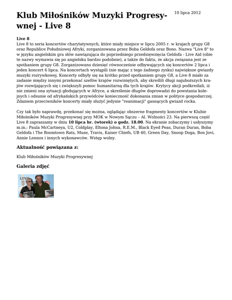 Klub Miłośników Muzyki Progresywnej - Live 8 10 lipca 2012 Live 8 Live 8 to seria koncertów charytatywnych, które miały miejsce w lipcu 2005 r. w krajach grupy G8 oraz Republice Południowej Afryki, zorganizowana przez Boba Geldofa oraz Bono. Nazwa "Live 8" to w języku angielskim gra słów nawiązująca do poprzedniego przedsięwzięcia Geldofa - Live Aid (obie te nazwy wymawia się po angielsku bardzo podobnie), a także do faktu, że akcja związana jest ze spotkaniem grupy G8. Zorganizowano dziesięć równocześnie odbywających się koncertów 2 lipca i jeden koncert 6 lipca. Na koncertach wystąpili (nie mając z tego żadnego zysku) największe gwiazdy muzyki rozrywkowej. Koncerty odbyły się na krótko przed spotkaniem grupy G8, a Live 8 miało za zadanie między innymi przekonać szefów krajów rozwiniętych, aby skreślili długi najuboższych krajów rozwijających się i zwiększyli pomoc humanitarną dla tych krajów. Krytycy akcji podkreślali, iż nie zmieni ona sytuacji głodujących w Afryce, a skreślenie długów doprowadzi do powstania kolejnych i odsunie od afrykańskich przywódców konieczność dokonania zmian w polityce gospodarczej. Zdaniem przeciwników koncerty miały służyć jedynie "reanimacji" gasnących gwiazd rocka. Czy tak było naprawdę, przekonać się można, oglądając obszerne fragmenty koncertów w Klubie Miłośników Muzyki Progresywnej przy MOK w Nowym Sączu – Al. Wolności 23. Na pierwszą część Live 8 zapraszamy w dniu 10 lipca br. (wtorek) o godz. 18.00. Na ekranie zobaczymy i usłyszymy m.in.: Paula McCartneya, U2, Coldplay, Eltona Johna, R.E.M., Black Eyed Peas, Duran Duran, Boba Geldofa i The Boomtown Rats, Muse, Travis, Kaiser Chiefs, UB 40, Green Day, Snoop Doga, Bon Jovi, Annie Lennox i innych wykonawców. Wstęp wolny. Aktualność powiązana z: Klub Miłośników Muzyki Progresywnej Galeria zdjęć
