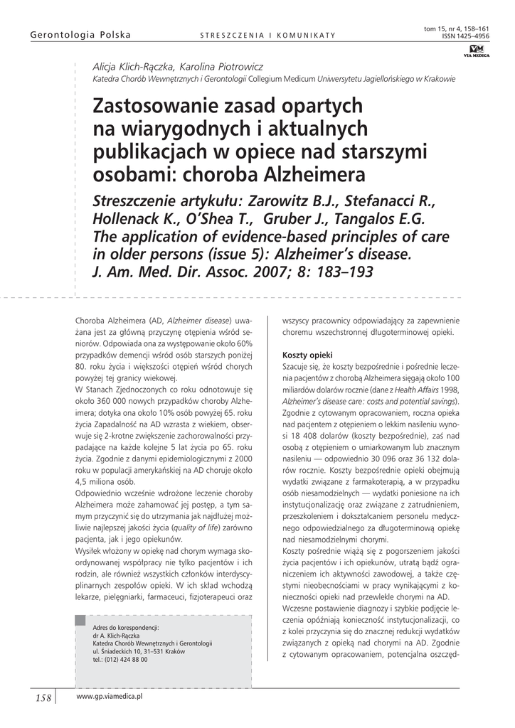 Gerontologia Polska STRESZCZENIA I KOMUNIKATY tom 15, nr 4, 158–161 ISSN 1425–4956 Alicja Klich-Rączka, Karolina Piotrowicz Katedra Chorób Wewnętrznych i Gerontologii Collegium Medicum Uniwersytetu Jagiellońskiego w Krakowie Zastosowanie zasad opartych na wiarygodnych i aktualnych publikacjach w opiece nad starszymi osobami: choroba Alzheimera Streszczenie artykułu: Zarowitz B.J., Stefanacci R., Hollenack K., O’Shea T., Gruber J., Tangalos E.G. The application of evidence-based principles of care in older persons (issue 5): Alzheimer’s disease. J. Am. Med. Dir. Assoc. 2007; 8: 183–193 Choroba Alzheimera (AD, Alzheimer disease) uważana jest za główną przyczynę otępienia wśród seniorów. Odpowiada ona za występowanie około 60% przypadków demencji wśród osób starszych poniżej 80. roku życia i większości otępień wśród chorych powyżej tej granicy wiekowej. W Stanach Zjednoczonych co roku odnotowuje się około 360 000 nowych przypadków choroby Alzheimera; dotyka ona około 10% osób powyżej 65. roku życia Zapadalność na AD wzrasta z wiekiem, obserwuje się 2-krotne zwiększenie zachorowalności przypadające na każde kolejne 5 lat życia po 65. roku życia. Zgodnie z danymi epidemiologicznymi z 2000 roku w populacji amerykańskiej na AD choruje około 4,5 miliona osób. Odpowiednio wcześnie wdrożone leczenie choroby Alzheimera może zahamować jej postęp, a tym samym przyczynić się do utrzymania jak najdłużej możliwie najlepszej jakości życia (quality of life) zarówno pacjenta, jak i jego opiekunów. Wysiłek włożony w opiekę nad chorym wymaga skoordynowanej współpracy nie tylko pacjentów i ich rodzin, ale również wszystkich członków interdyscyplinarnych zespołów opieki. W ich skład wchodzą lekarze, pielęgniarki, farmaceuci, fizjoterapeuci oraz Adres do korespondencji: dr A. Klich-Rączka Katedra Chorób Wewnętrznych i Gerontologii ul. Śniadeckich 10, 31–531 Kraków tel.: (012) 424 88 00 158 www.gp.viamedica.pl wszyscy pracownicy odpowiadający za zapewnienie choremu wszechstronnej długoterminowej opieki. Koszty opieki Szacuje się, że koszty bezpośrednie i pośrednie leczenia pacjentów z chorobą Alzheimera sięgają około 100 miliardów dolarów rocznie (dane z Health Affairs 1998, Alzheimer’s disease care: costs and potential savings). Zgodnie z cytowanym opracowaniem, roczna opieka nad pacjentem z otępieniem o lekkim nasileniu wynosi 18 408 dolarów (koszty bezpośrednie), zaś nad osobą z otępieniem o umiarkowanym lub znacznym nasileniu — odpowiednio 30 096 oraz 36 132 dolarów rocznie. Koszty bezpośrednie opieki obejmują wydatki związane z farmakoterapią, a w przypadku osób niesamodzielnych — wydatki poniesione na ich instytucjonalizację oraz związane z zatrudnieniem, przeszkoleniem i dokształcaniem personelu medycznego odpowiedzialnego za długoterminową opiekę nad niesamodzielnymi chorymi. Koszty pośrednie wiążą się z pogorszeniem jakości życia pacjentów i ich opiekunów, utratą bądź ograniczeniem ich aktywności zawodowej, a także częstymi nieobecnościami w pracy wynikającymi z konieczności opieki nad przewlekle chorymi na AD. Wczesne postawienie diagnozy i szybkie podjęcie leczenia opóźniają konieczność instytucjonalizacji, co z kolei przyczynia się do znacznej redukcji wydatków związanych z opieką nad chorymi na AD. Zgodnie z cytowanym opracowaniem, potencjalna oszczęd- Alicja Klich-Rączka, Karolina Piotrowicz, Opieka nad osobami starszymi z chorobą Alzheimera ność związana z opóźnieniem wdrożenia zorganizowanej opieki nad chorymi z otępieniem o znacznym nasileniu wynosi 2029 dolarów za każdy miesiąc odroczonej opieki stacjonarnej. Diagnoza Rozpoznanie choroby Alzheimera można ustalić z 90-procentową pewnością na podstawie ogólnego badania lekarskiego, badania neurologicznego oraz psychiatrycznej oceny objawów wskazujących na to schorzenie. Kryteria diagnostyczne zawarte w Diagnostic and Statistical Manual of Mental Disorders, 4th edition (DSM-IV) obejmują postępujące zaburzenia funkcji poznawczych wyrażone zaburzeniami pamięci oraz przynajmniej jedną spośród takich nieprawidłowości, jak: afazja, apraksja, agnozja bądź trudności w funkcjonowaniu we własnym środowisku socjalnym i/lub zawodowym. Przed postawieniem ostatecznej diagnozy należy wykluczyć inne zaburzenia ośrodkowego układu nerwowego, nieprawidłowości fizykalne czy psychiatryczne (np. choroba Parkinsona, majaczenie bądź schizofrenia). W ocenie chorego z podejrzeniem AD trzeba uwzględnić odwracalne przyczyny demencji, które powinny zostać zidentyfikowane, skorygowane lub wykluczone w trakcie diagnostyki. Leczenie Cele i założenia leczenia choroby Alzheimera to możliwie jak najdłuższe utrzymanie dotychczasowego poziomu samodzielności pacjenta, spowolnienie rozwijających się zaburzeń poznawczych, opóźnienie wystąpienia pobudzenia i agresji, odroczenie lub uniknięcie konieczności opieki stacjonarnej, redukcja ryzyka wystąpienia innych stanów chorobowych i kosztów z nimi związanych. Zgodnie z wytycznymi opartymi na wiarygodnych i aktualnych opracowaniach opublikowanych przez The American Academy of Neurology (2001 r.) i American Psychiatric Association (1997 r.) przyjmuje się, że stosowane w leczeniu choroby Alzheimera inhibitory cholinesterazy opóźniają rozwój schorzenia, lecz nie zmieniają jego przebiegu. Wydane w 2005 roku przez Research Technology Institute — University of North Carolina Evidence-Based Practice Center opracowanie stanowi dotychczas najobszerniejszy przegląd badań klinicznych dotyczących skuteczności inhibitorów cholinesterazy oraz memantyny w leczeniu choroby Alzheimera. Nawet najbardziej wiarygodne spośród przeszukanych i włączonych do opracowania analiz, ze wzglę- du na niejednoznaczne wyniki badań, często nie pozwalają na ostateczne sformułowanie wniosków. Porównania inhibitorów cholinestera