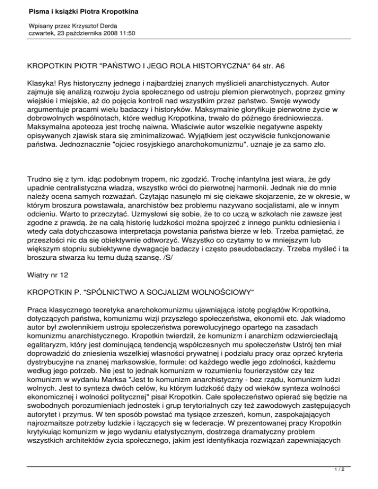 Pisma i książki Piotra Kropotkina Wpisany przez Krzysztof Derda czwartek, 23 października 2008 11:50 KROPOTKIN PIOTR "PAŃSTWO I JEGO ROLA HISTORYCZNA" 64 str. A6 Klasyka! Rys historyczny jednego i najbardziej znanych myślicieli anarchistycznych. Autor zajmuje się analizą rozwoju życia społecznego od ustroju plemion pierwotnych, poprzez gminy wiejskie i miejskie, aż do pojęcia kontroli nad wszystkim przez państwo. Swoje wywody argumentuje pracami wielu badaczy i historyków. Maksymalnie gloryfikuje pierwotne życie w dobrowolnych wspólnotach, które według Kropotkina, trwało do późnego średniowiecza. Maksymalna apoteoza jest trochę naiwna. Właściwie autor wszelkie negatywne aspekty opisywanych zjawisk stara się zminimalizować. Wyjątkiem jest oczywiście funkcjonowanie państwa. Jednoznacznie "ojciec rosyjskiego anarchokomunizmu". uznaje je za samo zło. Trudno się z tym. idąc podobnym tropem, nic zgodzić. Trochę infantylna jest wiara, że gdy upadnie centralistyczna władza, wszystko wróci do pierwotnej harmonii. Jednak nie do mnie należy ocena samych rozważań. Czytając nasunęło mi się ciekawe skojarzenie, że w okresie, w którym broszura powstawała, anarchistów bez problemu nazywano socjalistami, ale w innym odcieniu. Warto to przeczytać. Uzmysłowi się sobie, że to co uczą w szkołach nie zawsze jest zgodne z prawdą. że na całą historię ludzkości można spojrzeć z innego punktu odniesienia i wtedy cała dotychczasowa interpretacja powstania państwa bierze w łeb. Trzeba pamiętać, że przeszłości nic da się obiektywnie odtworzyć. Wszystko co czytamy to w mniejszym lub większym stopniu subiektywne dywagacje badaczy i często pseudobadaczy. Trzeba myśleć i ta broszura stwarza ku temu dużą szansę. /S/ Wiatry nr 12 KROPOTKIN P. "SPÓLNICTWO A SOCJALIZM WOLNOŚCIOWY" Praca klasycznego teoretyka anarchokomunizmu ujawniająca istotę poglądów Kropotkina, dotyczących państwa, komunizmu wizji przyszłego społeczeństwa, ekonomii etc. Jak wiadomo autor był zwolennikiem ustroju społeczeństwa porewolucyjnego opartego na zasadach komunizmu anarchistycznego. Kropotkin twierdził, że komunizm i anarchizm odzwierciedlają egalitaryzm, który jest dominującą tendencją współczesnych mu społeczeństw Ustrój ten miał doprowadzić do zniesienia wszelkiej własności prywatnej i podziału pracy oraz oprzeć kryteria dystrybucyjne na znanej marksowskie, formule: od każdego wedle jego zdolności, każdemu według jego potrzeb. Nie jest to jednak komunizm w rozumieniu fourierzystów czy tez komunizm w wydaniu Marksa "Jest to komunizm anarchistyczny - bez rządu, komunizm ludzi wolnych. Jest to synteza dwóch celów, ku którym ludzkość dąży od wieków synteza wolności ekonomicznej i wolności politycznej" pisał Kropotkin. Całe społeczeństwo opierać się będzie na swobodnych porozumieniach jednostek i grup terytorialnych czy też zawodowych zastępujących autorytet i przymus. W ten sposób powstać ma tysiące zrzeszeń, komun, zaspokajających najrozmaitsze potrzeby ludzkie i łączących się w federacje. W prezentowanej pracy Kropotkin krytykuiąc komunizm w jego wydaniu etatystycznym, dostrzega dramatyczny problem wszystkich architektów życia społecznego, jakim jest identyfikacja rozwiązań zapewniających 1/2 Pisma i książki Piotra Kropotkina Wpisany przez Krzysztof Derda czwartek, 23 października 2008 11:50 harmonię i solidarność w skali makro z poszanowaniem indywidualnej wolności obywateli. "Spólnictwo a socjalizm wolnościowy" jest właśnie próbą rozwiązania tego problemu. /A/ Wiatry nr 16 KROPOTKIN PIOTR "WSPOMNIENIA REWOLUCJONISTY" Prawdziwa cegła! Wszystkie tomy, po złączeniu, liczą ponad 500 stron. Z tego też względu nie dałem rady przeczytać całości. Właściwie, spiesząc się by zamknąć już "Wiatry". wchłonąłem na razie tylko pierwszy tom. Był on jednak na tyle atrakcyjny, że na pewno zapoznam się z pozostałymi i być może w kolejny numerze naszego infozinea jeszcze raz zobaczycie notatkę o tym wydawnictwie. Kropotkin to najbardziej znany, obok Bakunina, teoretyk i praktyk anarchizmu. Obdarzony, dzięki wszechstronnemu wykształceniu (będąc księciem nie było to trudne na początku XIX wieku w Rosji), doskonalą umiejętnością pisania i dobierania słów. Do tego stopnia, że jego "Wspomnienia" spisane na początku XX stulecia, czyta się niczym najbardziej wciągającą powieść autorstwa super wprawionego pisarza. Zresztą Kropotkin od najmłodszych lat sam tworzył sporo opowiadań, a nawet więcej, wydawał własną gazetę... codzienną! Coś a'la dzisiejszy zine - oczywiście upraszczając bardzo mocno. Miał na pewno dar do samodzielnego zaspokajania swoich marzeń i celów. "Wspomnienia..." w przeciwieństwie do pamiętników, często nie z winy autora, zawierają wiele uproszczeń i zakłamań. I tu pewne gały też są, ale akurat w pierwszym tomie nie mają większego znaczenia, ponieważ dotyczy on dzieciństwa. Poznajemy rodziców, nauczycieli, rodzeństwo, poddanych (ojciec miał sporą ilość chłopów) i otoczenie Piotra. Barwny język powoduje, że łatwo można poczuć klimat dziewiętnastowiecznej Rosji. Autor sporo miejsca poświęcił sytuacji chłopów, których egzystencja była naprawdę tragiczna. Równie pochłaniające są opisy przyrody, której nawet dzisiaj, w epoce wszechogarniającej cywilizacji u naszych, do niedawna jedynych wschodnich, sąsiadów nie brakuje. Pasjonująca lektura stanowiąca doskonale źródło historyczne. Brawa dla wydawcy. Trzeba znać! /S/ Wiatry Piekieł nr 14 2/2