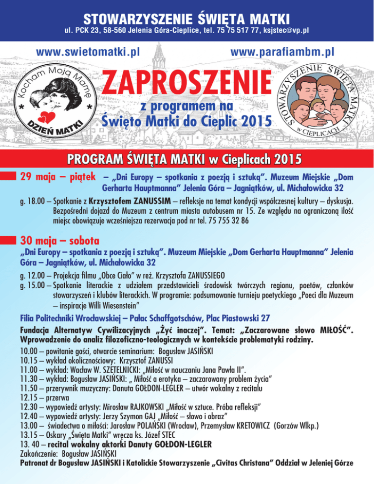 STOWARZYSZENIE ŚWIĘTA MATKI ul. PCK 23, 58-560 Jelenia Góra-Cieplice, tel. 75 75 517 77, [email protected] www.parafiambm.pl z programem na Święto Matki do Cieplic 2015 ARAFIA MATKI OŻEJ MIŁOSIERDZIA . PCK 23, 58-560 Jelenia Góra-Cieplice l. 75 7529 517 maja 77 – piątek – „Dni mail: [email protected] wC A MATKI ÊT ZAPROSZENIE ENIE ŒWI SZ OWARZY ST www.swietomatki.pl IEPLICACH STOWARZYSZENIE ŚWIĘTA MATKI ul. PCK 23 58-560 Jelenia Góra-Cieplice tel. 75 75„Dom 517 77 sztuką”. Muzeum Miejskie PROGRAM ŚWIĘTA MATKI w Cieplicach 2015 Europy – spotkania z poezją i Gerharta Hauptmanna” Jelenia Góra – Jagniątków, ul. Michałowicka 32 g. 18.00 – Spotkanie z Krzysztofem ZANUSSIM – refleksje na temat kondycji współczesnej kultury – dyskusja. Bezpośredni dojazd do Muzeum z centrum miasta autobusem nr 15. Ze względu na ograniczoną ilość miejsc obowiązuje wcześniejsza rezerwacja pod nr tel. 75 755 32 86 Akt zawierzenia miłości 30 maja – sobota polskich matek „Dni Europy – spotkania z poezją i sztuką”. Muzeum Miejskie „Dom Gerharta Hauptmanna” Jelenia Góra – Jagniątków, ul. Michałowicka Boże, Ty stworzyłeś matkę,32aby świat zrozumiał, czym jest miłość. g. 12.00 – Projekcja filmu „Obce Ciało” w reż. Krzysztofa ZANUSSIEGO g. 15.00 –Spotkanie literackie z udziałem przedstawicieli miłości środowisk twórczych regionu, poetów, członków Serce ofiarnej matki, to sanktuarium Boga i człowieka. i klubówŚwięta literackich. W programie: podsumowanie turnieju poetyckiego „Poeci dla Muzeum W imieniu stowarzyszeń Stowarzyszenia Matki w Cieplicach, na Jubileusz 25-lecia Święta Matki – inspiracje Willi Wiesenstein” rosimy tradycyjne wsparcie naszych społecznych działań nana rzecz rodziny przekazanie JakooGwardia Matki Bożej z Cieplic, przybywamy dziś Jasną Górę przez do szczególnego Filia Politechniki Wrocławskiej – Pałac Schaffgotschów, Plac Piastowski 27 roduktów Waszego Zakładu. omu Matki, aby modlić się o Bożą Miłość w polskich rodzinach. Wielka jest rola ojca i matki Fundacja Alternatyw „Żyć inaczej”. Temat: „Zaczarowane słowo MIŁOŚĆ”. naszej nauce: życia, wiaryCywilizacyjnych i miłości. Wprowadzenie do analiz filozoficzno-teologicznych w kontekście rodziny. Waszego Jako Przyjaciół naszego Święta zapraszamy Pana Prezesa zproblematyki rodziną i członków 10.00 – powitanie gości, otwarcie seminarium: Bogusław JASIŃSKI akładu na wielki Festyn Rodzinnyżyciu byłaś najlepszą żoną i matką, prosimy Cię, aby polskie Królowo Rodzin, w ziemskim 10.15 – wykład okolicznościowy: Krzysztof ZANUSSI matki i11.00 ojcowie, w niełatwych warunkach w Ojczyźnie poza jej granicami, dochowali – wykład: Wacław W. SZETELNICKI: „Miłośćżycia, w nauczaniu Jana PawłaiII”. w niedzielę 26 maja 2013 r.,życia” ierności: nowemu i chrześcijańskiej 11.30Bogu, – wykład: Bogusławżyciu JASIŃSKI: „ Miłość a erotyka –tradycji. zaczarowany problem 11.50 – przerywnik muzyczny: Danuta GOŁDON-LEGLER – utwór się wokalny z recitalu Jasnogórska Matko o pięknych oczach, pozwól sobą zachwycić i wyproś u Boga 12.15 – przerwa gdzie będziemy reklamować Wasze wyroby – prosimy o baner Waszego mądrość, aby Polacy w miłości do Ciebie – budowali miłość do kobiet, żon Zakładu. i matek. Prosimy 12.30 – wypowiedź artysty: Mirosław RAJKOWSKI „Miłość w sztuce. Próba refleksji” dostarczenie produktów Waszej Firmypolskiej do dnia 20 maja br.sercem dzieci, miłością małżeńską Matko nadSzymon duszą 12.40 –Kościoła wypowiedź czuwaj artysty: Jerzy GAJ „Miłość –młodzieży, słowo i obraz” opieką13.00 najstarszych – świadectwaworodzinach. miłości: Jarosław POLAŃSKI (Wrocław), Przemysław KRETOWICZ (Gorzów Wlkp.) Przekazujemy z dokładnym programem. 13.15 – Oskary zaproszenie „Święta Matki” wręcza ks. Józef uSTEC Pocieszycielko Strapionych, uproś cierpiącego Chrystusa Boże Pocieszenie dla 13. 40 – recital wokalny aktorki Danuty GOŁDON-LEGLER amotnych, płaczących, bezrobotnych matek, wielodzietnych rodzin i wskaż drogę pojednania Zakończenie: za Bogusław JASIŃSKI Dziękujemy okazaną życzliwość i pomoc. szystkich polskich dzieci. Niech miłość do Ciebie zjednoczy wszystkich Polaków. Patronat dr Bogusław JASIŃSKI i Katolickie Stowarzyszenie „Civitas Christana” Oddział w Jeleniej Górze Matko Dobrej Rady, prosimy o zachowanie wiary w rodzinach, że Chrystus ostatecznie W imieniu Stowarzyszenia Święta Matki 31 maja – niedziela – Plac kościelny, ul. PCK 23. Prowadzi Olgierd PONIŹNIK g. 11.30 – MARSZ DLA ŻYCIA I RODZINY. Od Politechniki, Pl. Piastowski 27 do Placu Kościelnego, ul. PCK 23. Organizatorzy: Katolickie Stowarzyszenie Edukacyjne u Erazma i Pankracego, Stowarzyszenie Święta Matki, Ewangelizacja Jeleniej Góry, Miasto Jelenia Góra. Prowadzą: Orkiestra Reprezentacyjna Miasta i Gminy Olszyna – kapelmistrz Andrzej DROZDOWICZ, Gwardia im. Tadeusza Kościuszki z Majdanu Zbydniowskiego – komendant Bogdan ZIELIŃSKI, Orkiestra Dęta ze Zbydniowa – kapelmistrz Stanisław CZUCHARA, Gwardia Matki Bożej Miłosierdzia z Cieplic – komendant Andrzej CIEPŁY g. 12.30 – UROCZYSTA MSZA ŚWIĘTA KONCELEBROWANA w intencji matek, ojców, małżeństw i rodzin (ucałowanie dłoni spracowanych matek i żon). Przewodniczy: Jego Ekscelencja Biskup prof. Ignacy DEC (Świdnica), O. prof. dr Eustachy RAKOCZY (Częstochowa – Jasna Góra) g. 13.40 – Prof. Wojciech WITKIEWICZ (Wrocław) – Słowo o Matce i Rodzinie g. 14.00 – MUSZTRA PARADNA – Orkiestra Reprezentacyjna Miasta i Gminy Olszyna – kapelmistrz Andrzej DROZDOWICZ, Gwardia Matki Bożej Miłosierdzia z Cieplic – komendant Andrzej CIEPŁY, Gwardia im. Tadeusza Kościuszki z Majdanu Zbydniowskiego – komendant Bogdan ZIELIŃSKI, Orkiestra Dęta ze Zbydniowa – kapelmistrz Stanisław CZUCHARA; Wój