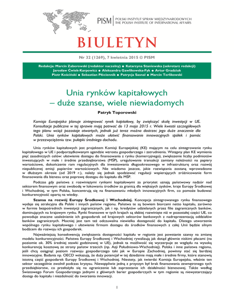 Nr 32 (1269), 7 kwietnia 2015 © PISM . . .. Redakcja: Marcin Zaborowski (redaktor naczelny) Katarzyna Staniewska (sekretarz redakcji) Jarosław Ćwiek-Karpowicz Aleksandra Gawlikowska-Fyk Artur Gradziuk Piotr Kościński Sebastian Płóciennik Patrycja Sasnal Marcin Terlikowski . . Unia rynków kapitałowych – duże szanse, wiele niewiadomych Patryk Toporowski Komisja Europejska planuje zintegrować rynek kapitałowy, by zwiększyć skalę inwestycji w UE. Konsultacje publiczne w tej sprawie mają potrwać do 13 maja 2015 r. Wiele kwestii szczegółowych tego planu wciąż pozostaje otwartych, jednak już teraz można dostrzec jego duże znaczenie dla Polski. Unia rynków kapitałowych może ułatwić finansowanie innowacyjnych spółek i pomóc w przezwyciężeniu tzw. pułapki średniego dochodu. Unia rynków kapitałowych jest projektem Komisji Europejskiej (KE) mającym na celu zintegrowanie rynku kapitałowego w UE i podporządkowanym agendzie wzrostu gospodarczego i zatrudnienia. Wstępny plan KE wymienia pięć zasadniczych celów: ułatwienie dostępu do finansowania z rynku (komercyjnego), zwiększenie liczby podmiotów inwestujących w małe i średnie przedsiębiorstwa (MŚP), uregulowanie transakcji zamiany należności na papiery wartościowe, dokończenie ram regulacyjnych dla inwestowania długookresowego w infrastrukturę oraz rozwój niepublicznej emisji papierów wartościowych. Nie wiadomo jeszcze, jakie rozwiązania zostaną wprowadzone w dłuższym okresie (od 2019 r.), należy się jednak spodziewać regulacji wspierających zróżnicowanie form finansowania dla biznesu oraz poprawę dostępu do kapitału dla MŚP. Podczas gdy państwa z rozwiniętymi rynkami kapitałowymi za priorytet uznają państwowy nadzór nad sektorem finansowym oraz swobodę w lokowaniu środków za granicą dla większych zysków, kraje Europy Środkowej i Wschodniej, w tym Polska, koncentrują się na finansowaniu młodych innowacyjnych firm, co pomoże budować konkurencyjność opartą na wiedzy. Szansa na rozwój Europy Środkowej i Wschodniej. Koncepcja zintegrowanego rynku finansowego wydaje się atrakcyjna dla Polski i innych państw regionu. Państwa te są bowiem biorcami netto kapitału, zarówno w formie bezpośrednich inwestycji zagranicznych, jak i np. kredytów udzielanych przez filie zagranicznych banków, dominujących na krajowym rynku. Rynki finansowe w tych krajach są słabiej rozwinięte niż w pozostałej części UE, co powoduje znaczne uzależnienie ich gospodarek od krajowych sektorów bankowych z nadreprezentacją oddziałów banków zagranicznych. Mocniej jest tam też odczuwalna niewielka dostępność do kapitału. Dlatego utworzenie wspólnego rynku kapitałowego i ułatwienie firmom dostępu do środków finansowych z całej Unii będzie silnym bodźcem do rozwoju ich gospodarek. Najważniejszą konsekwencją zwiększenia dostępności kapitału w regionie jest powstanie szansy na zmianę modelu konkurencyjności. Państwa Europy Środkowej i Wschodniej rywalizują jak dotąd głównie niskimi płacami (na poziomie ok. 30% średniej stawki godzinowej w UE), jednak ta możliwość się wyczerpuje ze względu na wysoką konkurencję kosztową ze strony państw trzecich (np. Azji Południowo-Wschodniej). Polska i inne państwa regionu, jeśli chcą osiągnąć poziom rozwoju gospodarczego taki jak w Europie Zachodniej, powinny stać się bardziej innowacyjne. Badania np. OECD wskazują, że duży potencjał w tej dziedzinie mają małe i średnie firmy, które stanowią istotną część gospodarek Europy Środkowej i Wschodniej. Niestety, jak twierdzi Komisja Europejska, właśnie ten sektor szczególnie zwolnił podczas kryzysu. Niewątpliwie jedną z przyczyn był brak finansowania zewnętrznego tych przedsiębiorstw, co przełożyło się na ograniczenie lub zaprzestanie ich działalności biznesowej. Także według Światowego Forum Gospodarczego jednymi z głównych barier gospodarczych w tym regionie są niewystarczający dostęp do kapitału i niezdolność do tworzenia innowacji. 1 Dla Polski budowa unii rynków kapitałowych będzie ważna również dlatego, że umożliwi rozwój warszawskiej Giełdy Papierów Wartościowych, osłabionej odpływem kapitału po reformie OFE. Dzięki unii Giełda stanie się bardziej dostępna dla inwestorów zagranicznych chcących lokować swój kapitał na obszarze bardziej perspektywicznym niż dojrzałe rynki zachodnie. Może także stać się atrakcyjniejszym miejscem do wprowadzenia spółek do obrotu giełdowego, zarówno dla podmiotów krajowych, jak i zagranicznych z regionu Europy Środkowej i Wschodniej. Hamulce integracji rynku. Oczekiwane efekty mogą jednak nie wystąpić, jeśli reformy i działania integracyjne okażą się powierzchowne. Trudno wykluczyć takie ryzyko: zbudowanie zintegrowanego rynku kapitałowego jest niewątpliwie dla instytucji UE dużym wyzwaniem i wiąże się z kilkoma problemami. Największy z nich to harmonizacja prawa w zakresie upadłości i restrukturyzacji, kwestionowana przez państwa członkowskie. To samo dotyczy harmonizacji regulacji podatkowych, które wpływają na funkcjonowanie rynków kapitałowych. Przykład braku zgody co do ustanowienia paneuropejskiego podatku od transakcji finansowych pokazuje, że państwa członkowskie są gotowe tylko na niewielkie ustępstwa w kwestii przenoszenia kompetencji fiskalnych na poziom unijny. Są także niechętne przekazywaniu kompetencji w obszarze finansowym i utrzymują bariery związane z usługami płatniczymi, rozrachunkowymi i powierniczymi. Dlatego, choć od lat 90. ubiegłego wieku UE wprowadza regulacje scalające europejski rynek kapitałowy, jest on daleki od pełnej integracji. Innym czynnikiem mogącym spowolnić ten proces jest poziom bezpieczeństwa innych form finansowania niż te oferowane przez banki. Sektor bankowy, objęty regulacjami ostrożnościowymi (np. pakietem Bazylea III, który reguluje zarządz