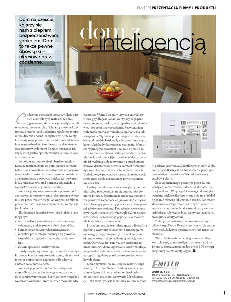 emiter|prezentacja firmy i produktu Dom najczęściej kojarzy się nam z ciepłem, bezpieczeństwem, spokojem. Dom to także pewne obowiązki – okresowe oraz codzienne. C odzienne obowiązki często wynikają z istnienia określonych instalacji w domu (ogrzewanie, klimatyzacja, wentylacja lub rekuperacja, system rolet). Ich pracę możemy kontrolować ręcznie, czyli codzienne regulować temperaturę dzienną i nocną, zamykać i otwierać rolety lub wentylować pomieszczenia. Możemy także wybrać metodę bardziej komfortową, czyli wykorzystać automatykę domową Teletask i pozwolić jej, aby w inteligentny sposób zarządzała wymienionymi czynnościami. Współczesny dom to obiekt bardzo szczelny. Dotyczy to przenikania do pomieszczeń zarówno hałasu, jak i powietrza. Pierwsza cecha jest oczywiście pożądana, natomiast brak dostępu powietrza z zewnątrz może powodować niekorzystne warunki dla mieszkańców, stąd potrzeba odpowiednio zaprojektowanej i używanej wentylacji. Wentylacja to proces usuwania z pomieszczeń zanieczyszczonego powietrza i dostarczania w jego miejsce powietrza świeżego. Ze względu na fakt, iż powietrze stale ulega zanieczyszczaniu, wentylacja jest konieczna. Skutkami źle działającej wentylacji lub jej braku mogą być: • wzrost wilgoci, prowadzący do parowania szyb okiennych, a także rozwoju pleśni i grzybów, • kondensacja toksycznych zanieczyszczeń, • niedobór powietrza potrzebnego do prawidłowego działania pieców gazowych, kominków itp., • złe samopoczucie użytkowników. Każdy z wyżej wymienionych czynników nie tylko obniża komfort użytkowania domu, ale stanowi również bezpośrednie zagrożenie dla zdrowia, a nawet życia mieszkańców. Wentylacja pomieszczeń może następować w sposób naturalny, bardzo często jednak metody te są niewystarczające. Rozwiązaniem mogą być wówczas nawiewniki, które również mogą nie zdać dom z inteligencją egzaminu. Wentylacja grawitacyjna sprawdzi się wtedy, gdy długość kanału wentylacyjnego przekracza teoretyczne 4 m, w przypadku wielu domów więc nie spełni swojego zadania. Rozwiązaniem tych problemów jest wentylacja mechaniczna lub rekuperacja. Wymiana powietrza jest wtedy niezależna od jakichkolwiek wpływów atmosferycznych, konstrukcji budynku oraz jego otoczenia. Wymuszony przepływ powietrza uzyskuje się dzięki zastosowaniu wentylatora. Zaletą wentylacji mechanicznej lub rekuperacji jest możliwość dostosowania jej wydajności do faktycznych potrzeb mieszkańców, dzięki czemu wzrasta komfort osób przebywających w wentylowanych pomieszczeniach. Dodatkowo, w przypadku stosowania rekuperacji, sporą część ciepła z usuwanego powietrza możemy odzyskać. Idealną metodą sterowania wentylacją mechaniczną lub rekuperacją staje się automatyka domowa Teletask. System może analizować parametry powietrza za pomocą czujników SQA i włączać wentylację, gdy parametry powietrza spadną poniżej założonego poziomu. Dodatkowo, wykrywszy zbyt wysokie stężenie tlenku węgla CO, na wszystkich wyświetlaczach mogą pojawić się odpowiednie komunikaty ostrzegawcze. Proces sterowania wentylacją może odbywać się zgodnie z wcześniej założonymi harmonogramami, uwzględniając dni pracujące i weekendy oraz okresy, w których dom realizuje symulację obecności. Oczywistą jest sprawa, iż w czasie naszej nieobecności w domu ogrzewanie oraz wentylacja mogą zostać wyłączone, a ich uruchomienie może nastąpić na godzinę przed powrotem domowników do domu. Biorąc prysznic, nie musimy się martwić zaparowanym lustrem. System Telatask zmierzy poziom wilgotności i po przekroczeniu określonej wartości, uruchomi wentylację lub rekuperację. Taka sama sytuacja może mieć miejsce w kuch- ŚWIAT REZYDENCJI u WNĘTRZ u OGRODÓW 1/2009 ni podczas gotowania. Dodatkowym atutem w obu tych przypadkach jest niedopuszczenie przez system inteligentnego domu Teletask do rozwoju grzybów i pleśni. Ilość wymienianego powietrza przez system wentylacji może również zależeć od aktualnej sytuacji w domu. Wizyta gości wymaga od wentylacji wymiany większej ilości powietrza niż na przykład oglądanie telewizji lub czytanie książki. Podczas realizowania każdego z tych „nastrojów” system Teletask sam będzie dobierał warunki pracy wentylacji (niższe lub wyższe biegi wentylatora, zmiana czasu pracy wentylatora). Podanych scenariuszy zachowania naszego Inteligentnego Domu Teletask jest oczywiście znacznie więcej. Jedynym ograniczeniem jest nasza wyobraźnia. Warto także nadmienić, iż system wentylacji kontrolowany przez inteligentny system taki jak Teletask, pozwala zaoszczędzić około 30% energii zużywanej na cele wentylacyjne. q Emiter sp. z o. o. 40-241 Katowice, ul. Porcelanowa 27 tel. (032) 730 34 00, fax (032) 730 34 01 www.emiter.net.pl, [email protected] 1