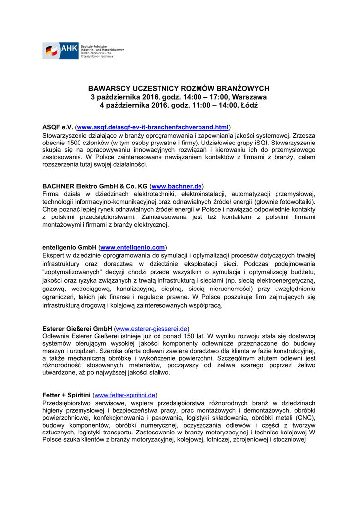 BAWARSCY UCZESTNICY ROZMÓW BRANŻOWYCH 3 października 2016, godz. 14:00 – 17:00, Warszawa 4 października 2016, godz. 11:00 – 14:00, Łódź ASQF e.V. (www.asqf.de/asqf-ev-it-branchenfachverband.html) Stowarzyszenie działające w branży oprogramowania i zapewniania jakości systemowej. Zrzesza obecnie 1500 członków (w tym osoby prywatne i firmy). Udziałowiec grupy iSQI. Stowarzyszenie skupia się na opracowywaniu innowacyjnych rozwiązań i kierowaniu ich do przemysłowego zastosowania. W Polsce zainteresowane nawiązaniem kontaktów z firmami z branży, celem rozszerzenia tutaj swojej działalności. BACHNER Elektro GmbH & Co. KG (www.bachner.de) Firma działa w dziedzinach elektrotechniki, elektroinstalacji, automatyzacji przemysłowej, technologii informacyjno-komunikacyjnej oraz odnawialnych źródeł energii (głownie fotowoltaiki). Chce poznać lepiej rynek odnawialnych źródeł energii w Polsce i nawiązać odpowiednie kontakty z polskimi przedsiębiorstwami. Zainteresowana jest też kontaktem z polskimi firmami montażowymi i firmami z branży elektrycznej. entellgenio GmbH (www.entellgenio.com) Ekspert w dziedzinie oprogramowania do symulacji i optymalizacji procesów dotyczących trwałej infrastruktury oraz doradztwa w dziedzinie eksploatacji sieci. Podczas podejmowania "zoptymalizowanych" decyzji chodzi przede wszystkim o symulację i optymalizację budżetu, jakości oraz ryzyka związanych z trwałą infrastrukturą i sieciami (np. siecią elektroenergetyczną, gazową, wodociągową, kanalizacyjną, cieplną, siecią nieruchomości) przy uwzględnieniu ograniczeń, takich jak finanse i regulacje prawne. W Polsce poszukuje firm zajmujących się infrastrukturą drogową i kolejową zainteresowanych współpracą. Esterer Gießerei GmbH (www.esterer-giesserei.de) Odlewnia Esterer Gießerei istnieje już od ponad 150 lat. W wyniku rozwoju stała się dostawcą systemów oferującym wysokiej jakości komponenty odlewnicze przeznaczone do budowy maszyn i urządzeń. Szeroka oferta odlewni zawiera doradztwo dla klienta w fazie konstrukcyjnej, a także mechaniczną obróbkę i wykończenie powierzchni. Szczególnym atutem odlewni jest różnorodność stosowanych materiałów, począwszy od żeliwa szarego poprzez żeliwo utwardzone, aż po najwyższej jakości staliwo. Fetter + Spiritini (www.fetter-spiritini.de) Przedsiębiorstwo serwisowe, wspiera przedsiębiorstwa różnorodnych branż w dziedzinach higieny przemysłowej i bezpieczeństwa pracy, prac montażowych i demontażowych, obróbki powierzchniowej, konfekcjonowania i pakowania, logistyki składowania, obróbki metali (CNC), budowy komponentów, obróbki numerycznej, oczyszczania odlewów i części z tworzyw sztucznych, logistyki transportu. Zastosowanie w branży motoryzacyjnej i technice kolejowej W Polsce szuka klientów z branży motoryzacyjnej, kolejowej, lotniczej, zbrojeniowej i stoczniowej Framat GmbH (www.framat.eu) Firma zajmuje się produkcją specjalnych maszyn oraz w technologii automatyzacji. Ekspert w zakresie budowy niestandardowych urządzeń, opracowywania innowacyjnych rozwiązań wykorzystujących roboty oraz w pełni zautomatyzowanych linii produkcyjnych. Renomowani klienci firmy, w szczególności z branży motoryzacyjnej i przemysłu tworzyw sztucznych, otrzymują wszystko z jednej ręki, począwszy od koncepcji poprzez konstrukcję / projektowanie i produkcję / programowanie aż po oddanie do eksploatacji na całym świecie. W Polsce chce otworzyć placówki. Poszukuje bezpośrednich kontaktów do polskiego przemysłu wytwórczego i motoryzacyjnego lub dystrybutorów / przedstawicieli handlowych w sektorze przemysłowym. GBN Systems GmbH (www.gbn.de) Biuro inżynieryjne zajmujące się mechatroniką i mechaniką precyzyjną, producent kontraktowy, menedżer łańcucha dostaw i dostawca systemów OEM. Domeną firmy jest budowa maszyn, urządzeń, podzespołów i systemowych komponentów elektronicznych, elektrotechnicznych i precyzyjnych od opracowania koncepcji przez budowę prototypu aż do produkcji mało lub wielkoseryjnej. Klienci to firmy z branży medycznej, produkcji półprzewodników, budowy maszyn jak też inne przedsiębiorstwa przemysłowe, szkoły wyższe, start-upy czy jednostki badawczorozwojowe. Poszukuje w Polsce klientów na swoje usługi z w/w dziedzin oraz partnerów technologicznych. HEITEC AG (www.heitec.de) Firma działa od 30 lat w obszarach oprogramowania, mechaniki i elektroniki oraz systemów EPS (electronic packaging systems) oferując specjalistyczne rozwiązania branżowe, poszczególne komponenty oraz zintegrowane systemy elektroniczne, mające główne zastosowanie w branżach: budowa maszyn, przemysł elektrotechniczny, samochodowy, farmaceutyczny, medyczny, energetyczny (szczególnie energetyka wiatrowa), spożywczy, ICT i logistyka. W Polsce poszukuje dystrybutorów. HPC AG (www.hpc.ag) Działa w obszarze recyklingu terenów, doradztwa środowiskowego oraz planowania infrastruktury (terenowe i laboratoryjne badania podłoża gruntowego, dokumentacja geologiczno-inżynierska, projektowanie posadowienia obiektów kubaturowych, ocena oddziaływania na środowisko, ustalanie stanu zanieczyszczenia środowiska gruntowo-wodnego, rekultywacja terenów zdegradowanych przez przemysł). Działająca w Polsce spółka poszukuje podwykonawców specjalizujących się w geotechnice, geologii inżynierskiej, hydrogeologii oraz rekultywacji terenów zdegradowanych. in-tech industry GmbH (www.in-tech.de Specjalizuje się w digitalizacji produktów przemysłowych. Łączy inżynierię z informatyką i sprawia, że koncepcja Przemysł 4.0 nabiera realnych kształtów i staje się rzeczywistością. Proces rozwoju firmy in-tech industry ma na celu komputeryzację inżynierii mechanicznej i techniki kolejowej i obejmuje zarówno inżynierię oprogramowania dla inteligentnych systemów sterowania, inżynierię systemów dla złożonych i krytycznych pod względem bezpi