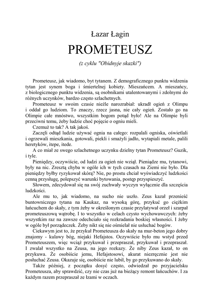 Łazar Łagin PROMETEUSZ (z cyklu "Obidnyje skazki") Prometeusz, jak wiadomo, byt tytanem. Z demograficznego punktu widzenia tytan jest synem boga i śmiertelnej kobiety. Mieszańcem. A mieszańcy, z biologicznego punktu widzenia, są osobnikami utalentowanymi i zdolnymi do róŜnych uczynków, bardzo często szlachetnych. Prometeusz w swoim czasie nieźle narozrabiał: ukradł ogień z Olimpu i oddał go ludziom. To znaczy, rzecz jasna, nie cały ogień. Zostało go na Olimpie całe mnóstwo, wszystkim bogom potąd było! Ale na Olimpie byli przeciwni temu, Ŝeby ludzie choć pojęcie o ogniu mieli. CzemuŜ to tak? A tak jakoś. Zaczęli odtąd ludzie uŜywać ognia na całego: rozpalali ogniska, oświetlali i ogrzewali mieszkania, gotowali, piekli i smaŜyli jadło, wytapiali metale, palili heretyków, itepe, itede. A co miał ze swego szlachetnego uczynku dzielny tytan Prometeusz? Guzik, i tyle. Pieniędzy, oczywiście, od ludzi za ogień nie wziął. Pieniądze mu, tytanowi, były na nic. Zresztą chyba w ogóle ich w tych czasach na Ziemi nie było. Dla pieniędzy byłby ryzykował skórą? Nie, po prostu chciał wyświadczyć ludzkości cenną przysługę, polepszyć warunki bytowania, postęp przyspieszyć. Słowem, zdecydował się na swój zuchwały wyczyn wyłącznie dla szczęścia ludzkości. Ale mu to, jak wiadomo, na sucho nie uszło. Zeus kazał przenieść buntowniczego tytana na Kaukaz, na wysoką górę, przykuć go cięŜkim łańcuchem do skały, z tym Ŝeby w określonym czasie przylatywał orzeł i szarpał prometeuszową wątrobę. I to wszystko w celach czysto wychowawczych: Ŝeby wszystkim raz na zawsze odechciało się rozkradania boskiej własności. I Ŝeby w ogóle był porządeczek. śeby nikt się nie ośmielał nie usłuchać bogów. Ciekawym jest to, Ŝe przykuł Prometeusza do skały na mur-beton jego dobry znajomy - kulawy bóg, niejaki Hefajstos. Oczywiście było mu wstyd przed Prometeuszem, więc wciąŜ przykuwał i przepraszał, przykuwał i przepraszał. I zwalał wszystko na Zeusa, na jego rozkazy. śe niby Zeus kazał, to on przykuwa. śe osobiście jemu, Hefajstosowi, akurat niezręcznie jest nie posłuchać Zeusa. Okazuje się, osobiście nie lubił, by go przykuwano do skały. TakŜe później, z początku dosyć często, odwiedzał po przyjacielsku Prometeusza, aby sprawdzić, czy nie czas juŜ na bieŜący remont łańcuchów. I za kaŜdym razem przepraszał ze łzami w oczach. Minęło wiele, wiele lat. StaroŜytni Grecy w przeszłość odeszli. Inni Grecy się pojawili, juŜ nie staroŜytni. Dawno przestały przylatywać orły, by poszarpać Prometeuszowi wątrobę. Zaczęły zamiast siebie wrony posyłać. Poszarpią wrony na łapu-capu wątrobę i hajda na stare śmiecie. A Prometeusz, biedaczysko, stoi sobie na swojej skale jak rekrut na warcie. Tylko czasami łańcuchami zadzwoni. Patrzy na dół, w dolinę. A dolina (kiedyś pusta była, ludzie po jaskiniach się chowali) cała teraz ogniami prometeuszowymi świeci - pochodnie, ogniska, domowe okienka, ogień w dymarkach i piecach chlebowych. Na radość Prometeuszowi. Smakowite zapachy, z ognia zrodzone, z doliny dochodzą - gotowanego, smaŜonego mięsa, świeŜo pieczonego chleba - i znów Prometeusz się raduje: nie na darmo wszak wystąpił przeciw całemu Olimpowi. Miło, Ŝe ludzie bez ustanku jego ognia uŜywają. Pal się, pal się jasno, Ŝeby nie zagasło! Szkoda tylko, Ŝe z tej odległości głosy kiepsko słychać. Coś jakby o Prometeuszu gadają, ale co konkretnie - zrozumieć nie moŜna. I dobrze, Ŝe nie moŜna zrozumieć. Baby się zebrały, na Prometeuszu języki strzępią. Jedna baba mówi: "Istna bieda z prometeuszowym ogniem! Ciągle uwaŜaj, Ŝeby kotlety się nie przypaliły. Jak dobrze było w dawnych czasach, przed tym całym Prometeuszem! Oderwiesz, bywało, ile trzeba surowego mięsa i Ŝuj sobie na zdrowie... I witamin więcej w surowym, i gotować nie trzeba... Posolisz, bywało, łezkami, i wcinaj na zdrowie... A tak tłucz je, przeklęte, w bułce obtaczaj, i jeszcze przewracaj z boku na bok... I jeszcze gdy się przyrumieni..." Druga sąsiadka się oburza: "A poŜary? Zagapisz się i wszystko płonie sinym ogniem - i meble, i koŜuchy... Wprost lepiej nie rozpalać tego diabelskiego ognia! Przed Prometeuszem przecieŜ o poŜarach nikt nie słyszał... A ile pieniędzy się traci na ubezpieczenie od ognia!... Dzieciaka samego w domu nie zostawisz... Prababka mi opowiadała: pójdą, bywało, z pradziadkiem w gości, a dzieciaki zostają same w jaskini. I Ŝadnego zagroŜenia poŜarowego nie było... Tylko czasem zaplątał się do jaskini szablozęby tygrys..." A trzecia sąsiadka na prawną stronę problemu napiera: "A ja tak wam powiem. Podoba się czy nie, z punktu widzenia prawa karnego kradzieŜ ognia to pospolity zabór cudzego mienia. Porządny tytan nigdy przecieŜ na kradzieŜ sobie nie pozwoli - czy to ognia, czy czegoś innego. Kraść ogień! Fe!... Dziś ogień ukradnie, jutro ambrozję ze stołu boskiego, a pojutrze cały Olimp bez chitonów zostawi, jak ich mama rodziła!..." Wszystkie te rozmowy do Prometeusza, chwała Zeusowi, nie dochodzą. Widzi za to, Ŝe jego ogień ludziom słuŜy, i Prometeusz jest szczęśliwy. Gdy przejeŜdŜa obok tamtej skały na wiernym osiołku jakowyś podróŜny, wita obojętnie Prometeusza: - Jak zdrówko, tytanie ? Jak tam wątroba? A Prometeusz odpowiada: - W porządeczku! Z rosyjskiego tłumaczył Andrzej Prószyński