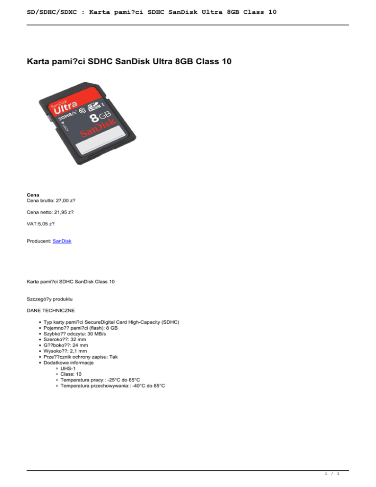 SD/SDHC/SDXC : Karta pami?ci SDHC SanDisk Ultra 8GB Class 10 Karta pami?ci SDHC SanDisk Ultra 8GB Class 10 Cena Cena brutto: 27,00 z? Cena netto: 21,95 z? VAT:5,05 z? Producent: SanDisk Karta pami?ci SDHC SanDisk Class 10 Szczegó?y produktu DANE TECHNICZNE Typ karty pami?ci SecureDigital Card High-Capacity (SDHC) Pojemno?? pami?ci (flash): 8 GB Szybko?? odczytu: 30 MB/s Szeroko??: 32 mm G??boko??: 24 mm Wysoko??: 2,1 mm Prze??cznik ochrony zapisu: Tak Dodatkowe informacje UHS-1 Class: 10 Temperatura pracy:: -25°C do 85°C Temperatura przechowywania:: -40°C do 85°C 1 / 1 Powered by TCPDF (www.tcpdf.org)