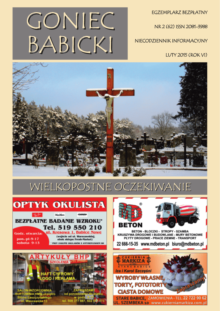 Adres wydawcy (redakcji): PUNKT REDAKCYJNY: Księgarnia "VERBUM" - Stare Babice, ul. Rynek 17 Redaguje Zespół w składzie: Michał Starnowski Dariusz Smoliński,Tomasz Szuba Piotr Dąbrowski Autor zdjęcia na okładce: Michał Starnowski ZGŁOSZENIA REKLAMOWE I OGŁOSZENIOWE: tel. 796-920-796; 796-020;796 lub [email protected] lub [email protected] Skład: ; Konto: mbank Druk: STOP DLA KOMPOSTOWNI W RADIOWIE Mieszkańcy Radiowa, Mościsk, Klaudyna i inni wzięli udział w dniu 20 lutego 2015 roku o godz. 17:00 w proteście przeciwko układom, kolesiostwie i patologii urzędniczej, czyli przeciwko kompostowni w Radiowie. Protest, który zorganizowało Stowarzyszenie „Czyste Radiowo” odbył się na skrzyżowaniu ul. Arkuszowej z Estrady. Radny Mościsk - Jacek Sobiecki i Radna Klaudyna - Karolina Bielińska. Michał Starnowski na podstawie relacji: Karoliny Bielińskiej, Jacka Sobieckiego i Krzysztofa Kaliszewskiego fot. Karolina Bielińska Protest na żywo emitowany był w programie telewizji TVP INFO: "To jest temat". KONKURS NASZEGO NIECODZIENNIKA Uwaga, uwaga!!! Kolejna odsłona Naszego konkursu. Niestety u Nas kumulacji nie ma, w dniach 2-13 marca 2015 roku Po okazaniu dowodu rejestracyjnego otrzyma bon towarowy KSIĘGARNIA "VERBUM" POLECA... UWIKŁANIE Z. MIŁOSZEWSKIEGO Na ekranach kin od początku roku gości "Ziarno prawdy" z Robertem Więckiewiczem w roli prokuratora Teodora Szackiego, film nakręcony na podstawie powieści Zygmunta Miłoszewskiego o tym samym tytule. My tymczasem zachęcamy do lektury pierwszej części cyklu kryminałów z tym bohaterem, zatytułowanej "Uwikłanie". Czy powodem morderstwa mogły być negatywne emocje, Teodor Szacki to nietuzinkowy urzędnik państwowy: Uwikłani są wszyscy... ofiara, morderca, a nawet prokurator. "…Szacki nie lubił kiedy wyśmiewano się z jego stroju. Bez względu na pogodę miał na sobie garnitur i krawat, bo był prokuratorem, a nie dostawcą delikatesów do warzywniaka. - Co mamy? - zapytał, wyciągając papierosa. Pierwszego z trzech, na które pozwalał sobie codziennie. - Jednego trupa, czworo podejrzanych…" Rozpoczął się okres Wielkiego Postu, czas pokuty, przygotowujący do przeżycia najważniejszych dla chrześcijan Świąt Wielkanocnych. W naszej księgarni do nabycia rozważania Drogi Krzyżowej, nabożeństwo Gorzkich Żali w formie książkowej wraz z płytą CD, a także modlitewniki broszurowe - idealna pomoc w rachunku sumienia dla dorosłych, młodzieży i dzieci. Serdecznie zapraszamy. Dariusz Smoliński SPRAWA FIACIKA I WANDALIZMU Stał, straszył, zastanawiał, czyli kilka słów o porzuconym samochodzie w Bliznem Łaszczyńskiego na ul. Warszawskiej. W Bliznem Łaszczyńskiego na Warszawskiej, nieopodal ulicy Przejazd przez ponad dwa miesiące, czyli od połowy listopada 2014 roku stał rozbity i porzucony czerowny Fiat Cinquecento. W chwili pisania tego artykułu, a ukazał się on w internecie (www.babice24.pl) 6 lutego 2015 roku, wą "stoją" dziś mocno przekrzywione. Zbieg okoliczności, nieszczęśliwe wypadki, czy może celowe działanie człowieka?? Akty wandalizmu nie są u Nas wyjątkami. pojazd znów był widziany przy ul. Warszawskiej, Pana Tomasza Adamczyka, Niestety za te wszystkie wybryki płacimy My, mieszkańcy, podatnicy. "Z ustaleń w sprawie wynika, że pojazd w dniu 15 listopada 2014 roku uczestniczył w zda rzeniu drogowym na ulicy Warszawskiej w miejscowości Blizne Łaszczyńskiego, a sprawca przedmiotowego zdarzenia pozostawił pojazd na trawniku, czym spowodował popełnienie wykroczenia z art.144 KW". Koszty, jakie Gmina Stare Babice poniosła w latach 2011-2012 w związku z ujawnionymi na mieniu komunalnym aktami wanda lizmu, to: 16.200; 30.000 zł.; Ponadto Komendant Tomasz Adamczyk Miejscowa Komenda Powiatowa Policji prowadzi czynności wyjaśniające w tej sprawie, art. 86 KW art. 144 KW w sprawie trwają ustalenia aktualnego właściciela pojazdu, 25.000; Jeżdżąc po terenie obserwuję czasami rzeczy, których inni nie dostrzegają lub dostrzec po prostu nie chcą. 30.000 zł.; 300 zł, 3.214 zł. Na granicy Gmin: Stare Babice i Izabelin, Sami zobaczcie, że kwoty podane powyżej nie należą wcale do małych, Zielone tablice, które określają nazwy miejscowości, wygrzebane wraz z betonową podbudo- nie będą mogły być już spożytkowane na inne cele - np. doświetlenie ulic, czy budowę chodników. Michał Starnowski WOJCIESZYN - NIEFORTUNNA LOKALIZACJA TORU MOTO CROSS - NIE MILKNĄ KOMENTARZE PO ART. W GMINNEJ PRASIE Do Redakcji naszej gazety wpłynęły trzy listy, które są pokłosiem artykułu, jaki ukazał się w styczniowym numerze Gazety Babickiej (1/2015). Zamieszczamy poniżej treść wszystkich trzech, zdając sobie sprawę, że nad zagadnieniem należy się pochylić i w krótkim czasie doprowadzić do rozwiązania sprawy. Witold Dziewulski. Stanisławów ciąg dalszy na stronie obok... Piotr (nazwisko znane Redakcji) Marian Zupa, 8-krotny medalista mistrzostw Polski w motocrossie, MP (nazwisko znane Redakcji) "To sprzęt przeznaczony wyłącznie do zabawy na naturalnym podłożu. I tylko w miejscach do tego przeznaczonych, bo jeżdżąc poza torem, niszczy się naturę, i to na kilka sposobów - płoszy się zwierzęta, smrodzi i mocno zmienia ukształtowanie terenu. - Tak postępują tylko wandale - mówi pan Marian". Niech sport łączy, a nie dzieli! PRAWNIK RADZI - PRAWA KOBIET W CIĄŻY Ciąża jest szczególnym okresem w życiu każdej kobiety. Wymaga szczególnej dbałości o zdrowie, sprawność i kondycje. Okres ciąży u pra cownicy, to również szczególna dbałość o warunki i otoczenie pracy, czas pracy a przede wszystkim pewność stosunku pracy. zakaz rozwiązania z nią w trakcie ciąży umowy o pracę, a także w okresie urlopu macierzyńskiego. "Pracodawca nie może wypowiedzieć ani rozwiązać umowy o pracę w okresie ciąży, a także w okresie urlopu macierzyńskiego pracownicy, chyba że zachodzą przyczyny uza