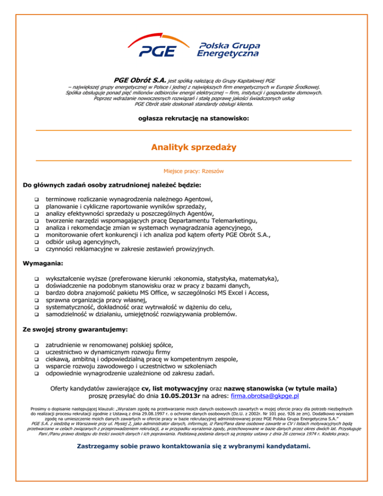 PGE Obrót S.A. jest spółką należącą do Grupy Kapitałowej PGE – największej grupy energetycznej w Polsce i jednej z największych firm energetycznych w Europie Środkowej. Spółka obsługuje ponad pięć milionów odbiorców energii elektrycznej – firm, instytucji i gospodarstw domowych. Poprzez wdrażanie nowoczesnych rozwiązań i stałą poprawę jakości świadczonych usług PGE Obrót stale doskonali standardy obsługi klienta. ogłasza rekrutację na stanowisko: _______________________________________________________________ Analityk sprzedaży _______________________________________________________________ Miejsce pracy: Rzeszów Do głównych zadań osoby zatrudnionej należeć będzie: terminowe rozliczanie wynagrodzenia należnego Agentowi, planowanie i cykliczne raportowanie wyników sprzedaży, analizy efektywności sprzedaży u poszczególnych Agentów, tworzenie narzędzi wspomagających pracę Departamentu Telemarketingu, analiza i rekomendacje zmian w systemach wynagradzania agencyjnego, monitorowanie ofert konkurencji i ich analiza pod kątem oferty PGE Obrót S.A., odbiór usług agencyjnych, czynności reklamacyjne w zakresie zestawień prowizyjnych. Wymagania: wykształcenie wyższe (preferowane kierunki :ekonomia, statystyka, matematyka), doświadczenie na podobnym stanowisku oraz w pracy z bazami danych, bardzo dobra znajomość pakietu MS Office, w szczególności MS Excel i Access, sprawna organizacja pracy własnej, systematyczność, dokładność oraz wytrwałość w dążeniu do celu, samodzielność w działaniu, umiejętność rozwiązywania problemów. Ze swojej strony gwarantujemy: zatrudnienie w renomowanej polskiej spółce, uczestnictwo w dynamicznym rozwoju firmy ciekawą, ambitną i odpowiedzialną pracę w kompetentnym zespole, wsparcie rozwoju zawodowego i uczestnictwo w szkoleniach odpowiednie wynagrodzenie uzależnione od zakresu zadań. Oferty kandydatów zawierające cv, list motywacyjny oraz nazwę stanowiska (w tytule maila) proszę przesyłać do dnia 10.05.2013r na adres: [email protected] Prosimy o dopisanie następującej klauzuli: „Wyrażam zgodę na przetwarzanie moich danych osobowych zawartych w mojej ofercie pracy dla potrzeb niezbędnych do realizacji procesu rekrutacji zgodnie z Ustawą z dnia 29.08.1997 r. o ochronie danych osobowych (Dz.U. z 2002r. Nr 101 poz. 926 ze zm). Dodatkowo wyrażam zgodę na umieszczenie moich danych zawartych w ofercie pracy w bazie rekrutacyjnej administrowanej przez PGE Polska Grupa Energetyczna S.A.” PGE S.A. z siedzibą w Warszawie przy ul. Mysiej 2, jako administrator danych, informuje, iż Pani/Pana dane osobowe zawarte w CV i listach motywacyjnych będą przetwarzane w celach związanych z przeprowadzeniem rekrutacji, a w przypadku wyrażenia zgody, przechowywane w bazie danych przez okres dwóch lat. Przysługuje Pani /Panu prawo dostępu do treści swoich danych i ich poprawiania. Podstawą podania danych są przepisy ustawy z dnia 26 czerwca 1974 r. Kodeks pracy. Zastrzegamy sobie prawo kontaktowania się z wybranymi kandydatami.