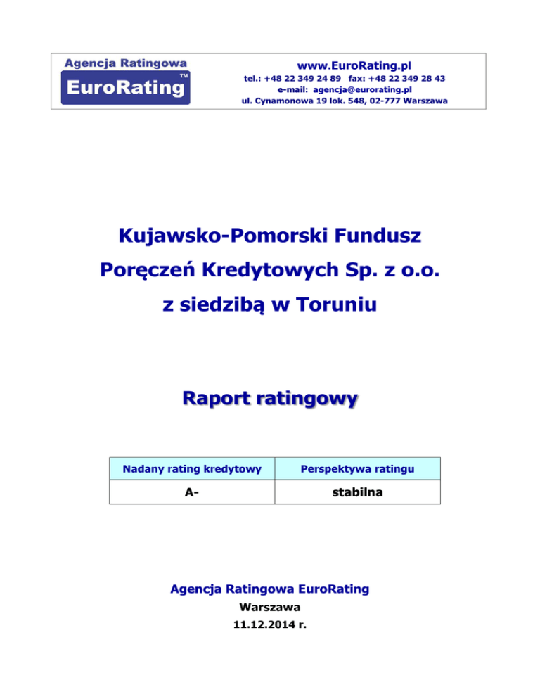 www.EuroRating.pl tel.: +48 22 349 24 89 fax: +48 22 349 28 43 e-mail: [email protected] ul. Cynamonowa 19 lok. 548, 02-777 Warszawa Kujawsko-Pomorski Fundusz Poręczeń Kredytowych Sp. z o.o. z siedzibą w Toruniu Raport ratingowy Nadany rating kredytowy Perspektywa ratingu A- stabilna Agencja Ratingowa EuroRating Warszawa 11.12.2014 r. Kujawsko-Pomorski Fundusz Poręczeń Kredytowych Sp. z o.o. – raport ratingowy (11.12.2014 r.) SPIS TREŚCI 1. Informacje o nadanym ratingu kredytowym 3 1.1 Aktualny rating Funduszu 3 1.2 Zakres jakiego dotyczy rating 3 2. Podstawowe informacje o ocenianym podmiocie 3 2.1 Dane rejestrowe 3 2.2 Historia Funduszu i przedmiot działalności 4 3. Analiza ekonomiczno-finansowa 5 3.1 Rachunek zysków i strat 5 3.2 Bilans i pozycje pozabilansowe 10 3.3 Analiza wskaźnikowa 13 3.4 Tworzenie rezerw na ryzyko związane z udzielaniem poręczeń 20 3.5 Ocena czynników niefinansowych 21 4. Podsumowanie analizy i ostateczna ocena ryzyka kredytowego 27 5. Skala ratingów agencji ratingowej EuroRating 30 6. Ujawnienia regulacyjne 31 EuroRating 2 Kujawsko-Pomorski Fundusz Poręczeń Kredytowych Sp. z o.o. – raport ratingowy (11.12.2014 r.) 1. Informacje o nadanym ratingu kredytowym 1.1 Aktualny rating Funduszu Poziom ratingu Perspektywa Data nadania ratingu A- stabilna 11.12.2014 Główny analityk ratingowy Przewodniczący Komitetu Ratingowego Kamil Kolczyński dr Piotr Dalkowski Analityk Ratingowy Analityk Ratingowy tel.: +48 22 349 24 33 tel.: +48 22 349 21 46 e-mail: [email protected] e-mail: [email protected] 1.2 Zakres jakiego dotyczy rating Rating kredytowy nadany Kujawsko-Pomorskiemu Funduszowi Poręczeń Kredytowych Sp. z o.o. z siedzibą w Toruniu dotyczy ryzyka związanego z udzielanymi przez Fundusz poręczeniami kredytów bankowych i pożyczek dla mikro, małych i średnich przedsiębiorstw. Rating określa ryzyko wystąpienia sytuacji, w której Fundusz stanie się niewypłacalny, tzn. nie będzie w stanie terminowo i w pełnej wysokości uregulować zobowiązań wynikających z udzielonych przez niego poręczeń, które zostały postawione w stan wymagalności przez banki (lub inne podmioty) akceptujące te poręczenia. 2. Podstawowe informacje o ocenianym podmiocie 2.1 Dane rejestrowe Przedsiębiorstwo Kujawsko-Pomorski Fundusz Poręczeń Kredytowych Sp. z o.o. zarejestrowane jest w Rejestrze Przedsiębiorstw Sądu Rejonowego w Toruniu VII Wydział Gospodarczy Krajowego Rejestru Sądowego, pod numerem KRS 0000147815; numer REGON 871641894; NIP 956-20-88-789. Kapitał zakładowy spółki wynosi 5.974.000 zł (opłacony w całości) i dzieli się na 5.974 udziałów o wartości nominalnej 1.000 zł każdy. Spółka została utworzona na czas nieograniczony. Siedziba Funduszu mieści się w Toruniu (87-100), przy ul. Szosa Chełmińska 26. Zarząd spółki jest dwuosobowy: funkcję Prezesa Zarządu pełni pani Agnieszka Wasita, funkcję Zastępcy Prezesa Zarządu pełni pani Monika Szelc. Strukturę udziałową spółki według stanu na dzień sporządzania niniejszego raportu przedstawia tabela 2.1. EuroRating 3 Kujawsko-Pomorski Fundusz Poręczeń Kredytowych Sp. z o.o. – raport ratingowy (11.12.2014 r.) Tabela 2.1 Kujawsko-Pomorski FPK – struktura udziałowa Lp. Udziałowcy Liczba udziałów (szt.) Kapitał (tys. zł) Udział 1 Urząd Marszałkowski Województwa Kujawsko-Pomorskiego 3 000 3 000 50,2% 2 Bank Gospodarstwa Krajowego 2 950 2 950 49,4% 3 Powiat Bydgoszcz 6 6 0,10% 4 Gmina Żnin 5 5 0,08% 5 Gmina Miasta Solec Kujawski 5 5 0,08% 6 Gmina Miasta Chełmża 3 3 0,05% 7 Gmina Płużnica 2 2 0,03% 8 Gmina Pakość 2 2 0,03% 9 Gmina Zakrzewo 1 1 0,02% 5 974 5 974 100,0% RAZEM Dominującą rolę w działalności Spółki pełni dwóch udziałowców: Samorząd Województwa Kujawsko-Pomorskiego oraz Bank Gospodarstwa Krajowego, posiadający razem 99,6% udziałów. Symboliczne ilości udziałów posiadają także władze powiatu bydgoskiego oraz kilku gmin z terenu województwa kujawsko-pomorskiego. 2.2 Historia i przedmiot działalności Kujawsko-Pomorski Fundusz Poręczeń Kredytowych Sp. z o.o. powstał we wrześniu 2002 roku z inicjatywy Urzędu Marszałkowskiego Województwa Kujawsko-Pomorskiego, który był jedynym założycielem Funduszu. K-PFPK działalność operacyjną rozpoczął w roku 2003; w roku tym do składu udziałowców dołączyły także lokalne samorządy z terenu województwa kujawskopomorskiego. Istotne dokapitalizowanie Funduszu nastąpiło w roku 2004, kiedy to drugim największym udziałowcem Spółki stał się Bank Gospodarstwa Krajowego. Dzięki temu K-PFPK dołączył do sieci regionalnych funduszy poręczeniowych, wchodzących w skład Krajowej Grupy Poręczeniowej, skupiającej fundusze poręczeniowe, w których BGK posiada udziały. Oprócz wpłat wnoszonych przez udziałowców Spółki, w latach 2005-2008 kapitał poręczeniowy K-PFPK powiększony został o dotacje celowe otrzymane przez Fundusz za pośrednictwem Polskiej Agencji Rozwoju Przedsiębiorczości w ramach unijnego programu Sektorowy Program Operacyjny „Wzrost Konkurencyjności Przedsiębiorstw” (SPO-WKP). W IV. kwartale 2009 roku Fundusz zawarł umowę na kolejne dofinansowanie działalności poręczeniowej ze środków unijnych (tym razem o charakterze zwrotnym) w ramach „Regionalnego Programu Operacyjnego Województwa Kujawsko-Pomorskiego na lata 2007-2013” (RPO). EuroRating 4 Kujawsko-Pomorski Fundusz Poręczeń Kredytowych Sp. z o.o. – raport ratingowy (11.12.2014 r.) W 2012 roku Fundusz przystąpił do realizacji programu JEREMIE, w ramach którego otrzymał limit na reporęczenia w wysokości 9 mln zł. Ze względu na niskie zainteresowanie i nakładanie się celów finansowania z RPO, Fundusz w maju 2013 podpisał aneks zmniejszający limit JEREMIE do aktualnie wykorzystanego, co oznaczało rezygnację z dalszej realizacji tego programu. Podstawowym celem Funduszu jest wspieranie rozwoju sektora mikro, małych i średnich przedsiębior
