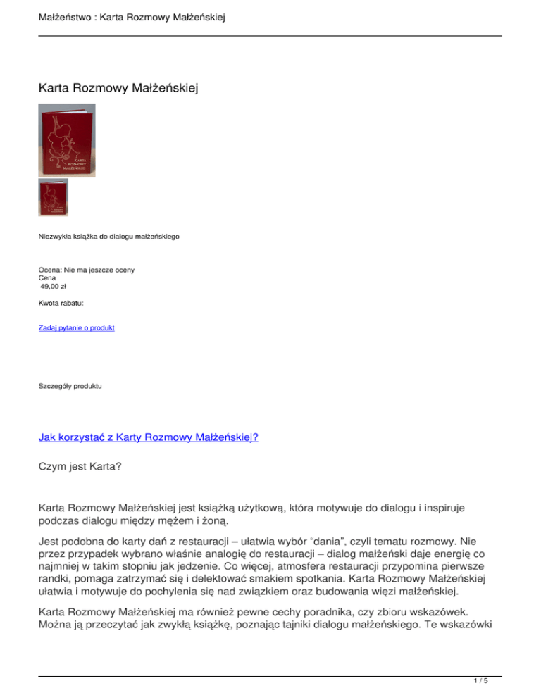 Małżeństwo : Karta Rozmowy Małżeńskiej Karta Rozmowy Małżeńskiej Niezwykła książka do dialogu małżeńskiego Ocena: Nie ma jeszcze oceny Cena 49,00 zł Kwota rabatu: Zadaj pytanie o produkt Szczegóły produktu Jak korzystać z Karty Rozmowy Małżeńskiej? Czym jest Karta? Karta Rozmowy Małżeńskiej jest książką użytkową, która motywuje do dialogu i inspiruje podczas dialogu między mężem i żoną. Jest podobna do karty dań z restauracji – ułatwia wybór “dania”, czyli tematu rozmowy. Nie przez przypadek wybrano właśnie analogię do restauracji – dialog małżeński daje energię co najmniej w takim stopniu jak jedzenie. Co więcej, atmosfera restauracji przypomina pierwsze randki, pomaga zatrzymać się i delektować smakiem spotkania. Karta Rozmowy Małżeńskiej ułatwia i motywuje do pochylenia się nad związkiem oraz budowania więzi małżeńskiej. Karta Rozmowy Małżeńskiej ma również pewne cechy poradnika, czy zbioru wskazówek. Można ją przeczytać jak zwykłą książkę, poznając tajniki dialogu małżeńskiego. Te wskazówki 1/5 Małżeństwo : Karta Rozmowy Małżeńskiej przydadzą się również w codziennej komunikacji, poza zaaranżowanym spotkaniem. Siądźcie we dwoje, wybierzcie Swoje danie i rozkoszujcie się wspaniale spędzonym czasem. Trzy części rozmowy Celem Karty Rozmowy Małżeńskiej jest wzbogacenie przeżywania rozmowy – aby małżonkowie mogli delektować się dialogiem,wspólnym przebywaniem ze sobą. Karta zakłada trzy części – wprowadzenie, rozmowa na temat, zakończenie rozmowy, a w związku z tym składa się z przystawek, dań głównych i deserów. Przystawka to wstęp do dialogu, początek, poniekąd wzajemne przywitanie się, wejście w głąb rozmowy. Danie główne stanowi meritum rozmowy i zajmuje większość przeznaczonego na dialog czasu. Pytania przy daniu głównym są przykładowymi, które można wykorzystać i mogą być inspiracją do rozmowy. W Karcie znajdziemy 14 kategorii tematycznych. Deser jest „podawany” zakończeniem dialogu. na końcu i jest Wybór tematów Małżonkowie przed rozmową wybierają jedną przystawkę (np. przystawkę Zmiana – z grupy Przystawek do wypowiedzenia). Kolejny wybór pada na jeden temat jako danie główne (np. danie Najbliższa rocznica – z grupy Świętowanie). Jako ostatni jest wybierany deser. Tego wyboru najlepiej dokonać po skończonym daniu głównym. Należy tutaj również wspomnieć o innej możliwości: małżonkowie mogą na początku wybrać danie główne i od tego wyboru uzależnić w jakimś stopniu przystawkę (ewentualnie również deser). Większość dań głównych i przystawek ma 2/5 Małżeństwo : Karta Rozmowy Małżeńskiej nazwy, które mogą się kojarzyć z poszczególnymi tematami, tak aby nie było trudno wybrać coś dla siebie. Niektóre jednak mogą brzmieć zagadkowo. W razie wątpliwości można przeczytać pytania dodatkowe. Do Karty Rozmowy Małżeńskiej dołączona jest Instrukcja, która opisuje, jak stosować Kartę. Sugerujemy zapoznanie się z Instrukcją przed pierwszą rozmową. O karcie Jakość i estetyka W intymnej rozmowie pomaga odpowiedni nastrój. Ciepłe kolory, zapalona świeczka. Wygląd Karty Rozmowy Małżeńskiej okaże się w tym aspekcie pomocny. Okładka jest twarda z delikatnymi tłoczeniami, dostępna jest w dwóch kolorach – ecru i bordowym. Na każdej stronie Karty znajdują się zdobienia, a tekst jest podany w przystępnych porcjach, czytelną czcionką. Kredowy papier gwarantuje większą trwałość i funkcjonalność – Karta nie zamyka się sama po otwarciu. Na lata KartaKarta Rozmowy Małżeńskiej to doskonały prezent dla współmałżonka lub dla innego małżeństwa. Sprawdzi się dla nowożeńców, w rocznicę ślubu lub z innej okazji. Jest to z pewnością prezent twórczy, niesztampowy i uniwersalny. Rozmowy Małżeńskiej została zaprojektowana jako narzędzie do dialogu, z którego będzie się korzystać przez lata. Znajduje to wyraz nie tylko w użytych materiałach, lecz również w specjalnie przygotowanych miejscach na zapisanie dat rozmów przy zastosowanych daniach – tematach. W ten sposób po latach Karta samoistnie stanie się pamiętnikiem rozmów małżeńskich. Na prezent Karta Rozmowy Małżeńskiej to doskonały prezent dla współmałżonka lub dla innego małżeństwa. Sprawdzi się dla nowożeńców, w rocznicę ślubu lub z innej okazji. Jest to z pewnością prezent twórczy, niesztampowy i 3/5 Małżeństwo : Karta Rozmowy Małżeńskiej uniwersalny. Autorzy o sobie i genezie karty Początek Karty Był pogodny, ciepły i pracowity dzień latem 2013 r. Wieczorem zasiedliśmy do stołu przy herbatce z kwiatów lipy... Na blogu autorów można przeczytać o początku Karty (kliknij). Historia nazwy Karta Co ma wspólnego o. Karol Meissner OSB z Kartą Rozmowy Małżeńskiej? Na blogu autorów znajduje się odpowiedź (kliknij). Potem były kolejne miesiące pracy nad Kartą, wypełnione wyzwaniami i odpowiedziami na wyzwania. Pierwsza wersja testowa była gotowa na wiosnę 2014 r. Latem na warsztat została wzięta strona graficzna oraz inne elementy wizualne Karty (np. wybór papieru, wybór materiału na okładkę) oraz rozpoczęło się dopracowywanie ostatecznej wersji Instrukcji (dołączanej do Karty). Dokładnie 28 listopada 2014 pierwsze egzemplarze Kart zostały odebrane. Autorzy On – wrocławianin. Ja – przyjechałam z dalekiego Podkarpacia na studia a tak naprawdę przyjechałam, aby go poznać. Zostaliśmy pociągnięci przez piękno dialogu podczas wyjazdu dla narzeczonych do Henrykowa. Pobraliśmy się w Kalwarii Pacławskiej pięć lat temu. Dziś mieszkamy we Wrocławiu, tu pracujemy i wychowujemy dwójkę dzieci. On: jako doradca życia rodzinnego pracuje z narzeczonymi i małżeństwami. Jako student był inicjatorem cyklu spotkań o sprawach damsko-męskich Laboratorium Miłości. Dziś o tych sprawach pisze bloga