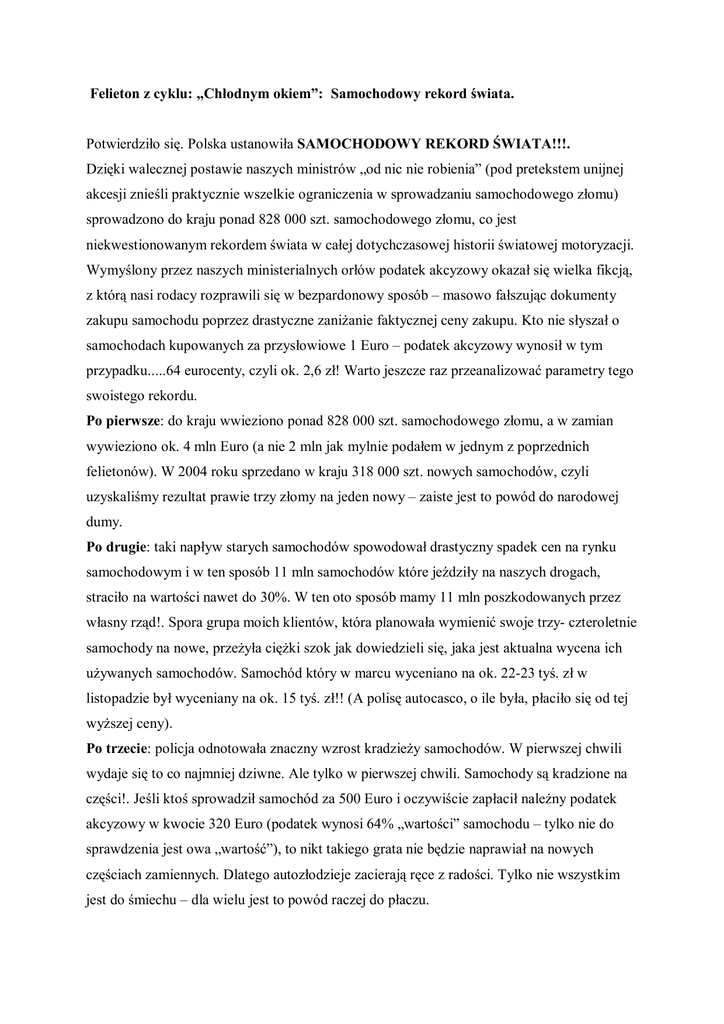 Felieton z cyklu: „Chłodnym okiem”: Samochodowy rekord świata. Potwierdziło się. Polska ustanowiła SAMOCHODOWY REKORD ŚWIATA!!!. Dzięki walecznej postawie naszych ministrów „od nic nie robienia” (pod pretekstem unijnej akcesji znieśli praktycznie wszelkie ograniczenia w sprowadzaniu samochodowego złomu) sprowadzono do kraju ponad 828 000 szt. samochodowego złomu, co jest niekwestionowanym rekordem świata w całej dotychczasowej historii światowej motoryzacji. Wymyślony przez naszych ministerialnych orłów podatek akcyzowy okazał się wielka fikcją, z którą nasi rodacy rozprawili się w bezpardonowy sposób – masowo fałszując dokumenty zakupu samochodu poprzez drastyczne zaniżanie faktycznej ceny zakupu. Kto nie słyszał o samochodach kupowanych za przysłowiowe 1 Euro – podatek akcyzowy wynosił w tym przypadku.....64 eurocenty, czyli ok. 2,6 zł! Warto jeszcze raz przeanalizować parametry tego swoistego rekordu. Po pierwsze: do kraju wwieziono ponad 828 000 szt. samochodowego złomu, a w zamian wywieziono ok. 4 mln Euro (a nie 2 mln jak mylnie podałem w jednym z poprzednich felietonów). W 2004 roku sprzedano w kraju 318 000 szt. nowych samochodów, czyli uzyskaliśmy rezultat prawie trzy złomy na jeden nowy – zaiste jest to powód do narodowej dumy. Po drugie: taki napływ starych samochodów spowodował drastyczny spadek cen na rynku samochodowym i w ten sposób 11 mln samochodów które jeździły na naszych drogach, straciło na wartości nawet do 30%. W ten oto sposób mamy 11 mln poszkodowanych przez własny rząd!. Spora grupa moich klientów, która planowała wymienić swoje trzy- czteroletnie samochody na nowe, przeżyła ciężki szok jak dowiedzieli się, jaka jest aktualna wycena ich używanych samochodów. Samochód który w marcu wyceniano na ok. 22-23 tyś. zł w listopadzie był wyceniany na ok. 15 tyś. zł!! (A polisę autocasco, o ile była, płaciło się od tej wyższej ceny). Po trzecie: policja odnotowała znaczny wzrost kradzieży samochodów. W pierwszej chwili wydaje się to co najmniej dziwne. Ale tylko w pierwszej chwili. Samochody są kradzione na części!. Jeśli ktoś sprowadził samochód za 500 Euro i oczywiście zapłacił należny podatek akcyzowy w kwocie 320 Euro (podatek wynosi 64% „wartości” samochodu – tylko nie do sprawdzenia jest owa „wartość”), to nikt takiego grata nie będzie naprawiał na nowych częściach zamiennych. Dlatego autozłodzieje zacierają ręce z radości. Tylko nie wszystkim jest do śmiechu – dla wielu jest to powód raczej do płaczu. Po czwarte: od tego roku w krajach Unii Europejskiej zaczęły obowiązywać bardzo surowe normy czystości spalin dla nowych samochodów – norma Euro IV. Każdy logicznie myślący rząd w trosce o zdrowie swoich obywateli, ekologię, finanse publiczne (koszty wypadków, odszkodowań, rent, itp.) chroni lokalny rynek przed samochodowym złomem i stara się stymulować jego prawidłowy rozwój, to znaczy maksymalnie odmładzać park samochodowy. Każdy, tylko nie nasz – bo logiki w jego działaniach nie uświadczysz. Wpuszczono do kraju armię samochodowych trucicieli, którzy jakiekolwiek normy spełniali, ale dawno temu. Emisja szkodliwych składników spalin w takim samochodzie jest kilka – kilkanaście razy wyższa od jakiejkolwiek normy. Jeszcze nigdy tak wielu nie straciło tak wiele przez tak niewielu – tak sparafrazował słynne powiedzenie Churchilla dyrektor Jacek Pawlak z Toyota Motor Poland. Jego szef, nowy prezes Toyota Motor Poland – Hiroshi Kono powiedział: załamanie się sprzedaży nowych samochodów spowodowane importem prawie miliona zużytych aut musi źle wpłynąć na rozwój gospodarczy kraju. Wszystkie kolejne rządy po 1989 r. prowadziły sinusoidalną politykę dotyczącą importu samochodów – na przemian wprowadzano ostre bariery, a następnie je znoszono ręcznie sterując rynkiem używanych samochodów. Ale dlaczego ta „sterująca ręka” okazała się ręką pijaka? Od prawej do lewej, od lewej do prawej, zamiast normalnie, prosto! Ja rozumiem, że serce mamy po lewej stronie. Ale głowa jest po środku! Światowi inwestorzy, zanim podejmą decyzję o lokowaniu inwestycji w budowę nowej fabryki samochodów, długo i dokładnie analizują rynek danego kraju. Być może mamy odpowiedź na pytanie, dlaczego największe inwestycje motoryzacyjne zaczęły omijać nasz kraj szerokim łukiem. Dyktatura laweciarzy zatrzymała rozwój krajowej motoryzacji! Ale mamy rekord świata....... Andrzej Szyjkowski – styczeń 2005 r.