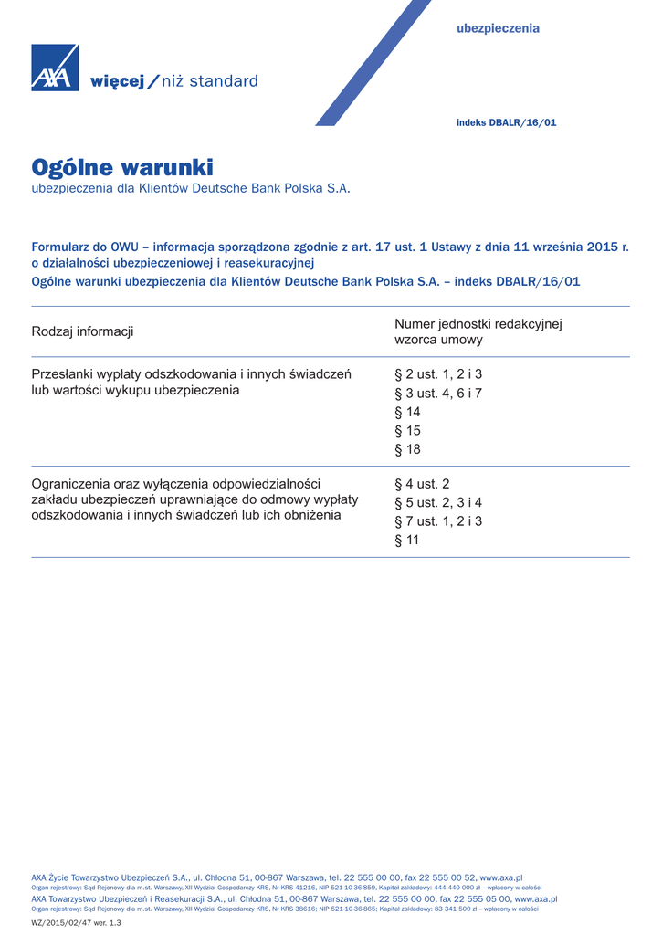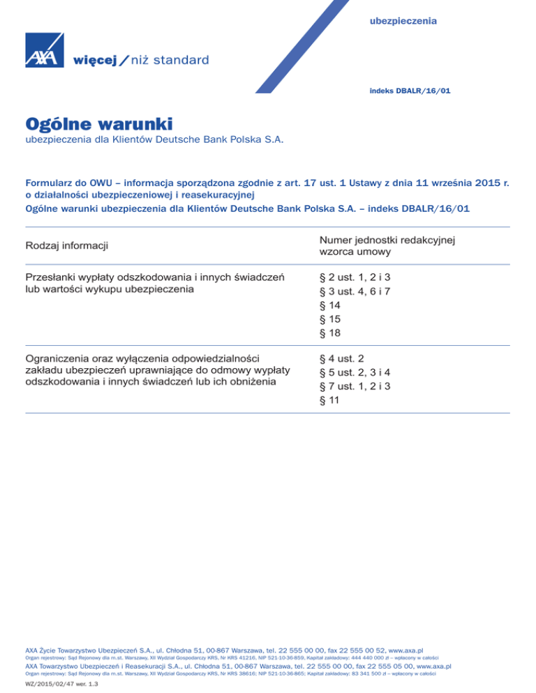 ubezpieczenia indeks DBALR/16/01 Ogólne warunki ubezpieczenia dla Klientów Deutsche Bank Polska S.A. Formularz do OWU – informacja sporządzona zgodnie z art. 17 ust. 1 Ustawy z dnia 11 września 2015 r. o działalności ubezpieczeniowej i reasekuracyjnej Ogólne warunki ubezpieczenia dla Klientów Deutsche Bank Polska S.A. – indeks DBALR/16/01 Rodzaj informacji Numer jednostki redakcyjnej wzorca umowy Przesłanki wypłaty odszkodowania i innych świadczeń lub wartości wykupu ubezpieczenia § 2 ust. 1, 2 i 3 § 3 ust. 4, 6 i 7 § 14 § 15 § 18 Ograniczenia oraz wyłączenia odpowiedzialności zakładu ubezpieczeń uprawniające do odmowy wypłaty odszkodowania i innych świadczeń lub ich obniżenia § 4 ust. 2 § 5 ust. 2, 3 i 4 § 7 ust. 1, 2 i 3 § 11 AXA Życie Towarzystwo Ubezpieczeń S.A., ul. Chłodna 51, 00-867 Warszawa, tel. 22 555 00 00, fax 22 555 00 52, www.axa.pl Organ rejestrowy: Sąd Rejonowy dla m.st. Warszawy, XII Wydział Gospodarczy KRS, Nr KRS 41216, NIP 521-10-36-859, Kapitał zakładowy: 444 440 000 zł – wpłacony w całości AXA Towarzystwo Ubezpieczeń i Reasekuracji S.A., ul. Chłodna 51, 00-867 Warszawa, tel. 22 555 00 00, fax 22 555 05 00, www.axa.pl Organ rejestrowy: Sąd Rejonowy dla m.st. Warszawy, XII Wydział Gospodarczy KRS, Nr KRS 38616; NIP 521-10-36-865; Kapitał zakładowy: 83 341 500 zł – wpłacony w całości WZ/2015/02/47 wer. 1.3 Ogólne warunki ubezpieczenia dla Klientów Deutsche Bank Polska S.A. Ogólne warunki ubezpieczenia dla Klientów Deutsche Bank Polska S.A. Rozdział I Postanowienia ogólne § 1 OWU 1. Ogólne warunki ubezpieczenia dla Klientów Deutsche Bank Polska S.A. – indeks DBALR/16/01 („OWU”) stosuje się do Umów ubezpieczenia zawieranych z Towarzystwami. 2. OWU wraz z dokumentami w nich wskazanymi kształtują treść Umowy ubezpieczenia, w szczególności prawa i obowiązki stron Umowy ubezpieczenia (Towarzystw i Ubezpieczającego), jak również Ubezpieczonego, Uposażonego i innych uprawnionych z Umowy ubezpieczenia. 3. AXA Życie Towarzystwo Ubezpieczeń Spółka Akcyjna udziela ochrony ubezpieczeniowej w zakresie następujących ryzyk: śmierć, śmierć w wyniku nieszczęśliwego wypadku, śmierć w wyniku wypadku komunikacyjnego, inwalidztwo oraz pobyt w szpitalu w wyniku nieszczęśliwego wypadku oraz Medical Assistance zgodnie z Regulaminem usług Medical Assistance. 4. AXA Towarzystwo Ubezpieczeń i Reasekuracji Spółka Akcyjna udziela ochrony ubezpieczeniowej w zakresie następujących ryzyk: kradzież pojazdu, szkoda całkowita, kradzież z włamaniem, utrata pracy oraz zdarzenia assistance zgodnie z Regulaminem usług Home Assistance. Rozdział II Przedmiot i zakres ubezpieczenia § 2 Przedmiot i zakres ubezpieczenia 1. Przedmiotem ubezpieczenia jest życie i zdrowie Ubezpieczonego Głównego, Współubezpieczonego, Współmałżonka, Rodzica i Teścia oraz mienie Ubezpieczonego Głównego. 2. Zakres ubezpieczenia – w zależności od wybranego pakietu i wariantu ubezpieczenia – może obejmować następujące zdarzenia ubezpieczeniowe, mające miejsce w okresie udzielania przez Towarzystwa ochrony ubezpieczeniowej: I. w pakiecie All Risk: 1) kradzież pojazdu lub szkodę całkowitą w pojeździe należącym do Ubezpieczonego Głównego oraz 2) kradzież z włamaniem do mieszkania lub domu będącego włas nością Ubezpieczonego Głównego, oraz 3) śmierć z każdej przyczyny Ubezpieczonego Głównego lub Współ ubezpieczonego, oraz 4) śmierć Współmałżonka Ubezpieczonego Głównego lub Współ ubezpieczonego w wyniku nieszczęśliwego wypadku, oraz 5) śmierć Rodzica Ubezpieczonego Głównego lub Współubezpie czonego w wyniku nieszczęśliwego wypadku, oraz 6) śmierć Teścia Ubezpieczonego Głównego lub Współ ubez pie czonego w wyniku nieszczęśliwego wypadku, oraz 7) w zależności od statusu zatrudnienia Ubezpieczonego Głównego lub Współubezpieczonego: a) utratę pracy Ubezpieczonego Głównego lub Współubezpie czonego – dla osób zatrudnionych u jednego pracodawcy przez okres co najmniej 12 miesięcy przed rozwiązaniem stosunku pracy na podstawie umowy o pracę zawartej na czas określony oraz osób zatrudnionych u jednego pracodawcy na czas nieokreślony, względem których w terminie 30 dni od daty zawarcia Umowy ubezpieczenia nie rozpoczął biegu okres wypowiedzenia umowy o pracę, albo b) pobyt w szpitalu Ubezpieczonego Głównego lub Współubez pieczonego w wyniku nieszczęśliwego wypadku – dla osób, które nie spełniają warunku objęcia ochroną ubezpieczeniową w zakresie wymienionym w lit. a), oraz osób, które przestaną spełniać warunki objęcia ochroną ubezpieczeniową w zakresie wymienionym w lit. a) po upływie 30 dni wskazanych w tym punkcie; II. w pakiecie NNW: 1) śmierć Ubezpieczonego Głównego lub Współubezpieczonego, oraz 2) śmierć Ubezpieczonego Głównego lub Współubezpieczonego w wyniku nieszczęśliwego wypadku, oraz 3) śmierć Ubezpieczonego Głównego lub Współubezpieczonego w wyniku wypadku komunikacyjnego, oraz 4) inwalidztwo Ubezpieczonego Głównego lub Współubezpieczo nego w wyniku nieszczęśliwego wypadku. III. w pakiecie All Risk plus NNW zakres ubezpieczenia obejmuje zakres ubezpieczenia określony dla pakietu All Risk w pkt I oraz określony dla pakietu NNW w pkt II. 3. Pomoc z tytułu zdarzeń assistance, której zakres określony jest odpowiednio w Regulaminie usług Medical Assistance i Regulaminie usług Home Assistance, udzielana jest w ramach wybranych wariantów ubezpieczenia wskazanych w tabeli nr 1. Rozdział III Zawarcie i rozwiązanie Umowy ubezpieczenia oraz czas trwania odpowiedzialności Towarzystw § 3 Zawarcie Umowy ubezpieczenia 1. Umowa ubezpieczenia jest zawarta na okres udzielania ochrony ubezpieczeniowej zależny od wariantu, określony w tabeli nr 1, zgodnie z wyborem dokonanym przez Ubezpieczającego w chwili zawarcia Umowy ubezpieczenia, z zastrzeżeniem że nie można zmienić te