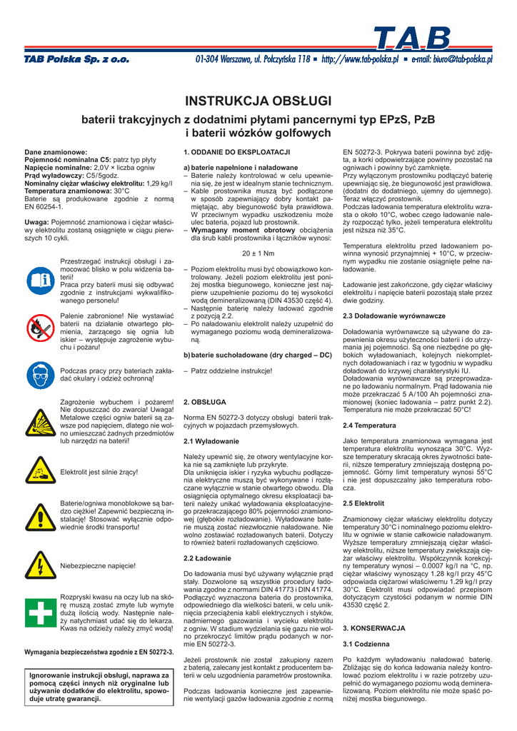 INSTRUKCJA OBSŁUGI baterii trakcyjnych z dodatnimi płytami pancernymi typ EPzS, PzB i baterii wózków golfowych Dane znamionowe: Pojemność nominalna C5: patrz typ płyty Napięcie nominalne: 2,0 V × liczba ogniw Prąd wyładowczy: C5 / 5godz. Nominalny ciężar właściwy elektrolitu: 1,29 kg / l Temperatura znamionowa: 30°C Baterie są produkowane zgodnie z normą EN 60254-1. Uwaga: Pojemność znamionowa i ciężar właściwy elektrolitu zostaną osiągnięte w ciągu pierwszych 10 cykli. 1. ODDANIE DO EKSPLOATACJI a) baterie napełnione i naładowane – Baterie należy kontrolować w celu upewnienia się, że jest w idealnym stanie technicznym. – Kable prostownika muszą być podłączone w sposób zapewniający dobry kontakt pamiętając, aby biegunowość była prawidłowa. W przeciwnym wypadku uszkodzeniu może ulec bateria, pojazd lub prostownik. – Wymagany moment obrotowy obciążenia dla śrub kabli prostownika i łączników wynosi: 20 ± 1 Nm Przestrzegać instrukcji obsługi i zamocować blisko w polu widzenia baterii! Praca przy baterii musi się odbywać zgodnie z instrukcjami wykwaliÞkowanego personelu! Palenie zabronione! Nie wystawiać baterii na działanie otwartego płomienia, żarzącego się ognia lub iskier – występuje zagrożenie wybuchu i pożaru! – Poziom elektrolitu musi być obowiązkowo kontrolowany. Jeżeli poziom elektrolitu jest poniżej mostka biegunowego, konieczne jest najpierw uzupełnienie poziomu do tej wysokości wodą demineralizowaną (DIN 43530 część 4). – Następnie baterię należy ładować zgodnie z pozycją 2.2. – Po naładowaniu elektrolit należy uzupełnić do wymaganego poziomu wodą demineralizowaną. b) baterie suchoładowane (dry charged – DC) Podczas pracy przy bateriach zakładać okulary i odzież ochronną! – Patrz oddzielne instrukcje! Zagrożenie wybuchem i pożarem! Nie dopuszczać do zwarcia! Uwaga! Metalowe części ogniw baterii są zawsze pod napięciem, dlatego nie wolno umieszczać żadnych przedmiotów lub narzędzi na baterii! 2. OBSŁUGA Elektrolit jest silnie żrący! Baterie / ogniwa monoblokowe są bardzo ciężkie! Zapewnić bezpieczną instalację! Stosować wyłącznie odpowiednie środki transportu! Niebezpieczne napięcie! Rozpryski kwasu na oczy lub na skórę muszą zostać zmyte lub wymyte dużą ilością wody. Następnie należy natychmiast udać się do lekarza. Kwas na odzieży należy zmyć wodą! Wymagania bezpieczeństwa zgodnie z EN 50272-3. Ignorowanie instrukcji obsługi, naprawa za pomocą części innych niż oryginalne lub używanie dodatków do elektrolitu, spowoduje utratę gwarancji. Norma EN 50272-3 dotyczy obsługi baterii trakcyjnych w pojazdach przemysłowych. 2.1 Wyładowanie Należy upewnić się, że otwory wentylacyjne korka nie są zamknięte lub przykryte. Dla uniknięcia iskier i ryzyka wybuchu podłączenia elektryczne muszą być wykonywane i rozłączane wyłącznie w stanie otwartego obwodu. Dla osiągnięcia optymalnego okresu eksploatacji baterii należy unikać wyładowania eksploatacyjnego przekraczającego 80% pojemności znamionowej (głębokie rozładowanie). Wyładowane baterie muszą zostać niezwłocznie naładowane. Nie wolno zostawiać rozładowanych baterii. Dotyczy to również baterii rozładowanych częściowo. 2.2 Ładowanie Do ładowania musi być używany wyłącznie prąd stały. Dozwolone są wszystkie procedury ładowania zgodne z normami DIN 41773 i DIN 41774. Podłączyć wyznaczona bateria do prostownika, odpowiedniego dla wielkości baterii, w celu uniknięcia przeciążenia kabli elektrycznych i styków, nadmiernego gazowania i wycieku elektrolitu z ogniw. W stadium wydzielania się gazu nie wolno przekroczyć limitów prądu podanych w normie EN 50272-3. Jeżeli prostownik nie został zakupiony razem z baterią, zalecany jest kontakt z producentem baterii w celu uzgodnienia parametrów prostownika. Podczas ładowania konieczne jest zapewnienie wentylacji gazów ładowania zgodnie z normą EN 50272-3. Pokrywa baterii powinna być zdjęta, a korki odpowietrzające powinny pozostać na ogniwach i powinny być zamknięte. Przy wyłączonym prostowniku podłączyć baterię upewniając się, że biegunowość jest prawidłowa. (dodatni do dodatniego, ujemny do ujemnego). Teraz włączyć prostownik. Podczas ładowania temperatura elektrolitu wzrasta o około 10°C, wobec czego ładowanie należy rozpocząć tylko, jeżeli temperatura elektrolitu jest niższa niż 35°C. Temperatura elektrolitu przed ładowaniem powinna wynosić przynajmniej + 10°C, w przeciwnym wypadku nie zostanie osiągnięte pełne naładowanie. Ładowanie jest zakończone, gdy ciężar właściwy elektrolitu i napięcie baterii pozostają stałe przez dwie godziny. 2.3 Doładowanie wyrównawcze Doładowania wyrównawcze są używane do zapewnienia okresu użyteczności baterii i do utrzymania jej pojemności. Są one niezbędne po głębokich wyładowaniach, kolejnych niekompletnych doładowaniach i raz w tygodniu w wypadku doładowań do krzywej charakterystyki IU. Doładowania wyrównawcze są przeprowadzane po ładowaniu normalnym. Prąd ładowania nie może przekraczać 5 A / 100 Ah pojemności znamionowej (koniec ładowania – patrz punkt 2.2). Temperatura nie może przekraczać 50°C! 2.4 Temperatura Jako temperatura znamionowa wymagana jest temperatura elektrolitu wynosząca 30°C. Wyższe temperatury skracają okres żywotności baterii, niższe temperatury zmniejszają dostępną pojemność. Górny limit temperatury wynosi 55°C i nie jest dopuszczalny jako temperatura robocza. 2.5 Elektrolit Znamionowy ciężar właściwy elektrolitu dotyczy temperatury 30°C i nominalnego poziomu elektrolitu w ogniwie w stanie całkowicie naładowanym. Wyższe temperatury zmniejszają ciężar właściwy elektrolitu, niższe temperatury zwiększają ciężar właściwy elektrolitu. Współczynnik korekcyjny temperatury wynosi – 0.0007 kg / l na °C, np. cię