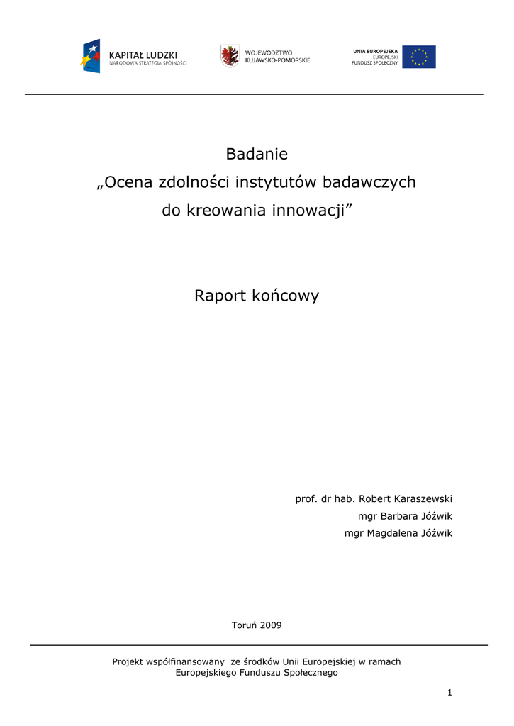 Badanie „Ocena zdolności instytutów badawczych do kreowania innowacji” Raport końcowy prof. dr hab. Robert Karaszewski mgr Barbara Jóźwik mgr Magdalena Jóźwik Toruń 2009 Projekt współfinansowany ze środków Unii Europejskiej w ramach Europejskiego Funduszu Społecznego 1 Spis treści I. Wprowadzenie .................................................................................... 4 I.1. Cele badania ....................................................................................... 5 I.2. Badana populacja ................................................................................ 5 I.3. Źródła informacji ............................................................................... 12 II. Analiza wyników ............................................................................. 15 II.1. Potencjał kadrowy ............................................................................ 16 II.1.1. Struktura zatrudnienia ................................................................... 15 II.1. 2. Członkowstwo w organizacjach naukowych i międzynarodowe doświadczenie ................................................................................. 22 II.1.3. Perspektywy rozwojowe ................................................................. 24 II.1.4. Stopień implementacji rozwiązań ułatwiających pracę ........................ 26 II.1.5. Posiadanie wdrożonych rozwiązań promujących zaangażowanie pracowników w prace B+R oraz wspierających tworzenie spółek typu spinoff ................................................................................................. 27 II.2. Stan infrastruktury naukowo – badawczej ........................................... 28 II.2.1. Dostęp do Internetu ....................................................................... 28 II.2.2. Nakłady na zakup infrastruktury naukowo-badawczej ........................ 29 II.2.3. Specjalne urządzenia badawcze (SPUB), akredytowane laboratoria badawcze, aparatura badawczo-naukowa wysokiej wartości .................. 32 II.3. Dziedziny zaangażowania w praktykę społeczną i gospodarczą ............... 34 II.3.1. Udział w sieciach naukowych oraz konsorcjach naukowo-przemysłowych ...................................................................................................... 38 II.3.2. Współpraca z agencjami rządowymi i organizacjami pozarządowymi oraz przedsiębiorstwami .......................................................................... 39 II.3.3. Tworzenie oferty i formy współpracy z instytucjami otoczenia społecznogospodarczego ................................................................................ 41 II.3.4. Patenty oraz wartość świadczonych usług ......................................... 46 Projekt współfinansowany ze środków Unii Europejskiej w ramach Europejskiego Funduszu Społecznego 2 II.3.5. Najważniejsze osiągnięcia ............................................................... 49 III A. Streszczenie, wnioski i rekomendacje ........................................ 50 III B. Summary, conclusions and recommendations ............................. 52 IV. Aneks .............................................................................................. 53 Projekt współfinansowany ze środków Unii Europejskiej w ramach Europejskiego Funduszu Społecznego 3 I. Wprowadzenie Niniejszy raport końcowy został sporządzony w 6 jednobrzmiących egzemplarzach i przekazany Zamawiającemu zarówno w formie papierowej, jak i elektronicznej. Przedmiotem badania w ramach „Oceny zdolności instytutów badawczych do kreowania innowacji” był potencjał kadrowo – infrastrukturalny jednostek sektora badawczo – rozwojowego województwa kujawsko-pomorskiego w kontekście określenia możliwości innowacyjnego oddziaływania na otoczenie, zwłaszcza na gospodarkę. Celowość realizacji badania wynika z zapisów Regionalnej Strategii Innowacji Województwa Kujawsko-Pomorskiego do 2015 roku (Załącznik do Uchwały Nr XLI/587/05 Zarządu Województwa KujawskoPomorskiego, Toruń 2004) oraz Strategii Rozwoju Województwa KujawskoPomorskiego na lata 2007 – 2020 (Załącznik do Uchwały Nr XLI/586/05 Sejmiku Województwa Kujawsko-Pomorskiego, Toruń 2005, ss. 26-28). W szczególności są to zapisy RSI określające podstawowe wskaźniki jej realizacji, zwłaszcza w odniesieniu do priorytetu 2 (Regionalna Strategia Innowacji Województwa Kujawsko-Pomorskiego do 2015 roku, s. 61). Przy wykonywaniu „Oceny…” wykorzystano dotychczasowe doświadczenia członków zespołu badawczego w realizacji badań naukowych. Przy ustalaniu szczegółowej metodyki prac oraz ich zakresu uwzględnione zostały wymogi postawione tej „Ocenie…” przez Zamawiającego, a przedstawione w Załączniku do umowy na wykonanie „Oceny…” oraz zasady oceny parametrycznej jednostek naukowych zawarte w Rozporządzeniu Ministra Nauki i Szkolnictwa Wyższego z dnia 17 października 2007 r. w sprawie kryteriów i trybu przyznawania i rozliczania środków finansowych na działalność statutową (Dz. U. z 2007 r. Nr 205, poz. 1489). Projekt współfinansowany ze środków Unii Europejskiej w ramach Europejskiego Funduszu Społecznego 4 I.1. Cele badania 1. Cel główny: jednostek sektora rozpoznanie potencjału badawczo – kadrowo rozwojowego – infrastrukturalnego województwa kujawsko- pomorskiego w kontekście określenia możliwości innowacyjnego oddziaływania na otoczenie, zwłaszcza na gospodarkę. 2. Cele szczegółowe: 1) identyfikacja dziedzin praktyki społecznej i gospodarczej, w których zaangażowane są jednostki sektora badawczo – rozwojowego województwa kujawsko-pomorskiego, 2) analiza zasobów ludzkich w jednostkach sektora badawczo – rozwojowego województwa kujawsko-pomorskiego ze względu na ich strukturę, poziom kwalifikacji naukowych, doświadczenie w międzynarodowych zespołach badawczych oraz perspektywy rozwojo