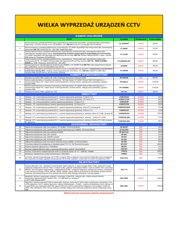WIELKA WYPRZEDAŻ URZĄDZEŃ CCTV KAMERY KOLOROWE OPIS 1 2 3 4 5 6 Kamera kolorowa z przesłoną elektroniczną i automatyczną, przetwornik CCD SONY, funkcja back light, automatyczny balans bieli, V.D./D.D; wymiary w mm 132.2x68x51; 1/3”; 420 linii; 0,01lx/F1.2 (LowLight); DC12V/AC24V Kamera kolorowa z przesłoną elektroniczną i automatyczną 1/3" SONY SuperHAD CCD funkcja back light, automatyczny balans bieli 520 TVL AC24V/DC12V , 90V-260V Digital Day Night Kamera dzienno-nocna z przesłoną elektroniczną i automatyczną, funkcja back light, automatyczny balans bieli, automatyczna regulacja wzmocnienia, przechwytywanie numerów rejestracyjnych przejeżdżających samochodów, 1/3" SONY SuperHAD CCD Day Night with Mechanical IR Cut Filter 540 TVL Camera ,Manual Shutter 7 steps, Linelock , DNR sense up, Flickerless AC24V/DC12V Kamera dzienno-nocna z przesłoną elektroniczną i automatyczną , funkcja back light, automatyczny balans bieli, mechaniczny filtr IR, 1/3" SONY CCD Day Night with Mechanical IR Cut Filter Camera 540 TVL , WIDE DYNAMIC RANGE LL, DNR, Flickerless AC24V/DC12V , 90V-260V Kamera kolorowa w wandaloodpornej obudowie typu DOMED, 1/3" SHARP CCD 480 TVL Color Vandal Dome Camera with VARIFOCAL 3.5~9.5 mm(Standard) Lens DC12V Zintegrowany zewnętrzny punkt kamerowy dzienno-nocny w wandaloodpornej obudowie z wbudowanym promiennikiem podczerwieni (zasięg 20m), obiektyw zmiennoogniskowy DC 3.8-9.5mm, 1/3", 540 linii; 0.05lx/F1.4; DSP, BLC, obudowa IP66,uchwyt ścienny, DC12V/AC24V (420mA) Symbol Producent Cena netto CL-PH6660P FINEST 160,00 CT-8880P FINEST 210,00 CT-L938H FINEST 390,00 CT-WD990H-ICR FINEST 590,00 2V480SP FINEST 325,00 YV-VIR540 FINEST 540,00 KAMERY SZYBKOOBROTOWE 7 8 9 10 Klawiatura do kamer SAE, joystick 3D, LCD, (możliwość sterowania matrycami SAE) Kamera szybkoobrotowa w obudowie zewnętrznej, 18X High Speed 1/4” SONY EXview HAD CCD dzień/noc z mechanicznym filtrem IR, 7 alarm inputs, 8 stref prywatności, Linelock AC24V, obsługa wielu protokołów i języków, obudowa IP66 Kamera szybkoobrotowa w obudowie zewnętrznej, 26X High Speed 1/4” SONY EXview HAD CCD dzień/noc z mechanicznym filtrem IR, 7 alarm inputs, 8 stref prywatności, Linelock AC24V, obsługa wielu protokołów i języków, obudowa IP66 Klawiatura do kamer FINE, joystick 3D, LCD DR-KB03M SAE 934,00 EP-Q601A FINEST 2 100,00 SP-1029WQ FINEST 2 430,00 CK-104 FINEST 750,00 OBIEKTYWY 11 Obiektyw 1/3" z automatyczną przesłoną D.C. i ręcznie regulowaną ogniskową 3.5-8mm F1.2 AVM358VAD AVEMIA 36,00 12 Obiektyw 1/3" z automatyczną przesłoną D.C. i ręcznie regulowaną ogniskową 2.8-12mm F1.4 AVM2812VAD AVEMIA 56,00 13 Obiektyw 1/3" z ręczną przesłoną i ręcznie regulowaną ogniskową 3.5-8mm F1.2 AVM358VM AVEMIA 22,00 14 Obiektyw 1/3" z ręczną przesłoną i ręcznie regulowaną ogniskową 2.8-12mm F1.4 AVM2812VM AVEMIA 32,00 15 Obiektyw 1/3" z automatyczną przesłoną D.C. i ręcznie regulowaną ogniskową 3-8mm F1.0 korekcja IR AVM0308VADIR AVEMIA 47,00 16 Obiektyw 1/3" z automatyczną przesłoną D.C. i ręcznie regulowaną ogniskową 6-60mm F1.6 AVM660VAD AVEMIA 74,00 17 Obiektyw 1/3" z automatyczną przesłoną D.C., z ręcznie regulowaną ogniskową w zakresie 3-8mm F1.2-360, korekcja IR TVSD0308-IRJ AVENIR 126,00 18 Obiektyw 1/3" z automatyczną przesłoną D.C., z ręcznie regulowaną ogniskową w zakresie 3.5-8mm F1.4-360 TVSD0358-2MJ AVENIR 77,00 19 Obiektyw 1/3" z automatyczną przesłoną D.C., z ręcznie regulowaną ogniskową w zakresie 3.5-8mm F1.0-360, korekcja IR, aspherical TVSD0358-5IRJ AVENIR 89,00 ODGROMNIKI, SEPARATORY 20 Odgromnik przepięciowy wizji oraz zasilania 12V (2xBNC, 2xTerminal Block) SP-001VP S&C 52,00 21 Odgromnik przepięciowy wizji, zasilania oraz danych telemetrycznych (2xBNC, 2xTerminal Block) SP-001VPD S&C 64,00 22 Odgromnik przepięciowy wizji oraz zasilania AC230V SP-001P-AC S&C 40,50 23 Odgromnik przepięciowy wizji, 2xF conector SP-002 S&C 27,00 24 Odgromnik przepięciowy wizji, 2xRJ45 conector SP-003 S&C 30,00 25 Odgromnik przepięciowy wizji, 2xTerminal conector SP-004 S&C 29,00 26 Odgromnik przepięciowy wizji oraz danych telemetrycznych (2xBNC, 2xTerminal Block) SP-005 S&C 43,00 27 16-portowy odgromnik przepięciowy w obudowie panel1 19" 1U, 16x Terminal Connector SP-016T S&C 450,00 28 Pasywny separator galwaniczny z VideoBalun GB-001 S&C 31,00 29 Pasywny nadajnik/odbiornik wideo z separacją galwaniczną, wyjście Terminal Block TGP-001 S&C 43,00 30 Pasywny 16-kanałowy nadajnik/odbiornik wideo w obudowie panela 19" 1U - 16xRJ45, 16XBNC TPP016 S&C 450,00 31 Dodatkowe zabezpieczenie przed interferencjami Video Balun 32 Konwerter sygnału kompozytowego lub S-VHS na sygnał VGA (urządzenie może pracować także jako ręczny przełącznik dwu wejściowy pomiędzy sygnałem kompozytowym lub S-VHS i sygnałem z karty VGA na monitor komputerowy CRT) TVB001 S&C 11,00 VideoView S&C 133,00 AVC-715 AVTECH 670,00 HDV-H608 FINEST 700,00 SRH-2008 FINEST 780,00 REJESTRATORY 33 34 35 Cyfrowy rejestrator wizji - pentaplex, 8 przelotowych wejść wizyjnych, 2 wyjście wizyjne (Main i Call), wyjście D/V (opcja: możliwość podłączenia monitora VGA), 4 wejścia audio, szybkość odświeżania 200kl/s, zapis do 200kl/s (CIF), kompresja MPEG4, dwa wewnętrzne dyski twarde + nagrywarka DVD-RW, możliwość dołączenia zewnętrznej macierzy, wbudowany moduł sieciowy (protokoły TCP/IP, PPPOE, DHCP i DDNS), złącze USB do archiwizacji lub aktualizacji oprogramowania, możliwość sterowania kamerami PTZ (protokół PELCO-D), pilot zdalnego sterowania, cena bez dysków Rejestrator cyfrowy 8 wejść/wyjść wizyjnych, kompresja H.264 DVR , obsługa LAN + zdalny program kliencki, wbudowana nagrywarka DVD i wyjście VGA, 2.0 USB Back Up, obsługa 2 x SATA HDD Support 3GPP Rejestrator cyfrowy kompresja H.264 8 wejść/wyjść wizyjnych, kompresja H.264 8 wejść rozdzielczość wyświetlania: 704 x 576 nagrywanie: full D1 wejście alarmowe / 
