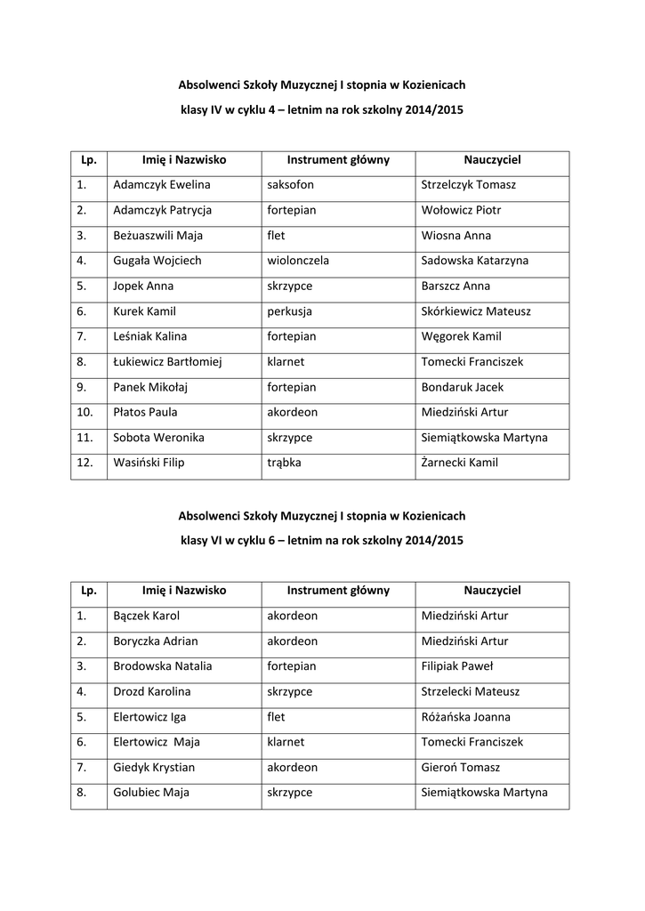 Absolwenci Szkoły Muzycznej I stopnia w Kozienicach klasy IV w cyklu 4 – letnim na rok szkolny 2014/2015 Lp. Imię i Nazwisko Instrument główny Nauczyciel 1. Adamczyk Ewelina saksofon Strzelczyk Tomasz 2. Adamczyk Patrycja fortepian Wołowicz Piotr 3. Beżuaszwili Maja flet Wiosna Anna 4. Gugała Wojciech wiolonczela Sadowska Katarzyna 5. Jopek Anna skrzypce Barszcz Anna 6. Kurek Kamil perkusja Skórkiewicz Mateusz 7. Leśniak Kalina fortepian Węgorek Kamil 8. Łukiewicz Bartłomiej klarnet Tomecki Franciszek 9. Panek Mikołaj fortepian Bondaruk Jacek 10. Płatos Paula akordeon Miedziński Artur 11. Sobota Weronika skrzypce Siemiątkowska Martyna 12. Wasiński Filip trąbka Żarnecki Kamil Absolwenci Szkoły Muzycznej I stopnia w Kozienicach klasy VI w cyklu 6 – letnim na rok szkolny 2014/2015 Lp. Imię i Nazwisko Instrument główny Nauczyciel 1. Bączek Karol akordeon Miedziński Artur 2. Boryczka Adrian akordeon Miedziński Artur 3. Brodowska Natalia fortepian Filipiak Paweł 4. Drozd Karolina skrzypce Strzelecki Mateusz 5. Elertowicz Iga flet Różańska Joanna 6. Elertowicz Maja klarnet Tomecki Franciszek 7. Giedyk Krystian akordeon Gieroń Tomasz 8. Golubiec Maja skrzypce Siemiątkowska Martyna 9. Gołda Edyta wiolonczela Sadowska Katarzyna 10. Jabłoński Miłosz fortepian Filipiak Paweł 11. Jakubowska Natalia wiolonczela Sadowska Katarzyna 12. Janeczek Natalia klarnet Tomecki Franciszek 13. Kania Barbara skrzypce Gocel Anna 14. Karaś Nikola skrzypce Gocel Anna 15. Kłos Katarzyna skrzypce Gocel Anna 16. Kopciał Jakub flet Wiosna Anna 17. Krześniak Natalia fortepian Filipiak Paweł 18. Luśtyk Zuzanna flet Różańska Joanna 19. Łepik Zuzanna skrzypce Gocel Anna 20. Mańka Klaudia klarnet Tomecki Franciszek 21. Markowski Jan akordeon Miedziński Artur 22. Mierzejewska Aleksandra wiolonczela Sadowska Katarzyna 23. Miżejewska Lena flet Wiosna Anna 24. Olewińska Jagoda fortepian Garbalska Karolina 25. Pastuszko Michalina flet Różańska Joanna 26. Pawelec Julia fortepian Filipiak Paweł 27. Pawluczuk Szymon akordeon Miedziński Artur 28. Ptaszek Bartosz akordeon Miedziński Artur 29. Seremak Natalia skrzypce Gocel Anna 30. Seremak Szymon akordeon Gieroń Tomasz 31. Sochaj Olga fortepian Filipiak Paweł 32. Szymanowski Ignacy klarnet Tomecki Franciszek 33. Szymański Jakub trąbka Żarnecki Kamil 34. Świstowski Jakub wiolonczela Sadowska Katarzyna 35. Zdżalik Antonina fortepian Węgorek Kamil 36. Zdżalik Zuzanna flet Różańska Joanna 37. Ziobro Andżelika wiolonczela Sadowska Katarzyna