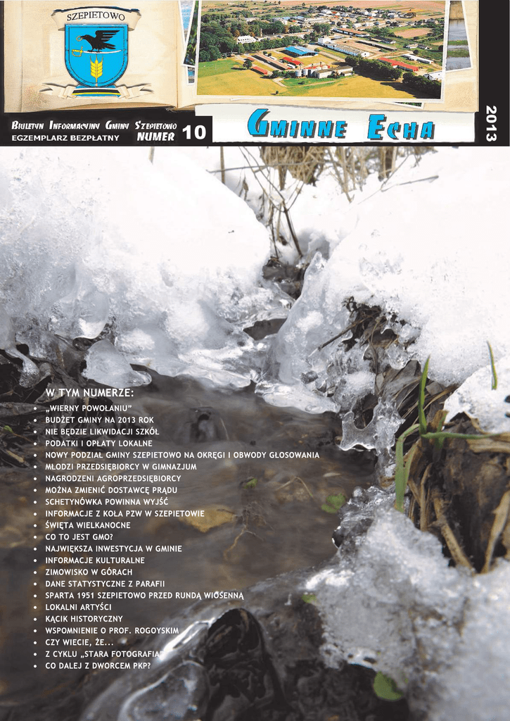 W TYM NUMERZE: „WIERNY POWOŁANIU” BUDŻET GMINY NA 2013 ROK NIE BĘDZIE LIKWIDACJI SZKÓŁ PODATKI I OPŁATY LOKALNE NOWY PODZIAŁ GMINY SZEPIETOWO NA OKRĘGI I OBWODY GŁOSOWANIA MŁODZI PRZEDSIĘBIORCY W GIMNAZJUM NAGRODZENI AGROPRZEDSIĘBIORCY MOŻNA ZMIENIĆ DOSTAWCĘ PRĄDU SCHETYNÓWKA POWINNA WYJŚĆ INFORMACJE Z KOŁA PZW W SZEPIETOWIE ŚWIĘTA WIELKANOCNE CO TO JEST GMO? NAJWIĘKSZA INWESTYCJA W GMINIE INFORMACJE KULTURALNE ZIMOWISKO W GÓRACH DANE STATYSTYCZNE Z PARAFII SPARTA 1951 SZEPIETOWO PRZED RUNDĄ WIOSENNĄ LOKALNI ARTYŚCI KĄCIK HISTORYCZNY WSPOMNIENIE O PROF. ROGOYSKIM CZY WIECIE, ŻE... Z CYKLU „STARA FOTOGRAFIA” CO DALEJ Z DWORCEM PKP? 2013 10 GMINNE ECHA Pełnych spokoju i radości Świąt Wielkanocnych, wielu pięknych chwil, serdecznych spotkań rodzinnych, odpoczynku oraz optymizmu i nadziei na lepszą przyszłość wszystkim mieszkańcom Miasta i Gminy Szepietowo życzą Stanisław Roch Wyszyński Burmistrz Szepietowa, Witold Moczydłowski Przewodniczący Rady Miejskiej w Szepietowie oraz Redakcja Gminnych Ech 2 „Wierny powołaniu…” GMINNE ECHA Dnia 30 sierpnia 2004 roku, na mocy dekretu ks. biskupa Stanisława Stefanka, proboszczem Parafii Szepietowo został mianowany ks. Kanonik Antoni Bardłowski, który przybył do nas z Parafii Baranowo z Dekanatu Kadzidlańskiego. Staraniem ks. Bardłowskiego w czasie Jego posługi w parafii p.w. NMP Matki Miłosierdzia dokonano następujących inwestycji: zbudowano w kościele drewniany ołtarz główny z polichromią i złoceniami, marmurowe: ołtarz soborowy, lektorium, chrzcielnicę, postument pod figurę Matki Bożej Fatimskiej, ołtarze boczne Miłosierdzia Bożego i Św. Maksymiliana, kupiono nowe tabernakulum, wykonano wewnętrzne i zewnętrzne nagłośnienie oraz zakupiono rzutnik cyfrowy, dokonano modernizacji i naprawy napędu dzwonów kościelnych oraz zamontowano komputer kościelny, sprawiono pięć nowych feretronów, jedną chorągiew, zainstalowano promienniki grzewcze na chórze i w zakrystii, reflektory na prezbiterium i w kaplicy Miłosierdzia Bożego, szopka bożonarodzeniowa wzbogaciła się o nowe, duże figury, ocieplono strop kościoła, odnowiono i pozłocono ołtarz bł. Jerzego Popiełuszki, przed kościołem zbudowano pomnik bł. Jana Pawła II oraz granitowe schody przed frontem (świątyni), ustawiono trzy granitowe obeliski przy Dębach Pamięci, odnowiono i pomalowano Kalwarię na frontonie świątyni, oczyszczono i pomalowano przęsła ogrodzenia przy kościele, sprawiono 3 kielichy, 20 ornatów, komże kapłańskie, alby, pelerynki do procesji, kilka kompletów obrusów ołtarzowych, zabezpieczono i pomalowano dach na kościele oraz dokonano wymiany rynien i rur spustowych, wykonano remont wewnątrz plebanii, wymieniono piec CO, grzejniki, drzwi zewnętrzne z zabezpieczeniem antywłamaniowym i alarmem, wybudowano parking dla samochodów przed cmentarzem grzebalnym, dokończono asfaltowanie alejek naszej nekropolii, ustawiono nowe krzyże: Misyjny przy kościele i na cmentarzu. Są to główne prace, które przy konstruktywnej współ- pracy z życzliwymi parafianami udało się zrealizować dla wspólnego dobra naszej parafii. (dane wg protokołu przekazania parafii) Przez cały czas swojej posługi kapłańskiej ks. Antoni Bardłowski nie tylko dbał o sprawy materialne, wystrój świątyni i jej otoczenia, ale przede wszystkim zabiegał o stworzenie Kościoła Duchowego. Przywiązywał dużą wagę do kształtowania właściwej postawy religijnej i patriotycznej. Swoim rozmodleniem skłaniał wiernych do modlitewnego zawierzenia Bogu i Matce Najświętszej. Ks. Dziekan był inicjatorem oraz duchowym opiekunem Punktu Wypożyczania Książki Katolickiej, Koła Rodziny Radia Maryja, Parafialnego Zespołu Caritas oraz Wspólnoty dla Intronizacji Najświętszego Serca Pana Jezusa. Zasługą księdza Proboszcza były piękne nabożeństwa, adoracje i czuwania modlitewne. Wprowadzona nowenna do Matki Bożej Nieustającej Pomocy w każdą środę gromadziła jej czcicieli, a w każdą pierwszą niedzielę miesiąca odbywały się w naszej świątyni modlitewne spotkania Kół Żywego Różańca. Wprowadzona została w naszym kościele modlitwa do Św. Michała Archanioła odmawiana po każdej Mszy Świętej. Do tradycji zapoczątkowanych przez ks. Proboszcza w naszej parafii należą: uroczystości patriotyczne, koncerty kolęd, występy jasełek. Dużym przeżyciem duchowym dla wiernych były organizowane przez duszpasterza pielgrzymki do Włoch, Wilna i polskich sanktuariów maryjnych. Zapamiętamy go jako dobrego człowieka i gospodarza, księdza wiernego swemu powołaniu i poglądom. Dbającego o rozwój kultury religijnej i sakralnej, propagującego nabożne uczestnictwo w obrzędach Mszy Świętej. Ksiądz Antoni został mianowany proboszczem parafii p.w. św. Anny w Różanie. Życzymy wszelkich łask od Boga na dalsze lata posługi kapłańskiej, a w nowej parafii życzliwego wsparcia społeczności parafialnej. Od 1 marca 2013 roku w naszej parafii funkcję proboszcza będzie pełnił Ks. kanonik Stanisław Szymborski pochodzący z parafii Nowe Piekuty. W ostatnich latach był proboszczem w parafii p.w. Trójcy Przenajświętszej w Tykocinie. Serdecznie witamy Księdza w naszej społeczności i życzymy opieki Matki Najświętszej w pracy duszpasterskiej w naszej parafii. Anna Brulińska 3 Budżet Gminy na 2013r. GMINNE ECHA W dniu 30 stycznia 2013 r. Rada Miejska uchwaliła budżet gminy na 2013r. Budżet gminy na 2013 rok zakłada dochody w wysokości 17.751.064,-zł i wydatki zamykające się kwotą 20.120.526, -zł. Gmina na koniec 2012 roku posiada zadłużenie w kwocie 3.405.815,57-zł, w tym: -z tytułu zaciągniętego kredytu na modernizację systemu oświetlenia drogowego na terenie gminy Szepietowo 92.100,-zł, -z tytułu zaciągniętego kredytu na pomoc finansową dla Powiatu Wysokomazowieckiego na budowę drogi Średnica - Dąbrówka Kościelna – Wojny Sz