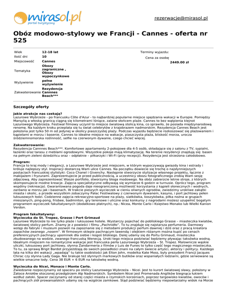 Obóz modowo-stylowy we Francji - Cannes - oferta nr 525