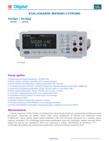 STACJONARNE MIERNIKI CYFROWE TH1941 / TH1942 107720 / 107722 TH 1942 Cechy ogólne ■ Maksymalne wskazanie wyświetlacza : 21,000/51,000 ■ Bardzo czytelny, podwójny wyświetlacz VFD z wysoką jasnością. ■ Pomiar wartości True RMS (pasmo 100kHz) na zakresach ACV oraz ACA. ■ 12 rodzajów pomiarów: DCV/ACV, DCA/ACA, Rezystancja, Częstotliwość/okres, Dioda, dBm, Ciągłość etc. ■ Jednoczesne wyświetlanie parametrów: AC+DC, AC+Hz, odczyt+%, oraz odczyt +dBm ■ Bardzo szybkie próbkowanie: 15x/sek. (TH1941) oraz 30 x/sek. (TH1942) ■ Pomiar DCV z dokładnością do 0.02% oraz rozdzielczością 10µV ■ Wyświetlanie mierzonej wartości w postaci wyniku procentowego. ■ Pomiary relatywne (REL). ■ MoŜliwość kalibracji przyrządu bez otwierania obudowy. ■ MoŜliwość zadawania limitów (HI/IN/LO) w celu szybkiego sortowania. ■ Interfejs USB (RS232C) umoŜliwiający integrację przyrządu z systemami pomiarowymi (SCPI). Wprowadzenie ■ Mierniki stacjonarne TH1941/TH1942 umoŜliwiają pomiar napięcia/prądu/rezystancji z zastosowaniem dodatkowych funkcji pomiarowych. Zapewniają one stabilny, bardzo szybki pomiar (próbkowanie do 30x/sek) oraz maksymalny odczyt 21,000/51,000 . Miernik cechuje bardzo wysoka dokładność 0,02% (DCV).Przyrządy wyposaŜone są w podwójny, bardzo czytelnym wyświetlacz VFD umoŜliwiający jednocześnie obserwowanie mierzonych parametrów: napięcie oraz prąd AD/DC, napięcie lub prąd AC oraz częstotliwość. Miernik jest wyposaŜony w interfejs USB (RS232C) do współpracy z PC umozliwiajacy gromadzenie oraz analizę danych pomiarowych a takŜe komunikację w standardzie SCPI. www.biall.com.pl Specyfikacja moŜe zostać zmieniona bez uprzedzenia Specyfikacja Model TH1941 Środowisko pomiaru TH1942 PoniŜsza specyfikacja została określona dla trybu “slow”. Pozostałe informacje odnośnie pomiarów znajdują się w instrukcji obsługi. Okres kalibracji: 1 rok Środowisko pracy: 18°C÷28°C, ≤90%RH, and ≤70%RH (dla zakresu rezystancji: 5MΩ÷50MΩ) Czas nagrzewania przyrządu: 30 minut Dokładność: ± (odcz.% + zakr.%) ℃ (dla zakresu temperatur 0℃ ℃ ÷18℃ ℃ oraz 28℃ ℃÷40℃ ℃) Współczynnik temp: +0.1×okreś.dokł/℃ Próbkowanie (odcz./sek) DCV,DCA ACV,ACA Rezystancja AC+DC AC+Hz Częstotliwość DCV 200mV/500mV 2V/5V Zakresy 20V/50V 200V/500V 1000V Odczyt max. Rozdzielczość Dokładność Impedancja wejściowa Odczyt max. Rozdzielczość Dokładność Impedancja wejściowa 210.00 2.1000 21.000 210.00 1200.00 10µV 100µV 1mV 10mV 100mV 0.03+0.02 0.03+0.01 0.03+0.01 0.03+0.01 0.03+0.01 10MΩ 11.1MΩ 10.1MΩ 10MΩ 10MΩ 510.00 5.1000 51.000 510.00 1200.00 10µV 100µV 1mV 10mV 100mV 0.02+0.016 0.02+0.008 0.02+0.008 0.02+0.008 0.02+0.008 10MΩ 11.1MΩ 10.1MΩ 10MΩ 10MΩ DCA Odczyt max. Rozdzielczość Dokładność Odczyt max. Rozdzielczość Dokładność Zakresy Medium 8 8 8 1.5 1.5 8 Slow 2.5 2.5 2.5 0.5 0.5 4 Medium 12 12 12 1.5 1.5 8 Fast 30 30 30 3.5 3 12 Napięcie obciąŜenia / rezystancja bocznika 2mA/5mA 20mAV/50mA 200mA/500mA 2A/5A 20A 2.1000 21.000 210.00 2.1000 20.000 200mV 10µV 1.20+0.16 50~20 kHz 0.5+0.1 20k~50 kHz 50k~100 kHz 2.0+0.2 5.0+0.8 0.1µA 1µA 10µA 100µA 1mA 2V 100µV <0.3V/100Ω <0.04V / 1Ω <0.3V / 1Ω <0.05V / 10mΩ <0.6V / 10mΩ 750V 100mV 0.8+0.08 1.5+0.08 5.0+0.3 2mA 20mA Rozdzielczość 20~50 Hz Dokład 50~2 kHz ność 2k~20 kHz Napięcie obciąŜenia / rezystancja bocznika Rezystancja 200Ω/500Ω 2 kΩ/5 kΩ 20 kΩ/50 kΩ Zakresy 200 kΩ/500 kΩ 2MΩ/5 MΩ 20MΩ/50 MΩ Częstotliwość 500 Hz 5kHz 0.1µA 1.50+0.2 1µA 2+0.2 0.1+0.010 0.1+0.008 0.1+0.008 0.3+0.010 0.3+0.010 20V 200V 1mV 10mV ------ 0.4+0.05 ACA Zakresy Fast 15 15 15 3.5 3 12 Napięcie obciąŜenia / ACV Rozdzielczość 20~50 Hz Dokład ność Slow 2.5 2.5 2.5 0.5 0.5 4 200m A 10µA 0.5+0.12 2+0.15 rezystancja bocznika 5.1000 51.000 510.00 5.1000 20.000 500mV 10µV 1.20+0.16 0.4+0.0 6 1.5+0.1 3.0+0.3 0.1µA 1µA 10µA 100µA 1mA 5V 100µV 50mA 0.05+0.010 0.05+0.008 0.05+0.008 0.25+0.010 0.25+0.010 50V 500V 1mV 10mV ------ 0.35+0.02 20A 5mA 100µA 2.00+0.2 0.5+0.2 1mA 0.1µA 1µA 10µA 1.50+0.16 0.5+0.08 2+0.16 2+0.12 ------ Identyczne jak dla zakresów DCA. 0.50+0.03 1.00+0.04 3.0+0.1 2A ------ <0.6V/100Ω <0.08V / 1Ω <0.8V / 1Ω <0.1V / 10mΩ <0.6V / 10mΩ 750V 100mV 500mA 5A 20A 100µA 1mA 2.00+0.16 0.5+0.1 ----------- Identyczne jak dla zakresów DCA. Odczyt max. Rozdzielczość Prąd testu Dokładność Odczyt max. Rozdzielczość Prąd testu Dokładność 210.00 2.1000 21.000 210.00 2.1000 21.000 10mΩ 100mΩ 1Ω 10 Ω 100 Ω 1kΩ 0.5 mA 0.45 mA 45µA 4.5µA 450nA 45nA 0.10+0.02 0.10+0.01 0.10+0.01 0.10+0.01 0.15+0.01 0.30+0.02 510.00 5.1000 51.000 510.00 5.1000 51.000 10mΩ 100mΩ 1Ω 10 Ω 100 Ω 1kΩ 0.5 mA 0.45 mA 45µA 4.5µA 450nA 45nA 0.10+0.010 0.10+0.008 0.10+0.008 0.10+0.008 0.15+0.008 0.30+0.010 Odczyt max. Rozdzielczość Dokładność Czułość Odczyt max. Rozdzielczość Prąd testu Czułość 510.00 5.1000 0.01Hz 0.1Hz 200mV rms 300mV rms 510.00 5.1000 0.01Hz 0.1Hz 51.000 1Hz 300mV rms 51.000 1Hz 500kHz 999.99 10Hz 500mV rms 999.99 10Hz 0.05+0.02 0.01+0.02 0.01+0.00 8 0.01+0.00 8 200mV rms 300mV rms 50kHz 0.05+0.02 0.01+0.02 0.01+0.00 8 0.01+0.00 8 www.biall.com.pl 300mV rms 500mV rms Specyfikacja moŜe zostać zmieniona bez uprzedzenia Funkcje pomiarowe Rodzaje DCA , ACA, DCV, ACA, Rezystancja, Częstotliwość, Okres, Ciągłość, Dioda pomiarów pomiar w Funkcje matematyczne Zmiana %, dBm, REL Automatyczna, Ręczna zakresów zakres w Wyświetlacz Wy wietlacz VFD,podwójny Odczyt Tryb pojedyńczy: wszystkie mierzone parametry Tryb podwójny: V AC+V DC, I AC+I DC, V AC+Hz, I AC+Hz, Odczyt+%, Odczyt+dBm, Odczyt+Max/Min Tryb wyzwalania INT/MAN/BUS Funkcja HOLD UmoŜliwia zatrzymanie na wyświetlaczu wyniku, który najbardziej odpowiada stanowi faktycznemu zgodnie z załoŜona dokładnością. Komparator UmoŜliwia zadanie wartości: HI, IN, LO oraz wyzwalanie alarmu przy osi