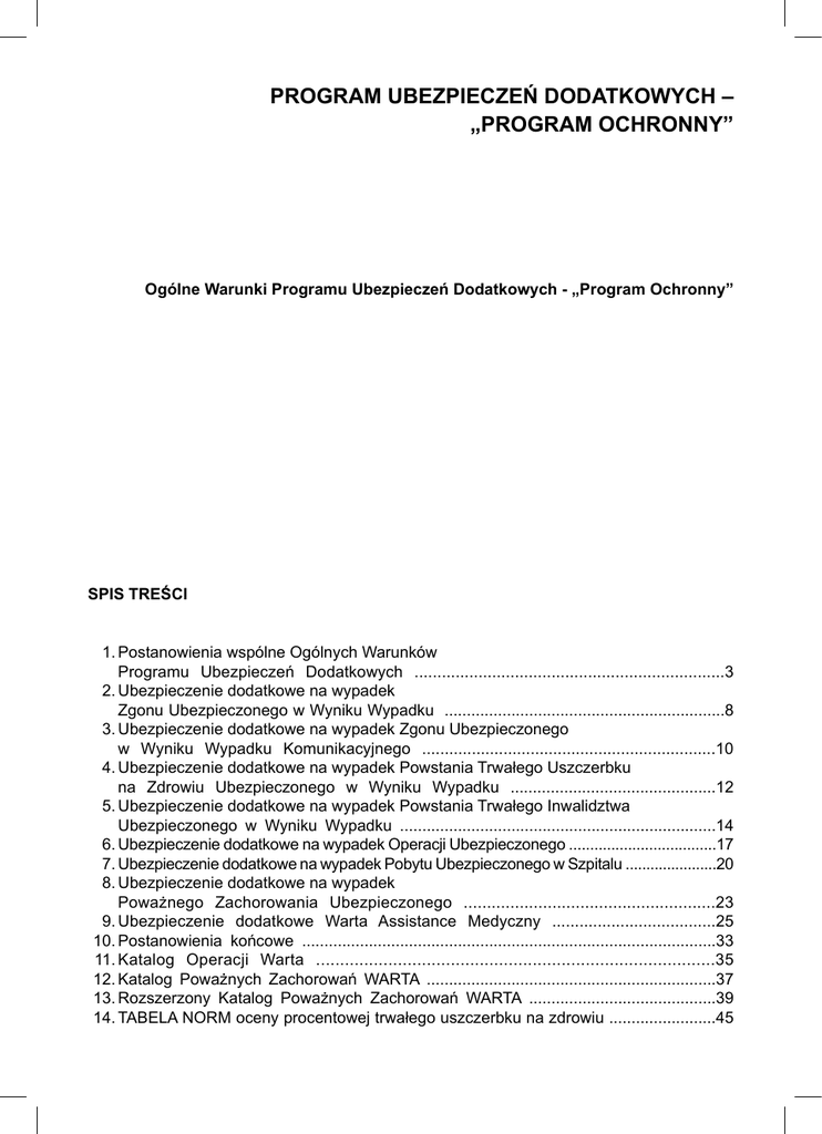 PROGRAM UBEZPIECZEŃ DODATKOWYCH – „PROGRAM OCHRONNY” Ogólne Warunki Programu Ubezpieczeń Dodatkowych - „Program Ochronny” SPIS TREŚCI 1.Postanowienia wspólne Ogólnych Warunków Programu Ubezpieczeń Dodatkowych ....................................................................3 2.Ubezpieczenie dodatkowe na wypadek Zgonu Ubezpieczonego w Wyniku Wypadku ...............................................................8 3.Ubezpieczenie dodatkowe na wypadek Zgonu Ubezpieczonego w Wyniku Wypadku Komunikacyjnego .................................................................10 4.Ubezpieczenie dodatkowe na wypadek Powstania Trwałego Uszczerbku na Zdrowiu Ubezpieczonego w Wyniku Wypadku ..............................................12 5.Ubezpieczenie dodatkowe na wypadek Powstania Trwałego Inwalidztwa Ubezpieczonego w Wyniku Wypadku .......................................................................14 6.Ubezpieczenie dodatkowe na wypadek Operacji Ubezpieczonego ...................................17 7.Ubezpieczenie dodatkowe na wypadek Pobytu Ubezpieczonego w Szpitalu ......................20 8.Ubezpieczenie dodatkowe na wypadek Poważnego Zachorowania Ubezpieczonego ......................................................23 9.Ubezpieczenie dodatkowe Warta Assistance Medyczny ....................................25 10.Postanowienia końcowe .............................................................................................33 11.Katalog Operacji Warta ...................................................................................35 12.Katalog Poważnych Zachorowań WARTA .................................................................37 13.Rozszerzony Katalog Poważnych Zachorowań WARTA ..........................................39 14.TABELA NORM oceny procentowej trwałego uszczerbku na zdrowiu ........................45 IND/ PUD /2013/01 PROGRAM UBEZPIECZEŃ DODATKOWYCH – „PROGRAM OCHRONNY” OGÓLNE WARUNKI PROGRAMU UBEZPIECZEŃ DODATKOWYCH - „PROGRAM OCHRONNY” POSTANOWIENIA OGÓLNE §1 Postanowienia niniejszych Ogólnych Warunków Programu Ubezpieczeń Dodatkowych – „Program Ochronny” (zwanych dalej „OWPUD”) mają zastosowanie w Umowie dodatkowej zawieranej jako uzupełnienie Umów ubezpieczenia na życie, zawartych na podstawie ogólnych warunków podstawowej umowy ubezpieczenia. ROZDZIAŁ I POSTANOWIENIA WSPÓLNE OGÓLNYCH WARUNKÓW PROGRAMU UBEZPIECZEŃ DODATKOWYCH DEFINICJE §2 W niniejszych OWPUD, wymienionym poniżej terminom nadaje się znaczenie: 1) Miesiąc polisowy – pierwszy miesiąc polisowy oznacza miesiąc rozpoczynający się w dniu zawarcia Umowy dodatkowej; kolejne miesiące polisowe oznaczają miesiące rozpoczynające się w takiej samej dacie każdego następnego miesiąca kalendarzowego, a gdy dnia o takiej dacie w danym miesiącu nie ma, w ostatnim dniu danego miesiąca kalendarzowego, 2) Polisa dodatkowa – dokument wystawiony przez Ubezpieczyciela, potwierdzający zawarcie Programu Ubezpieczeń Dodatkowych, 3) Program Ubezpieczeń Dodatkowych (Program) – ubezpieczenia dodatkowe określone w § 2 pkt 14), 4) Rocznica Polisy dodatkowej – dzień, w kolejnym roku trwania Programu Ubezpieczeń Dodatkowych, odpowiadający dacie zawarcia Programu Ubezpieczeń Dodatkowych, a jeżeli w danym miesiącu kalendarzowym nie ma dnia miesiąca odpowiadającego tej dacie – ostatni dzień tego miesiąca, 5) Rok polisy (rok polisowy) – okres pomiędzy kolejnymi Rocznicami Polisy dodatkowej, 6) Składka ochronna – kwota opłacana przez Ubezpieczającego z tytułu ochrony udzielanej w ramach Programu Ubezpieczeń Dodatkowych, 7) Suma ubezpieczenia dodatkowego – kwota zdefiniowana oddzielnie dla każdego ubezpieczenia dodatkowego i określona w Polisie dodatkowej lub w innym dokumencie ubezpieczenia, będąca podstawą ustalenia wysokości Świadczenia Ubezpieczyciela, 8) Świadczenie – kwota, którą Ubezpieczyciel wypłaca Uprawnionemu w razie zajścia zdarzenia przewidzianego w Umowie dodatkowej, 9) Ubezpieczyciel – Towarzystwo Ubezpieczeń na Życie „WARTA” Spółka Akcyjna, 10)Ubezpieczający – osoba fizyczna, osoba prawna lub jednostka organizacyjna nie posiadająca osobowości prawnej posiadająca zawartą aktywną Umowę podstawową oraz zawierająca Program Ubezpieczeń Dodatkowych. Ubezpieczający i Ubezpieczony w Umowie podstawowej i Programie Umów Dodatkowych muszą być tymi samymi osobami, 11) Ubezpieczony – wskazana w Programie Ubezpieczeń Dodatkowych osoba fizyczna, której życie lub zdrowie jest przedmiotem ubezpieczenia w ramach Umowy podstawowej i Programu Ubezpieczeń Dodatkowych. Ubezpieczający i Ubezpieczony w Umowie podstawowej i Programie Ubezpieczeń Dodatkowych muszą być tymi samymi osobami, 12)Umowa podstawowa – umowa ubezpieczenia na życie zawarta pomiędzy Ubezpieczycielem a Ubezpieczającym na swój rachunek albo na rachunek Ubezpieczonego na podstawie ogólnych warunków ubezpieczenia; Umowa podstawowa jest aktywna jeśli, a) nie jest w okresie wypowiedzenia, b) nie zgłoszono Świadczenia z tytułu Dodatkowego Ubezpieczenia Przejęcia Opłacania Składki w Przypadku Całkowitego Inwalidztwa Ubezpieczonego, c) nie zgłoszono świadczenia z tytułu Dodatkowego Ubezpieczenia na Wypadek Choroby Śmiertelnej Ubezpieczonego, 3 13)Umowa dodatkowa – umowa ubezpieczenia zawarta pomiędzy Ubezpieczycielem a Ubezpieczającym, o którym mowa w pkt 10), na swój rachunek albo na rachunek Ubezpieczonego, o którym mowa w pkt 11), na podstawie niniejszych Ogólnych Warunków Programu Ubezpieczeń Dodatkowych, 14)Ubezpieczenia dodatkowe – każde z poniższych ubezpieczeń: a) ubezpieczenie dodatkowe na wypadek Zgonu Ubezpieczonego w Wyniku Wypadku, b) ubezpieczenie dodatkowe na wypadek Zgonu Ubezpieczonego w Wyniku Wypadku Komunikacyjnego, c) ubezpieczenie dodatkowe na wypadek Powstania Trwałego Uszczerbku na Zdrowiu Ubezpieczonego w Wyniku Wypadku, d) ubezpieczenie dodatkowe na wyp