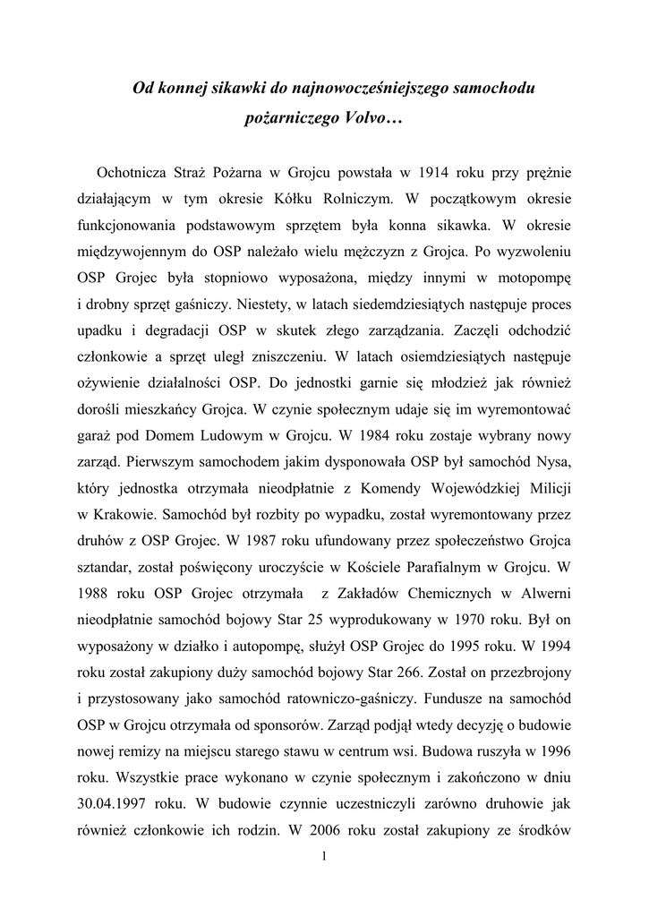 Od konnej sikawki do najnowocześniejszego samochodu pożarniczego Volvo… Ochotnicza Straż Pożarna w Grojcu powstała w 1914 roku przy prężnie działającym w tym okresie Kółku Rolniczym. W początkowym okresie funkcjonowania podstawowym sprzętem była konna sikawka. W okresie międzywojennym do OSP należało wielu mężczyzn z Grojca. Po wyzwoleniu OSP Grojec była stopniowo wyposażona, między innymi w motopompę i drobny sprzęt gaśniczy. Niestety, w latach siedemdziesiątych następuje proces upadku i degradacji OSP w skutek złego zarządzania. Zaczęli odchodzić członkowie a sprzęt uległ zniszczeniu. W latach osiemdziesiątych następuje ożywienie działalności OSP. Do jednostki garnie się młodzież jak również dorośli mieszkańcy Grojca. W czynie społecznym udaje się im wyremontować garaż pod Domem Ludowym w Grojcu. W 1984 roku zostaje wybrany nowy zarząd. Pierwszym samochodem jakim dysponowała OSP był samochód Nysa, który jednostka otrzymała nieodpłatnie z Komendy Wojewódzkiej Milicji w Krakowie. Samochód był rozbity po wypadku, został wyremontowany przez druhów z OSP Grojec. W 1987 roku ufundowany przez społeczeństwo Grojca sztandar, został poświęcony uroczyście w Kościele Parafialnym w Grojcu. W 1988 roku OSP Grojec otrzymała z Zakładów Chemicznych w Alwerni nieodpłatnie samochód bojowy Star 25 wyprodukowany w 1970 roku. Był on wyposażony w działko i autopompę, służył OSP Grojec do 1995 roku. W 1994 roku został zakupiony duży samochód bojowy Star 266. Został on przezbrojony i przystosowany jako samochód ratowniczo-gaśniczy. Fundusze na samochód OSP w Grojcu otrzymała od sponsorów. Zarząd podjął wtedy decyzję o budowie nowej remizy na miejscu starego stawu w centrum wsi. Budowa ruszyła w 1996 roku. Wszystkie prace wykonano w czynie społecznym i zakończono w dniu 30.04.1997 roku. W budowie czynnie uczestniczyli zarówno druhowie jak również członkowie ich rodzin. W 2006 roku został zakupiony ze środków 1 gminy, KSRG, Zarządu Głównego ZOSP i innych sponsorów lekki samochód pożarniczy „Gazela”. Uroczyste przekazanie i poświęcenie odbyło się w dniu 26 sierpnia 2006 roku. W związku z zakupem samochodu zaistniała potrzeba wybudowania garażu. Środki na materiały pozyskano od prywatnych sponsorów, a wszystkie pracy wykonali nasi druhowie w czynie społecznym. W dniu 7 października 2007 roku z udziałem Wiceministra Spraw Zagranicznych Pawła Kowala odbyło się uroczyste przekazanie sprzętu do ratownictwa technicznego zakupionego ze środków MSWiA, Zarządu Głównego ZOSP, KSRG i gminy Alwernia oraz prywatnych sponsorów. W 2009 roku grojecka jednostka Ochotniczej Straży Pożarnej wzbogaciła się o dwa motocykle terenowe marki HONDA XL 125S. Motory zostały bezpłatnie przekazane z Karpackiego Oddziału Straży Granicznej w Nowym Sączu. W dniu 9 listopada 2009 odbyło się posiedzenie Zarządu OSP Grojec. Miało ono szczególny charakter ze względu na obecność wyjątkowych gości. Przybyli do nas: Prezes Zarządu Oddziału Wojewódzkiego ZOSP RP w Małopolsce św. Pamięci Druh Wiesław Woda - Poseł na Sejm RP, Z-ca Dyrektora Zarządu Wykonawczego ZOW ZOSP RP woj. małopolskiego Druh Łukasz Smółka, Prezes Oddziału Gminnego ZOSP RP Druh Jan Rychlik - Burmistrz Gminy Alwernia, Gwardian klasztoru o. Bernardynów w Alwerni o. Bartłomiej Mazurkiewicz oraz Druh Bronisław Cyganik. Na zebraniu tym zainicjowano starania o zakup średniego samochodu pożarniczego i Pan Burmistrz zadeklarował pomoc i zabezpieczenie odpowiedniej kwoty na ten cel w budżecie gminy na 2010 rok. 5 sierpnia 2010 roku rozstrzygnięto przetarg, a 20 sierpnia została podpisana umowa z firmą „bocar” na dostawę nowego samochodu pożarniczego marki VOLVO na kwotę 500 tys. zł. 18 października 2010 roku delegacja z OSP Grojec wraz z Panem Burmistrzem Janem Rychlikiem odebrała z fabryki "bocar" pod Częstochową nowy średni samochód pożarniczy marki VOLVO FL. Jest to obecnie najnowocześniejszy wóz tego typu w powiecie chrzanowskim. Należy w tym miejscu podkreślić, że z budżetu gminy otrzymaliśmy 200 tys. zł, 130 tys. 2 z Wojewódzkiego Funduszu Ochrony Środowiska i Gospodarki Wodnej w Krakowie w formie pożyczki spłacanej przez gminę, gdzie po spłacie 60%, może zostać umorzone 35% pożyczki tj. 45 500 zł . 20 tys. ze środków Powiatu Chrzanowskiego, 105 tys. z Krajowego Systemu Ratowniczo-Gaśniczego Komendy Głównej PSP w Warszawie, 10 tys. z ZG ZOSP RP w Warszawie, 35 tys. w formie dotacji z Komendy Głównej PSP. Tak więc przedstawia się w skrócie historia naszej jednostki. Na koniec chciałbym w imieniu wszystkich naszych druhów serdecznie podziękować Panu Komendantowi Wojewódzkiemu za pomoc w uzyskaniu środków pieniężnych, Komedzie Powiatowej P.S.P. w Chrzanowie za współpracę, Burmistrzowi i radnym a w szczególności Panu Henrykowi Kędziorze, Stanisławie Kasperczyk, Janowi Włodarskiemu, Ludwikowi Chodackiemu, Krystynie Wojtoń i Wiesławie Jakubik za pomoc finansową, i za wszelaką pomoc w naszej działalności, oraz wszystkim sponsorom za ich życzliwość i hojność. Dziękuję również moim kolegom strażakom za ogrom pracy wykonanej społecznie, bo tylko dzięki tej pracy możemy osiągać dalsze sukcesy. PREZES OSP GROJEC Druh Ludwik CIUPEK 3