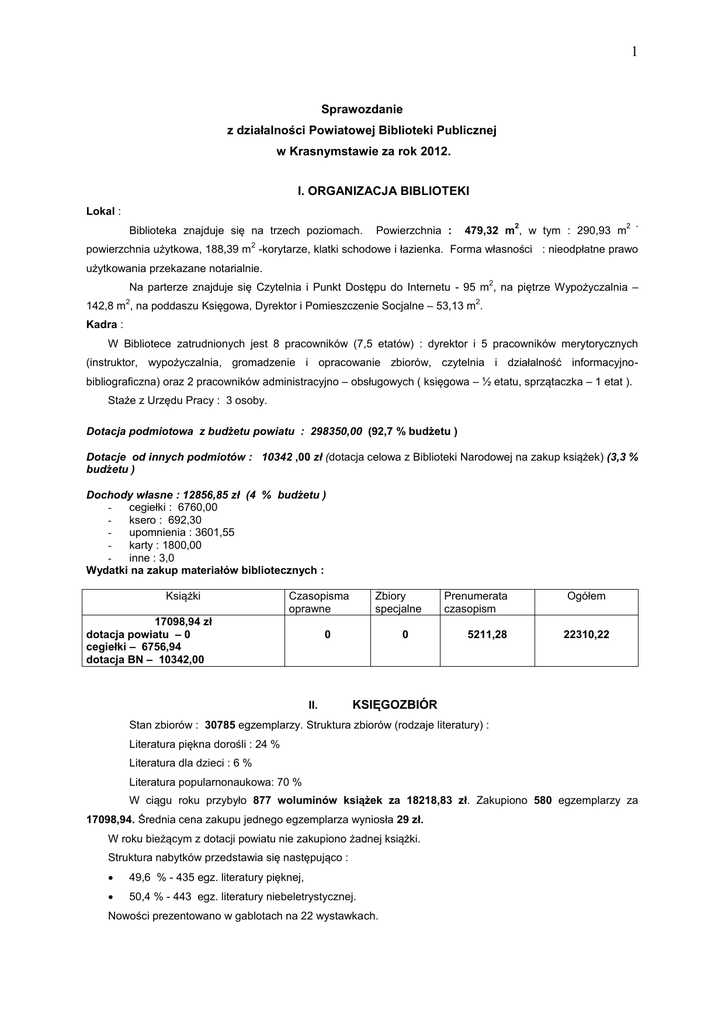 1 Sprawozdanie z działalności Powiatowej Biblioteki Publicznej w Krasnymstawie za rok 2012. I. ORGANIZACJA BIBLIOTEKI Lokal : Biblioteka znajduje się na trzech poziomach. Powierzchnia : 2 2 - 479,32 m , w tym : 290,93 m 2 powierzchnia użytkowa, 188,39 m -korytarze, klatki schodowe i łazienka. Forma własności : nieodpłatne prawo użytkowania przekazane notarialnie. 2 Na parterze znajduje się Czytelnia i Punkt Dostępu do Internetu - 95 m , na piętrze Wypożyczalnia – 2 2 142,8 m , na poddaszu Księgowa, Dyrektor i Pomieszczenie Socjalne – 53,13 m . Kadra : W Bibliotece zatrudnionych jest 8 pracowników (7,5 etatów) : dyrektor i 5 pracowników merytorycznych (instruktor, wypożyczalnia, gromadzenie i opracowanie zbiorów, czytelnia i działalność informacyjnobibliograficzna) oraz 2 pracowników administracyjno – obsługowych ( księgowa – ½ etatu, sprzątaczka – 1 etat ). Staże z Urzędu Pracy : 3 osoby. Dotacja podmiotowa z budżetu powiatu : 298350,00 (92,7 % budżetu ) Dotacje od innych podmiotów : 10342 ,00 zł (dotacja celowa z Biblioteki Narodowej na zakup książek) (3,3 % budżetu ) Dochody własne : 12856,85 zł (4 % budżetu ) cegiełki : 6760,00 ksero : 692,30 upomnienia : 3601,55 karty : 1800,00 inne : 3,0 Wydatki na zakup materiałów bibliotecznych : Książki Czasopisma oprawne 17098,94 zł dotacja powiatu – 0 cegiełki – 6756,94 dotacja BN – 10342,00 Zbiory specjalne 0 II. 0 Prenumerata czasopism 5211,28 Ogółem 22310,22 KSIĘGOZBIÓR Stan zbiorów : 30785 egzemplarzy. Struktura zbiorów (rodzaje literatury) : Literatura piękna dorośli : 24 % Literatura dla dzieci : 6 % Literatura popularnonaukowa: 70 % W ciągu roku przybyło 877 woluminów książek za 18218,83 zł. Zakupiono 580 egzemplarzy za 17098,94. Średnia cena zakupu jednego egzemplarza wyniosła 29 zł. W roku bieżącym z dotacji powiatu nie zakupiono żadnej książki. Struktura nabytków przedstawia się następująco : 49,6 % - 435 egz. literatury pięknej, 50,4 % - 443 egz. literatury niebeletrystycznej. Nowości prezentowano w gablotach na 22 wystawkach. 2 W ciągu roku ubyło 81 książek za 272,90 zł. W tym : 12 egzemplarze zagubione przez czytelników, 69 egzemplarzy selekcja książek zniszczonych i zdezaktualizowanych. Stan zbiorów w dniu 31.12.2012 r. Książki Liczba jednostek Wartość w zł 30785 348870,32 0 0 Zakup z Biblioteki Narodowej 364 10342,00 Zakup za cegiełki 216 6756,94 Dary 134 488,00 Za zagubione 12 326,89 Inny sposób nabycia 151 305,00 Ubyło w 2012 r. 81 272,90 Książki stan w dn. 31.12.2012 Zakup z dotacji powiatu III. CZYTELNICTWO W roku 2012 Biblioteka zarejestrowała 2141 czytelników (+10). W ramach współpracy z Domem Pomocy Społecznej w Krasnymstawie (Filia Ostrów Krupski, Filia Stężyca Nadwieprzańska) co miesiąc odwiedzano 11 pensjonariuszy seniorów wypożyczając im książki. Wypożyczalnia była otwarta przez 292 dni, czytelnicy odwiedzili ją razy, średnia dzienna 21826 odwiedzin wyniosła 75 osób. Statystyczny czytelnik odwiedził wypożyczalnię średnio 10 razy. Podział czytelników i odwiedzin według kategorii wiekowych Ilość Do lat 15 16-19 20-24 24-44 45-60 Pow.60 Czytelnicy 2141 41 209 521 826 435 109 Odwiedziny 21826 364 1872 5044 7600 5297 1649 Średnie odwiedziny 10 8 9 9 9 12 15 3 Podział czytelników i odwiedzin według kategorii zawodowych Ilość Młodzież ucząca się Czytelnicy 2141 299 Odwiedziny 21826 2796 Nie Pracownic Pracow zatrudnien y fizyczni nicy umysłowi i 174 124 605 1706 1216 Rolnicy Studenci Emeryci Inni 68 682 165 24 612 6541 2031 200 6724 Czytelnia czynna była przez 250 dni w roku, w tym czasie zarejestrowano 3803 odwiedzin, średnia dzienna odwiedzin wyniosła 15 osób. Odwiedziny w czytelni według kategorii zawodowych : Ilość Uczniow ie Studenci 3803 413 100 % 10,9 Pracow nicy fizyczni Rolnicy 1059 Pracow nicy umysło wi 703 Nie zatrudnieni Emeryci 74 Inni zatrudni eni 425 175 689 265 27,8 18,5 4,6 2,0 11,2 18,1 6,9 Z dostępu do Internetu w ciągu roku skorzystało 1851 użytkowników. IV. W ciągu 292 dni w wypożyczalni UDOSTĘPNIANIE ZBIORÓW na zewnątrz wypożyczono 40871 książek, średnio dziennie wypożyczano 140 książek. Na jednego zarejestrowanego czytelnika przypada 19 wypożyczonych książek. 844 czytelników wypożyczyło w ciągu roku co najmniej 10 książek. 1388 czytelników wypożyczyło w ciągu roku co najmniej 5 książek. Przynajmniej jeden raz wypożyczono 10317 książek ( 33 % księgozbioru). Najpoczytniejsze książki literatury pięknej : Rowling J. : Harry Potter i czara ognia (29 wypożyczeń), Rowling J. : Harry Potter i komnata tajemnic (27), Rowling J. : Harry Potter i kamień filozoficzny (25), Sparks N. : Pamiętnik (20), Kalicińska M. : Zwyczajny facet (19), Najpoczytniejsze książki niebeletrystyczne : Kazimierczuk Z., Cabaj J. : Krasnystaw i okolice (25 wypożyczeń), Stołecki K. : Krasnystaw : rys historyczny (24), Pilch T. : Zasady badań pedagogicznych (22), Psychologia rozwojowa (16), Zapiski krasnostawskie (16), Psychologia rozwoju człowieka (15), Łobocki M. : Metody badań pedagogicznych (14), Łobocki M. : Wprowadzenie do metodologii badań (14), Najaktywniejsi czytelnicy (wypożyczone powyżej 100 książek) : 169 książek, 149, 142, 135, 132, 130, 124, 122, 112,109. Książki wypożyczone w wypożyczalni : 4 Literatura piękna Literatura piękna dla dzieci i dorośli młodzieży 14506 2646 Literatura niebeletrystyczna Razem 23719 40871 Wypożyczenia książek : Struktura wypożyczeń według kategorii wiekowych czytelników : Ilość Do lat 15 16-19 20-24 24-44 45-60 Pow.60 Czytelnicy 2141 41 209 521 826 435 109 Wypożyczenia książek % 40871 654 3015 9091 13672 10069 4370 100 1,6 7,4 22,2 33,5 24,6 10,7 Struktura wypożyczeń według kategorii zawodowych czytelników: Ilość Młodzież ucząca się Czytelnicy 2141 299 Wypożycze nia książek % 40871 4614 3396 2140 100 11,3 8,3 5,2 Nie Pracownic Pracow zatrudnien y fizyc