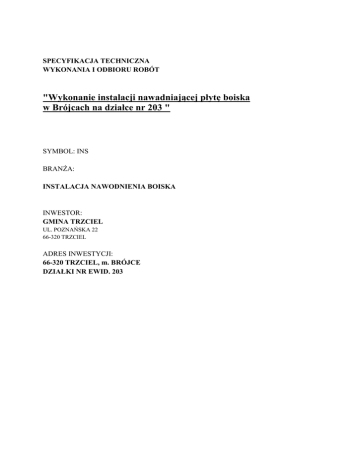 SPECYFIKACJA TECHNICZNA WYKONANIA I ODBIORU ROBÓT "Wykonanie instalacji nawadniającej płytę boiska w Brójcach na działce nr 203 " SYMBOL: INS BRANŻA: INSTALACJA NAWODNIENIA BOISKA INWESTOR: GMINA TRZCIEL UL. POZNAŃSKA 22 66-320 TRZCIEL ADRES INWESTYCJI: 66-320 TRZCIEL, m. BRÓJCE DZIAŁKI NR EWID. 203 SPECYFIKACJA TECHNICZNA WYKONANIA ROBÓT BUDOWLANYCH (Kod CPV 45111200-0, 45232100-3) 1. INSTALACJA ZEWNĘTRZNA WODOCIĄGOWA 1.1 WSTĘP 1.1.1 Przedmiot Specyfikacji Technicznej Przedmiotem niniejszej części specyfikacji technicznej są wymagania dotyczące wykonania i odbioru robót- podłączenia istniejącej sieci wodociągowej do hydroforni służącej podniesieniu ciśnienia wody do nawadniania boiska w Brójcach, gm. Trzciel. 1.1.2 Zakres zastosowania Specyfikacji Technicznej Niniejsza specyfikacja Techniczna stanowi dokument przetargowy i kontraktowy przy zlecaniu, zgodnie z ustawą o zamówieniach publicznych i realizacji oraz rozliczaniu robót opisanych w punkcie 1.1. 1.1.3 Zakres robót objętych Specyfikacją Techniczną Ustalenia zawarte w niniejszej specyfikacji obejmują wymagania dotyczące realizacji robót: Instalacja nawadniająca płytę boiska. 1.1.4 Odpowiedzialność Wykonawcy robót Wykonawca jest odpowiedzialny za jakość wykonania robót oraz ich zgodność z dokumentacją projektową, specyfikacją techniczną i poleceniami Inspektora Nadzoru. 1.2. MATERIAŁY 1.2.1. Ogólne wymagania dotyczące materiałów, ich pozyskania i składowania. INSTALACJA ZEWNĘTRZNA WODOCIĄGOWA RUROCIĄGI Rurociągi - ciśnieniowe z PE 90 SDR 11 PN 12,5. Tuleje kołnierzowe i kołnierze stalowe łączone śrubami ze stali nierdzewnej. Kształtki - z polietylenu. Producent jak w przypadku rurociągu. UZBROJENIE Przejścia rur w ścianach (podłodze) obudowy studni - szczelne. KONTENER HYDROFORNI Obudowę studni wierconej wykonać z kręgów betonowych Ø1500mm, o głębokości 2,0m. Zastosować izolację poziomą i pionową. Teren otaczający studnię, w pasie o szerokości 1m od zewnętrznej obudowy studni wyłożyć kostką brukową o gr. 6cm na podsypce cementowopiaskowej i wyniwelować ze spadkiem 2% w kierunku zewnętrznym. Zaprojektowano pompę głębinową typu WINNER model 4N10/17 firmy EBARA o średnicy 4", wydajność: 10m3/h, wysokość podnoszenia: 66 m.s.w., wraz z szafką sterującą. Należy również zastosować pionowy zbiornik wyrównawczy (membranowy) REFLEX DE o poj. 100l wraz z wyposażeniem. Instalację rozprowadzającą wodę wykonać z rur PE o średnicy DN50 i zakończyć hydrantem podziemnym DN50. Rury wodociągowe układać poniżej strefy przemarzania gruntu ze wzniosem i=0,3% w kierunku hydrantu. Zaleca się minimalne zagłębienie h=1,1m licząc od poziomu terenu do dna posadowienia. Przewidziano montaż jednego żeliwnego hydrantu ogrodowego DN50 z samoczynnym odwodnieniem następującym przy całkowicie zamkniętym zaworze. Dobrano hydrant ogrodowy wraz z odwodnieniem i stojak do hydrantu. Nawadnianie murawy boiska odbywać się będzie przy użyciu zraszaczy samojezdnych. Zraszacz montowany jest na napędzanym przepływającą wodą wózku. Silnik nawija linkę zamocowaną na skraju terenu nawadnianego i w ten sposób przemieszcza się po nawadnianym terenie. Proponuje się urządzenia Rollcart firmy Perrot o następujących parametrach technicznych: - tempo jazdy: 10 do 20 m/godz - wydatek wody: 3,0 m3/godz - szerokość nawadniania: od 28m do 36m - wymiary: 77 x 47 x 40 cm - waga: 27,0 kg 1.3. SPRZĘT Do wykonania robót przyłączeniowych Wykonawca powinien wykazać się możliwością korzystania ze specjalistycznych narzędzi i sprzętu do prowadzenia robót ziemnych i montażowych, w tym m.in.: niwelatorem, koparką podsiębierną / koparkospycharką, samochodem dostawczym skrzyniowym / samowyładowczym, żurawiem samochodowym / dźwigiem, młotem pneumatycznym, umocnieniami systemowymi wykopów, zgrzewarka doczołowa do rur PE z agregatem prądotwórczym, zagęszczarką wibracyjną. 1.4. TRANSPOTRT Dobór transportu technologicznego należy przeprowadzić w uzgodnieniu z Zamawiającym. 1.5. WYKONYWANIE ROBÓT 1.5.1. Ogólne zasady wykonywania robót. Wykonywanie robót w synchronizacji z pozostałymi branżami z uwzględnieniem wytycznych dla pozostałych branż. Przed przystąpieniem do zasadniczych wykopów należy zapoznać się z mapami, jest to ważne ze względu na możliwość wystąpienia kolizji w miejscach skrzyżowań z projektowanym uzbrojeniem podziemnym (np. drenaż). Ewentualnie odkryte uzbrojenie podziemne na czas prowadzenia robót należy podwiesić do kształtowników stalowych za pomocą cięgien ze śrubą rzymską. W miejscach skrzyżowań prace wykopowe prowadzić wyłącznie ręcznie. Po wykonaniu robót teren doprowadzić do stanu pierwotnego. Roboty ziemne należy wykonać zgodnie z normą BN-8836-02 zawierające wymagania odnośnie wykopów. Wykopy pod projektowane przyłącze przewiduje się wykonać stosując wykopy pionowe, wąsko przestrzenne , umocnione wypraskami. Głębokość wykopów i ułożenia wodociągu zgodnie z dokumentacją projektową. W miejscach skrzyżowań z istniejącym uzbrojeniem oraz na włączeniu do istniejących ciągów roboty wykonywać wyłącznie ręcznie. Wykopy należy zabezpieczyć przed napływem wód powierzchniowych. Wykopy w ich dolnej części należy wykonywać ze szczególną starannością, aby uniknąć przekopania (naruszenia dna wykopu). W okresie zimowym spód wykopów należy zabezpieczyć, tak aby w żadnej fazie robót nie dopuścić do zamarznięcia gruntu poniżej rur. Minimalna szerokość wykopu 0,7m. Montaż rurociągów zgodnie z instrukcją producenta rur. Zmiany kierunku rurociągu za pomocą gotowych kształtek. Rurociągi należy ułożyć na podsypce piaskowej grubości 15cm, z wyprofilowaniem na kąt podparcia 90o. Zasypkę wykonać piaskiem warstwami 30cm, dokładnie je ubijając. W terenach zielonych ostatnią 15cm warstwę wypełnić humusem. W c