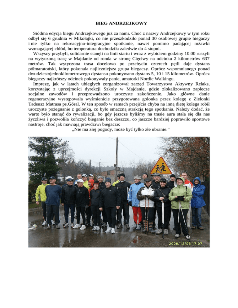 BIEG ANDRZEJKOWY Siódma edycja biegu Andrzejkowego już za nami. Choć z nazwy Andrzejkowy w tym roku odbył się 6 grudnia w Mikołajki, co nie przeszkodziło ponad 30 osobowej grupie biegaczy i nie tylko na rekreacyjno-integracyjne spotkanie, nawet pomimo padającej mżawki wzmagającej chłód, bo temperatura dochodziła zaledwie do 4 stopni. Wszyscy przybyli, solidarnie stanęli na linii startu i wraz z wybiciem godziny 10.00 ruszyli na wytyczoną trasę w Majdanie od ronda w stronę Cięciwy na odcinku 2 kilometrów 637 metrów. Tak wytyczona trasa docelowo po przebyciu czterech pętli daje dystans półmaratoński, który pokonała najliczniejsza grupa biegaczy. Oprócz wspomnianego ponad dwudziestojednokilometrowego dystansu pokonywano dystans 5, 10 i 15 kilometrów. Oprócz biegaczy najkrótszy odcinek pokonywały panie, amatorki Nordic Walkingu. Imprezę, jak w latach ubiegłych zorganizował zarząd Towarzystwa Aktywny Relaks, korzystając z uprzejmości dyrekcji Szkoły w Majdanie, gdzie zlokalizowano zaplecze socjalne zawodów i przeprowadzono uroczyste zakończenie. Jako główne danie regeneracyjne występowała wyśmienicie przygotowana golonka przez kolegę z Zielonki Tadeusz Matrasa ps.Góral. W ten sposób w ramach przejścia chyba na inną dietę kolega robił uroczyste pożegnanie z golonką, co było smaczną atrakcją tego spotkania. Należy dodać, że warto było stanąć do rywalizacji, bo gdy jeszcze byliśmy na trasie aura stała się dla nas życzliwa i pozwoliła kończyć bieganie bez deszczu, co jaszcze bardziej poprawiło sportowe nastroje, choć jak mawiają prawdziwi biegacze: „Nie ma złej pogody, może być tylko złe ubranie.” Na zakończenie podajemy zestawienie osiągniętych wyników na trochę nietypowych dystansach wynikających z podziału dystansu półmaratońskiego oraz polecamy i zapraszamy do aktywnego spędzania czasu. 21 kilometrów 097 metrów-półmaraton 1.) Król Dariusz 01:25:27 2.) Szczepaniuk Jarosław 01:30,55 3.) Gajewski Kamil 01:37,03 4.) Piątkowski Mariusz 01:40,14 5.) Stankiewicz Krzysztof 01:42,59 6.) Gołębiewski Tadeusz 01:44,10 7.) Kurek Andrzej 01:44,14 8.) Kowalczyk Paweł 01:44,15 9.) Pytkowski Marek 01:47,25 10.) Gołębiewski Daniel 01:57,08 11.) Kurek Marcin 01:57,25 12.) Matczuk Konrad 01:58,02 13.) Matras Tadeusz 02:04,17 1.) 15 kilometrów 825 metrów Dembiński Eugeniusz 01:16,35 2.) Dąbrowski Krzysztof 01:16,41 3.) Świętochowski Karol 01:24,04 4.) Góra Andrzej 01:33,15 5.) Krysiński Bogdan 01:34,25 6.) Fido Jerzy 01:48,21 7.) Eysmund Jerzy 01:48,21 10 kilometrów 550 metrów 1.) Ruta Kamil 47,03 2.) Marcinkiewicz Grzegorz 55,36 3.) Chruśliński Zbigniew 61,02 4.) Matras Anna 62,20 1.) 5 kilometrów 275 metrów Jankiewicz Bogusław 26,10 2.) Nowak Waldemar 31,40 3.) Pytkowska Jolanta 31,15 4.) 33,00 5.) Prokopowicz Edmund 5 kilometrów 275 metrów - Nordic Walking Król Bożena 6.) Gocal Anna 58,19 7.) Król Agnieszka 58,19 56,10 Relacja: Dariusz Król