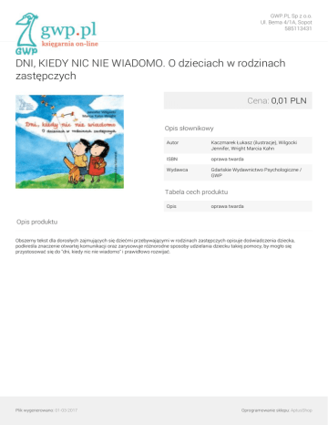 GWP.PL Sp z o.o. Ul. Bema 4/1A, Sopot 585113431 DNI, KIEDY NIC NIE WIADOMO. O dzieciach w rodzinach zastępczych Cena: 0,01 PLN Opis słownikowy Autor Kaczmarek Łukasz (ilustracje), Wilgocki Jennifer, Wright Marcia Kahn ISBN oprawa twarda Wydawca Gdańskie Wydawnictwo Psychologiczne / GWP Tabela cech produktu Opis oprawa twarda Opis produktu Obszerny tekst dla dorosłych zajmujących się dziećmi przebywającymi w rodzinach zastępczych opisuje doświadczenia dziecka, podkreśla znaczenie otwartej komunikacji oraz zarysowuje różnorodne sposoby udzielania dziecku takiej pomocy, by mogło się przystosować się do "dni, kiedy nic nie wiadomo" i prawidłowo rozwijać. Plik wygenerowano: 01-03-2017 Powered by TCPDF (www.tcpdf.org) Oprogramowanie sklepu: AptusShop