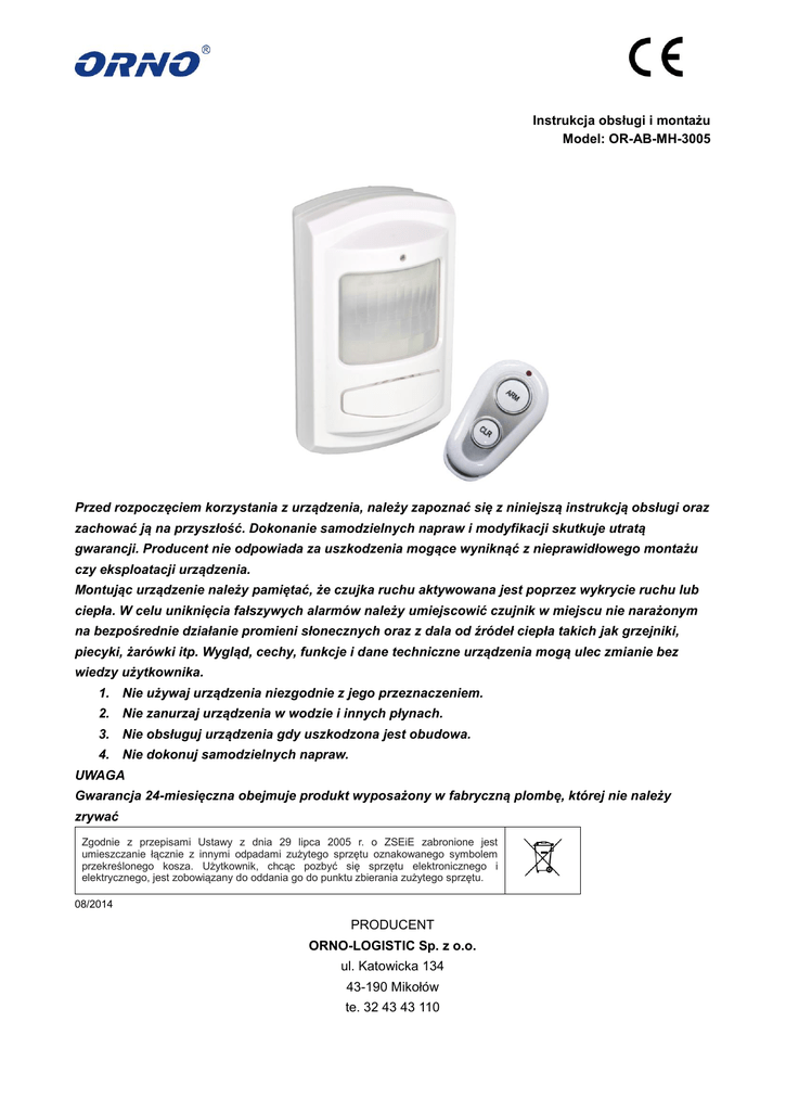 Instrukcja obsługi i montażu Model: OR-AB-MH-3005 Przed rozpoczęciem korzystania z urządzenia, należy zapoznać się z niniejszą instrukcją obsługi oraz zachować ją na przyszłość. Dokonanie samodzielnych napraw i modyfikacji skutkuje utratą gwarancji. Producent nie odpowiada za uszkodzenia mogące wyniknąć z nieprawidłowego montażu czy eksploatacji urządzenia. Montując urządzenie należy pamiętać, że czujka ruchu aktywowana jest poprzez wykrycie ruchu lub ciepła. W celu uniknięcia fałszywych alarmów należy umiejscowić czujnik w miejscu nie narażonym na bezpośrednie działanie promieni słonecznych oraz z dala od źródeł ciepła takich jak grzejniki, piecyki, żarówki itp. Wygląd, cechy, funkcje i dane techniczne urządzenia mogą ulec zmianie bez wiedzy użytkownika. 1. Nie używaj urządzenia niezgodnie z jego przeznaczeniem. 2. Nie zanurzaj urządzenia w wodzie i innych płynach. 3. Nie obsługuj urządzenia gdy uszkodzona jest obudowa. 4. Nie dokonuj samodzielnych napraw. UWAGA Gwarancja 24-miesięczna obejmuje produkt wyposażony w fabryczną plombę, której nie należy zrywać Zgodnie z przepisami Ustawy z dnia 29 lipca 2005 r. o ZSEiE zabronione jest umieszczanie łącznie z innymi odpadami zużytego sprzętu oznakowanego symbolem przekreślonego kosza. Użytkownik, chcąc pozbyć się sprzętu elektronicznego i elektrycznego, jest zobowiązany do oddania go do punktu zbierania zużytego sprzętu. 08/2014 PRODUCENT ORNO-LOGISTIC Sp. z o.o. ul. Katowicka 134 43-190 Mikołów te. 32 43 43 110 CHARAKTERYSTYKA: Urządzenie alarmowe z wbudowanym modułem GSM pozwalające na pełną kontrolę, za pomocą telefonu komórkowego, strzeżonych obiektów takich jak mieszkanie, dom jednorodzinny, biuro, firma, garaż, altana, sklep, magazyn, żaglówka itp. Urządzenie uruchamia syrenę w chwili wykrycia ruchu przez czujnik ruchu PIR, który przesyła SMS oraz automatycznie wybiera wskazany numer telefonu. Urządzenie można zsynchronizować z kamerą PIR, alarmem magnetycznym, syreną (opcja dodatkowa) itp. w celu tworzenia systemu ochrony. Budowa urządzenia (zestaw podstawowy) 1. Dioda LED 2. Czujnik ruchu PIR 3. Głośnik alarmu 4. Gniazdo na kartę SIM 5. Klawiatura 6. Mikrofon 7. Przycisk logowania „learning code” 8. Kieszeń na baterie 9. Wspornik montażowy rys 1 Czujnik ruchu 10. Dioda LED 11. Uzbrojenie 12. Rozbrojenie 13. Kieszeń na baterie 14. Przycisk logowania „learning code” rys. 2 Pilot bezprzewodowy Montaż baterii i karty SIM w zestawie podstawowym 1: Dostęp do komory baterii jest możliwy poprzez zdjęcie tylnej pokrywy z obudowy czujnika. W tym celu odkręć śruby zabezpieczające. 2: Włóż kartę SIM do gniazda (4) 3: Włóż trzy baterie alkaliczne typu „AA” (nie dołączono do zestawu) pamiętając o zachowaniu prawidłowej biegunowości. 4: Wraz z włożeniem ostatniej baterii sygnalizator wyemituje sygnał dźwiękowy wskazujący na ich poprawny montaż. 5: Załóż tylną pokrywę i zabezpiecz ją śrubą. UWAGA: 1: Usuń baterię, gdy zaświeci się czerwona kontrolka niskiego stanu baterii 2: Upewnij się, że karta SIM ma wyłączoną weryfikację kodu PIN. 2 Synchronizacja czujnika z pilotem Po zamontowaniu baterii w czujniku i w pilocie wciśnij i przytrzymaj przycisk LEARNING CODE (pamięci kodu) na czujniku (7), a następnie wciśnij i przytrzymaj przycisk LEARNING CODE pamięci kodu (14) na pilocie. Zwolnij przyciski po usłyszeniu dwóch sygnałów dźwiękowych, które wskazują na pomyślnie zsynchronizowanie czujnika z pilotem. Uwaga: W celu wyczyszczenia pamięci kodu wciśnij i przytrzymaj przycisk pamięci kodu (LEARNING CODE), a następnie usuń i ponownie zamontuj baterie. Czujnik wyemituje trzy dźwięki, które będą wskazywać na pomyślne usunięcie kodu z pamięci. Wszystkie operacje muszą następować bezpośrednio po sobie i nie wolno dopuścić do ponad 5-sekundowych odstępów pomiędzy nimi. Aktywacja klawiatury W celu aktywacji klawiatury wciśnij jeden raz przycisk pamięci kodu LEARNING CODE (7); korzystanie z klawiatury nie jest możliwe bez jego aktywacji. Po aktywowaniu klawiatury usłyszysz dźwięk „Di” w trakcie przyciskania klawiszy. Klawiatura ulegnie automatycznemu zablokowaniu po 15-sekundowym okresie bezczynności. Po zablokowaniu klawisze nie będą emitować dźwięków i klawiaturę należy aktywować ponownie. Uwaga: W trybie uzbrojenia klawiatura jest zawsze zablokowana. Wprowadzenie numerów telefonu: W trybie rozbrojenia wciśnij * 1+ numer telefonu + * w celu zapisania pierwszego numeru telefonu, po czym zielona dioda LED na sygnalizatorze zamruga trzykrotnie potwierdzając pomyślny zapis numeru. Wciśnij * 2+ numer telefonu + * w celu zapisania drugiego numeru Wciśnij * 3+ numer telefonu + * w celu zapisania trzeciego numeru Możliwe jest zapisanie maksymalnej liczby 3 telefonów o maksymalnej długości 17 cyfr. UWAGA: 1: Jeśli się pomylisz, po prostu powtórz opisaną powyżej operację. 2: W celu usunięcia numeru telefonu wciśnij ” *+n+*” (n oznacza nr 1-3), np. usunięcie pierwszego numeru odbywa się poprzez wciśnięcie ” *+1+*”., po czym zielona dioda LED na sygnalizatorze zamruga trzykrotnie w celu potwierdzenia pomyślnego usunięcia numeru. Aktywacja/deaktywacja funkcji SMS W trybie rozbrojonym wciśnij “#+9+#”, po czym usłyszysz jeden sygnał dźwiękowy “Di” wskazujący na deaktywację usługi SMS. W razie załączenia alarmu urządzenie jedynie wybierze wprowadzony numer bez wysyłania wiadomości SMS. W trybie rozbrojonym wciśnij ponownie “#+9+#”, po czym usłyszysz dwa sygnały dźwiękowe “Di” wskazujące na ponowną aktywację usługi SMS. W razie załączenia alarmu urządzenie wybierze wprowadzony numer i wyśle SMS. Ustawienie wiadomości głosowej W trybie rozbrojonym wciśnij “# + 1 + #”, po czym zapali się czerwona dioda LED i będziesz miał 6 sekund na nagranie wiadomości głosowej. Zgaśnięcie di