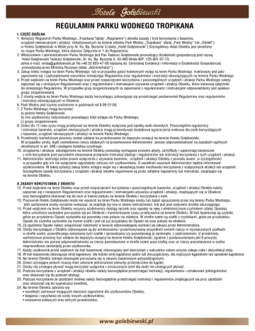 REGULAMIN PARKU WODNEGO TROPIKANA I. CZĘŚĆ OGÓLNA 1. Niniejszy Regulamin Parku Wodnego „Tropikana”(dalej: „Regulamin”) określa zasady i tryb korzystania z basenów, urządzeń rekreacyjnych i atrakcji zlokalizowanych na terenie obiektu Park Wodny „Tropikana” (dalej „Park Wodny” lub „Obiekt”) w Hotelu Gołębiewski w Wiśle przy Al. Ks. Bp. Bursche 3.(dalej „Hotel Gołębiewski”).Szczegółowy skład Obiektu jest określony na mapie Parku Wodnego, która stanowi Załącznik nr 1 do Regulaminu 2. Właścicielem i administratorem Parku Wodnego jest Pan Tadeusz Gołębiewski prowadzący działalność gospodarczą pod nazwą Hotel Gołębiewski Tadeusz Gołębiewski, Al. Ks. Bp. Bursche 3, 43-460 Wisła NIP: 125-001-07-73, adres e-mail: [email protected] Tel:+48 33 855-47-00 wpisaną do Centralnej Ewidencji i Informacji o Działalności Gospodarczej prowadzonej przez Ministra Rozwoju (dalej „Administrator”). 3. Zakup biletu wstępu na teren Parku Wodnego lub w przypadku gości hotelowych wstęp na teren Parku Wodnego traktowany jest jako zapoznanie się i zaakceptowanie warunków niniejszego Regulaminu oraz regulaminów i instrukcji obowiązujących na terenie Parku Wodnego. 4. Przed wejściem na teren Parku Wodnego oraz przed rozpoczęciem korzystania z poszczególnych urządzeń i atrakcji Parku Wodnego należy zapoznać się z niniejszym Regulaminem oraz z regulaminami i instrukcjami używania urządzeń i atrakcji Obiektu, które stanowią załączniki do niniejszego Regulaminu. W przypadku grup zorganizowanych za zapoznanie z regulaminami i instrukcjami odpowiedzialny jest opiekun grupy zorganizowanej. 5. Z chwilą wejścia na teren Parku Wodnego każdy korzystający zobowiązuje się przestrzegać postanowień Regulaminu oraz regulaminów i instrukcji obowiązujących w Obiekcie. 6. Park Wodny jest czynny codziennie w godzinach od 8.00-21:00. 7. Z Parku Wodnego mogą korzystać: a) goście Hotelu Gołębiewski, b) inni użytkownicy indywidualni posiadający bilet wstępu do Parku Wodnego, c) grupy zorganizowane. 8. Dzieci do 13 roku życia mogą przebywać na terenie Obiektu wyłącznie pod opieką osób dorosłych. Poszczególne regulaminy i instrukcje basenów, urządzeń rekreacyjnych i atrakcji mogą przewidywać dodatkowe ograniczenia wiekowe dla osób korzystających z basenów, urządzeń rekreacyjnych i atrakcji na terenie Parku Wodnego. 9. Przedmioty wartościowe powinny zostać oddane na przechowanie do depozytu recepcji na terenie Hotelu Gołębiewski. W przypadku utraty, bądź uszkodzenia rzeczy oddanych na przechowanie Administrator ponosi odpowiedzialność na zasadach ogólnych określonych w art. 846 i następne kodeksu cywilnego. 10. Urządzenia i atrakcje, udostępnione na terenie Obiektu posiadają wymagane prawem atesty, certyfikaty i zapewniają bezpieczne z nich korzystanie pod warunkiem stosowania przepisów instrukcji obsługi i regulaminów lub instrukcji korzystania z tych urządzeń i atrakcji. 11. Administrator zastrzega sobie prawo wyłączenia z używania basenów, urządzeń i atrakcji Obiektu z powodu awarii, w szczególności w przypadku gdy ich nie wyłączenie zagrażałoby zdrowiu ich użytkowników. O wszelkich awariach Administrator będzie informował użytkowników. W takiej sytuacji zakup biletu wstępu wiąże się z akceptacją braku możliwości korzystania z wyłączonych atrakcji lub urządzeń. Szczegółowe zasady korzystania z urządzeń i atrakcji obiektu regulowane są przez odrębne regulaminy lub instrukcje, znajdujące się na terenie Obiektu. II.ZASADY KORZYSTANIA Z OBIEKTU 12. Przed wejściem na teren Obiektu oraz przed rozpoczęciem korzystania z poszczególnych basenów, urządzeń i atrakcji Obiektu należy zapoznać się z niniejszym Regulaminem oraz regulaminami i instrukcjami używania urządzeń i atrakcji, znajdujących się w Obiekcie oraz bezwzględnie stosować się do nich w trakcie pobytu na terenie Obiektu i korzystania z nich. 13. Pracownik Hotelu Gołębiewski może nie wpuścić na teren Parku Wodnego osoby lub żądać opuszczenia przez nią terenu Parku Wodnego, jeśli zachowanie osoby wyraźnie wskazuje, że znajduje się ona w stanie nietrzeźwości lub jest pod wpływem środka odurzającego. 14. Przed wejściem na teren Obiektu wszyscy użytkownicy dostają ręcznik oraz opaskę na rękę z elektronicznym czytnikiem (dalej: Opaska), która umożliwia swobodne poruszanie się po Obiekcie i monitorowanie czasu przebywania na terenie Obiektu, W hali basenowej są czytniki, gdzie po przyłożeniu Opaski wyświetla się pozostały czas pobytu na obiekcie. W strefie szatni są szafki z czytnikami, gdzie po przyłożeniu Opaski do czytnika wyświetla się numer szafki i jest on już przypisany do Opaski na czas pobytu na obiekcie. 15. Za zgubienie Opaski należy uregulować należność w kwocie odpowiadającej wartości jej zakupu przez Administratora. 16. Osoby korzystające z Obiektu zobowiązane są do umieszczania i przechowywania wszystkich swoich rzeczy w wyznaczonych szafkach w strefie szatni, prawidłowego zamykania tych szafek i sprawdzania czy pozostawiają je zamknięte, z zastrzeżeniem, iż przedmioty wartościowe powinny być oddane do depozytu recepcji na terenie Hotelu Gołębiewski, zgodnie z postanowieniami pkt 9 powyżej. Administrator nie ponosi odpowiedzialności za rzeczy pozostawione w strefie szatni poza szafką oraz za rzeczy pozostawione w szafce nieprawidłowo zamkniętej przez użytkownika. 17. Każdy użytkownik przed wejściem do hali basenowej zobowiązany jest skorzystać z natrysków celem umycia całego ciała i dezynfekcji stóp. 18. W hali basenowej obowiązuje strój kąpielowy: dla kobiet strój kąpielowy jedno lub dwuczęściowy, dla mężczyzn kąpielówki lub spodenki kąpielowe. 19. Na terenie Obiektu istnieje obowiązek poruszania się w obuwiu basenowym antypoślizgowym. 20. Dzieci używające pieluch muszą mieć założone jednorazowe
