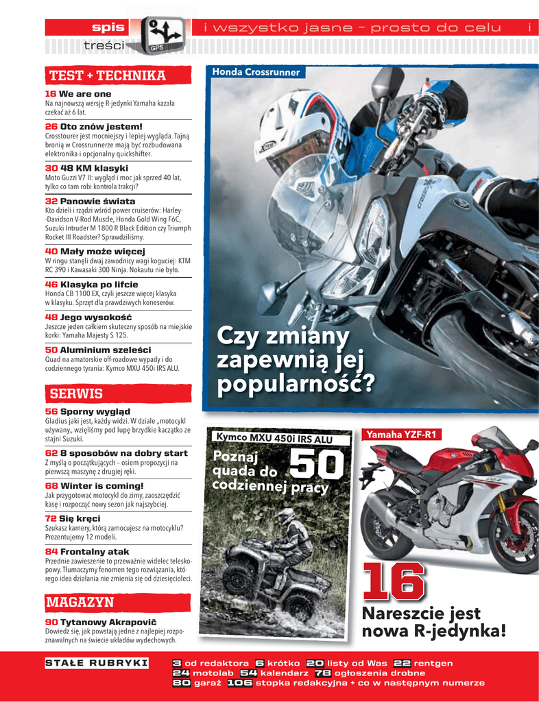 spis treści i wszystko jasne - prosto do celu TEST + TECHNIKA Honda Crossrunner 16 We are one Na najnowszą wersję R-jedynki Yamaha kazała czekać aż 6 lat. 26 Oto znów jestem! Crosstourer jest mocniejszy i lepiej wygląda. Tajną bronią w Crossrunnerze mają być rozbudowana elektronika i opcjonalny quickshifter. 30 48 KM klasyki Moto Guzzi V7 II: wygląd i moc jak sprzed 40 lat, tylko co tam robi kontrola trakcji? 32 Panowie świata Kto dzieli i rządzi wśród power cruiserów: Harley-Davidson V-Rod Muscle, Honda Gold Wing F6C, Suzuki Intruder M 1800 R Black Edition czy Triumph Rocket III Roadster? Sprawdziliśmy. 40 Mały może więcej W ringu stanęli dwaj zawodnicy wagi koguciej: KTM RC 390 i Kawasaki 300 Ninja. Nokautu nie było. 46 Klasyka po lifcie Honda CB 1100 EX, czyli jeszcze więcej klasyka w klasyku. Sprzęt dla prawdziwych koneserów. 48 Jego wysokość Jeszcze jeden całkiem skuteczny sposób na miejskie korki: Yamaha Majesty S 125. 50 Aluminium szeleści Quad na amatorskie off-roadowe wypady i do codziennego tyrania: Kymco MXU 450i IRS ALU. SERWIS Czy zmiany zapewnią jej popularność? 56 Sporny wygląd Gladius jaki jest, każdy widzi. W dziale „motocykl używany„ wzięliśmy pod lupę brzydkie kaczątko ze stajni Suzuki. 62 8 sposobów na dobry start Z myślą o początkujących – osiem propozycji na pierwszą maszynę z drugiej ręki. 68 Winter is coming! Jak przygotować motocykl do zimy, zaoszczędzić kasę i rozpocząć nowy sezon jak najszybciej. Kymco MXU 450i IRS ALU Yamaha YZF-R1 50 Poznaj quada do codziennej pracy 72 Się kręci Szukasz kamery, którą zamocujesz na motocyklu? Prezentujemy 12 modeli. 84 Frontalny atak Przednie zawieszenie to przeważnie widelec teleskopowy. Tłumaczymy fenomen tego rozwiązania, którego idea działania nie zmienia się od dziesięcioleci. MAGAZYN 90 Tytanowy Akrapovič Dowiedz się, jak powstają jedne z najlepiej rozpoznawalnych na świecie układów wydechowych. S TA Ł E R U B R Y K I 16 N Nareszcie jest n nowa R-jedynka! 3 od redaktora 6 krótko 20 listy od Was 22 rentgen 24 motolab 54 kalendarz 78 ogłoszenia drobne 80 garaż 106 stopka redakcyjna + co w następnym numerze i wszystko jasne - prosto do celu i wszystko jasne 92 Rzeka zjadła kawałek drogi 26 Czyli relacja z weekendowego wypadu z Warszawy w Bieszczady. Boczne drogi rządzą. 94 Albania to stan umysłu Deszczowy wyjazd naszych czytelników do jednego z najdłużej izolowanych od świata krajów w Europie. SPORT MotoGP 100 Dwóch braci – dwóch mistrzów 100 Wszystkie karty rozdane Walka na łokcie, podsumowanie i wielki sprawdzian przed kolejnym sezonem, czyli finał MotoGP na torze w Walencji. 104 Ta ostatnia niedziela Po ostatniej rundzie WSBK, rozegranej na torze Losail, pozostał niesmak. Co zabija sportowego ducha? Przegląd kamer 12 wielemających ustrojstw, które sprawdzą się podczas każdej przygody 72 Test power cruiserów 32 Maszyny, które zakrzywiają czasoprzestrzeń