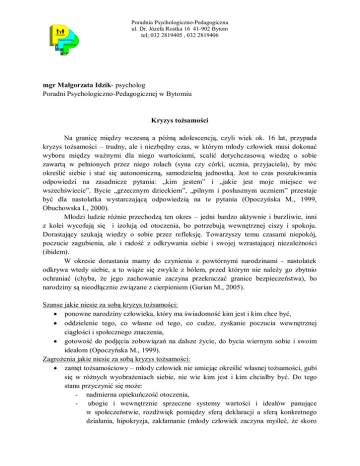 Poradnia Psychologiczno-Pedagogiczna ul. Dr. Józefa Rostka 16 41-902 Bytom tel; 032 2819405 , 032 2819406 mgr Małgorzata Idzik- psycholog Poradni Psychologiczno-Pedagogicznej w Bytomiu Kryzys tożsamości Na granicę między wczesną a późną adolescencją, czyli wiek ok. 16 lat, przypada kryzys tożsamości – trudny, ale i niezbędny czas, w którym młody człowiek musi dokonać wyboru między ważnymi dla niego wartościami, scalić dotychczasową wiedzę o sobie zawartą w pełnionych przez niego rolach (syna czy córki, ucznia, przyjaciela), by móc określić siebie i stać się autonomiczną, samodzielną jednostką. Jest to czas poszukiwania odpowiedzi na zasadnicze pytania: „kim jestem” i „jakie jest moje miejsce we wszechświecie”. Bycie „grzecznym dzieckiem”, „pilnym i posłusznym uczniem” przestaje być dla nastolatka wystarczającą odpowiedzią na te pytania (Opoczyńska M., 1999, Obuchowska I., 2000). Młodzi ludzie różnie przechodzą ten okres – jedni bardzo aktywnie i burzliwie, inni z kolei wycofują się i izolują od otoczenia, bo potrzebują wewnętrznej ciszy i spokoju. Dorastający szukają wiedzy o sobie przez refleksję. Towarzyszy temu czasami niepokój, poczucie zagubienia, ale i radość z odkrywania siebie i swojej wzrastającej niezależności (ibidem). W okresie dorastania mamy do czynienia z powtórnymi narodzinami - nastolatek odkrywa wtedy siebie, a to wiąże się zwykle z bólem, przed którym nie należy go zbytnio ochraniać (chyba, że jego zachowanie zaczyna przekraczać granice bezpieczeństwa), bo narodziny są nieodłącznie związane z cierpieniem (Gurian M., 2005). Szanse jakie niesie za sobą kryzys tożsamości: · ponowne narodziny człowieka, który ma świadomość kim jest i kim chce być, · oddzielenie tego, co własne od tego, co cudze, zyskanie poczucia wewnętrznej ciągłości i społecznego znaczenia, · gotowość do podjęcia zobowiązań na dalsze życie, do bycia wiernym sobie i swoim ideałom (Opoczyńska M., 1999). Zagrożenia jakie niesie za sobą kryzys tożsamości: · zamęt tożsamościowy – młody człowiek nie umiejąc określić własnej tożsamości, gubi się w różnych wyobrażeniach siebie, nie wie kim jest i kim chciałby być. Do tego stanu przyczynić się może: - nadmierna opiekuńczość otoczenia, - ubogie i wewnętrznie sprzeczne systemy wartości i ideałów panujące w społeczeństwie, rozdźwięk pomiędzy sferą deklaracji a sferą konkretnego działania, hipokryzja, zakłamanie (młody człowiek zaczyna myśleć, że skoro Poradnia Psychologiczno-Pedagogiczna ul. Dr. Józefa Rostka 16 41-902 Bytom tel; 032 2819405 , 032 2819406 wszystkie wartości są względne i nic nie jest wieczne ani absolutnie ważne, to znaczy, że nic nie nadaje się do budowania jego tożsamości), · tożsamość negatywna – młody człowiek definiuje siebie przez to, co społeczeństwo odrzuca i czego nie akceptuje, staje się tym, kim być nie powinien: chuliganem, przestępcą, narkomanem, prostytutką itp. Przyczyny takiego określenia siebie: - brak wskazówek pozwalających odpowiedzieć na pytanie „jak żyć” lub sprzeczność tych wskazówek, brak wartości, którym warto pozostać wiernym, - przekaz ze strony dorosłych, który mówi młodemu człowiekowi o tym, kim być nie może i nie powinien, bez wskazywania na to, kim może być i jakie ma perspektywy (wybiera wtedy jedyną „podpowiadaną” mu możliwość), - wpajanie młodemu człowiekowi takich ideałów, które są dla niego nieosiągalne i ponad jego możliwości, - negatywna i pełna uprzedzeń postawa otoczenia wobec dorastającego, przyklejenie mu etykietki „gorszego” lub „odmieńca” nie pasującego do powszechnie uznawanych wzorów („spisanie go na straty”, przekreślenie szans na zmianę), - zło, jakie zostaje wyrządzone dorastającemu przez oprawcę, często przypadkowego (ofiara staje się w późniejszym czasie oprawcą, by nie doświadczać więcej upokorzenia i porażek). Młody człowiek bardzo potrzebuje pozytywnych wzorców, wsparcia dorosłych w dokonywaniu wyborów, które zaciążą na jego dalszym życiu. Czasem dla przekory, czasem z rozczarowania tym, co zastaje w otaczającym go świecie, określa siebie w sposób, który pozostawia wiele do życzenia. Warto zadać sobie wtedy pytanie, jaki mają w tym udział dorośli i ilu z nich robi/zrobiło coś, by temu zapobiec. Bibliografia: · Gurian M., (2005), Zrozumieć nastolatka, Wydawnictwo Rebis · Obuchowska I., (2000), Adolescencja, w: Harwas – Napierała B., Trempała J., Psychologia rozwoju człowieka, T.2., Wydawnictwo Naukowe PWN, Warszawa · Opoczyńska M., (1999), Moratorium psychospołeczne – szansa czy zagrożenie dla rozwoju, w: Gałdowa A., Klasyczne i współczesne teorie osobowości, Wydawnictwo Uniwersytetu Jagiellońskiego, Kraków
