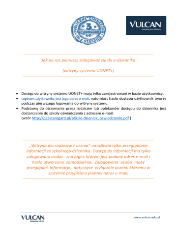 Jak po raz pierwszy zalogować się do e-dziennika (witryny systemu UONET+) Dostęp do witryny systemu UONET+ mają tylko zarejestrowani w bazie użytkownicy. Loginem użytkownika jest jego adres e‐mail, natomiast hasło dostępu użytkownik tworzy podczas pierwszego logowania do witryny systemu. Podstawą do otrzymania przez rodziców lub opiekunów dostępu do dziennika jest dostarczenie do szkoły oświadczenia z adresem e-mail. (wzór http://pg3starogard.pl/pliki/e-dziennik_oswiadczenie.pdf ) „Witryna dla rodziców / ucznia” umożliwia tylko przeglądanie informacji ze szkolnego dziennika. Dostęp do informacji ma tylko zalogowana osoba - zna login, którym jest podany adres e-mail i hasło utworzone samodzielnie. Zalogowana osoba może przeglądać informacje, dotyczące wyłącznie ucznia, któremu w systemie przypisano podany adres e-mail. www.vulcan.edu.pl Jak po raz pierwszy zalogować się do witryny systemu UONET+? 2/3 Aby po raz pierwszy zalogować się do e-dziennika: wprowadź adres https://uonetplus.vulcan.net.pl/starogardgdanski/ w oknie przeglądarki lub skorzystaj ze strony szkolnej http://pg3starogard.pl/ klikając w przycisk Wyświetli się powitalna strona systemu. Kliknij przycisk Załóż konto, a następnie wpisz adres e-mail, który podałeś wychowawcy. Zaznacz opcję Nie jestem robotem i kliknij przycisk Wyślij wiadomość. Sprawdź skrzynkę swojej poczty elektronicznej. Przeczytaj wiadomość i kliknij link podany w treści, aby nadać własne hasło. Istnieje możliwość, że poczta trafi do folderu SPAM, lub do zakładki inne) Wprowadź nowe hasło, którym będziesz się posługiwał, zaznacz opcję Nie jestem robotem i kliknij przycisk Ustaw nowe hasło. www.vulcan.edu.pl Jak po raz pierwszy zalogować się do witryny systemu UONET+? 3/3 Od tego momentu możesz logować się do systemu, korzystając z adresu e-mail i ustalonego przez siebie hasła. Przeglądaj informacje o swoim dziecku, otwierając poszczególne zakładki. Informacje na temat poruszania się w programie znajdziesz na zakładce Pomoc Nastąpi przekierowanie na stronę startową użytkownika. Zapoznaj się z informacjami zawartymi na stronie i przejdź do wybranego modułu, korzystając z odsyłaczy zawartych na stronie. www.vulcan.edu.pl