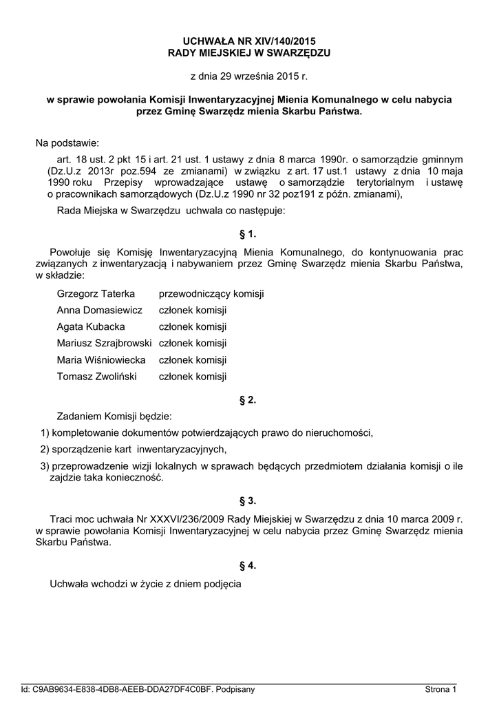 UCHWAŁA NR XIV/140/2015 RADY MIEJSKIEJ W SWARZĘDZU z dnia 29 września 2015 r. w sprawie powołania Komisji Inwentaryzacyjnej Mienia Komunalnego w celu nabycia przez Gminę Swarzędz mienia Skarbu Państwa. Na podstawie: art. 18 ust. 2 pkt 15 i art. 21 ust. 1 ustawy z dnia 8 marca 1990r. o samorządzie gminnym (Dz.U.z 2013r poz.594 ze zmianami) w związku z art. 17 ust.1 ustawy z dnia 10 maja 1990 roku Przepisy wprowadzające ustawę o samorządzie terytorialnym i ustawę o pracownikach samorządowych (Dz.U.z 1990 nr 32 poz191 z późn. zmianami), Rada Miejska w Swarzędzu uchwala co następuje: § 1. Powołuje się Komisję Inwentaryzacyjną Mienia Komunalnego, do kontynuowania prac związanych z inwentaryzacją i nabywaniem przez Gminę Swarzędz mienia Skarbu Państwa, w składzie: Grzegorz Taterka przewodniczący komisji Anna Domasiewicz członek komisji Agata Kubacka członek komisji Mariusz Szrajbrowski członek komisji Maria Wiśniowiecka członek komisji Tomasz Zwoliński członek komisji § 2. Zadaniem Komisji będzie: 1) kompletowanie dokumentów potwierdzających prawo do nieruchomości, 2) sporządzenie kart inwentaryzacyjnych, 3) przeprowadzenie wizji lokalnych w sprawach będących przedmiotem działania komisji o ile zajdzie taka konieczność. § 3. Traci moc uchwała Nr XXXVI/236/2009 Rady Miejskiej w Swarzędzu z dnia 10 marca 2009 r. w sprawie powołania Komisji Inwentaryzacyjnej w celu nabycia przez Gminę Swarzędz mienia Skarbu Państwa. § 4. Uchwała wchodzi w życie z dniem podjęcia Id: C9AB9634-E838-4DB8-AEEB-DDA27DF4C0BF. Podpisany Strona 1 UZASADNIENIE Proces komunalizacji mienia prowadzony jest przez gminy od 1990 r., tj. od momentu powstania samorządów. Gmina Swarzędz, w trybie przepisów ustawy z dnia 10 maja 1990r. – Przepisy wprowadzające ustawę o samorządzie terytorialnym i ustawę o pracownikach samorządowych (Dz.U. z 1990r. nr 32 poz. 191 z późn. zm.) sukcesywnie nabywa z mocy prawa własność nieruchomości, będących mieniem państwowym. Zgodnie z powołaną ustawą gminy sporządzają spisy inwentaryzacyjne mienia, które podlega nabyciu nieodpłatnie na jej rzecz. Realizacja zadań z zakresu komunalizacji mienia komunalnego – regulacji prawnej w stosunku do nieruchomości , które powinny stanowić własność gminy a pozostają we władaniu Skarbu Państwa została powierzona komisji inwentaryzacyjnej. Przedmiotem działania Komisji Inwentaryzacyjnej będzie kontynuowanie bez utrudnień prac związanych z inwentaryzacją i komunalizacją mienia na rzecz Gminy Swarzędz, to jest sporządzanie kart inwentaryzacyjnych oraz pozyskiwanie niezbędnej dokumentacji potwierdzającej prawo do nieruchomości w przypadku nieruchomości, które nie zostały dotąd objęte procesem komunalizacji (z uwagi na nieuregulowany stan prawny - np nieustalony numer księgi wieczystej). Zadaniem komisji będzie również regulowanie stanu prawnego nieruchomości, które zostały skomunalizowane na rzecz Gminy Swarzędz, a położone są w przebiegu dróg powiatowych, wojewódzkich lub krajowych i pozostają w zarządzie odpowiednich, według właściwości, organów. Ponadto Starostwo Powiatowe sukcesywnie ujawnia w ewidencji gruntów własność nieruchomości Skarbu Państwa i wskazuje działki, które powinny być własnością Gminy Swarzędz. Z uwagi na zmianę ustawy o samorządzie gminnym oraz mając na względzie konieczność zmiany składu osobowego komisji z powodu zaistniałych zmian kadrowych, zachodzi konieczność podjęcia powyższej uchwały. Id: C9AB9634-E838-4DB8-AEEB-DDA27DF4C0BF. Podpisany Strona 1