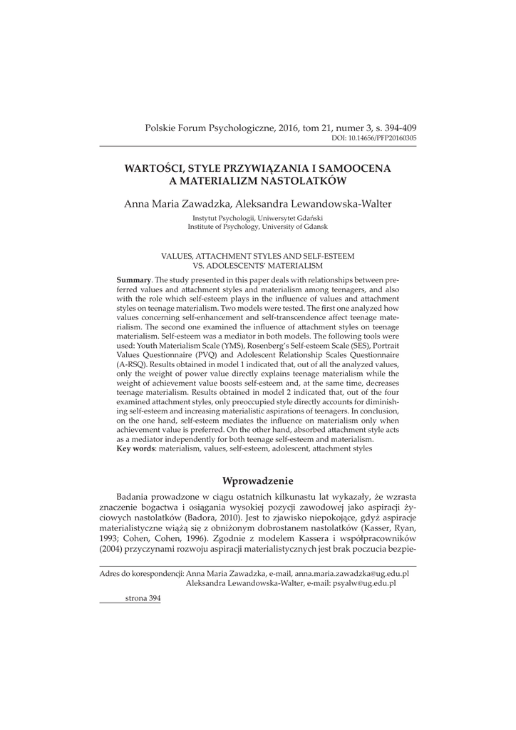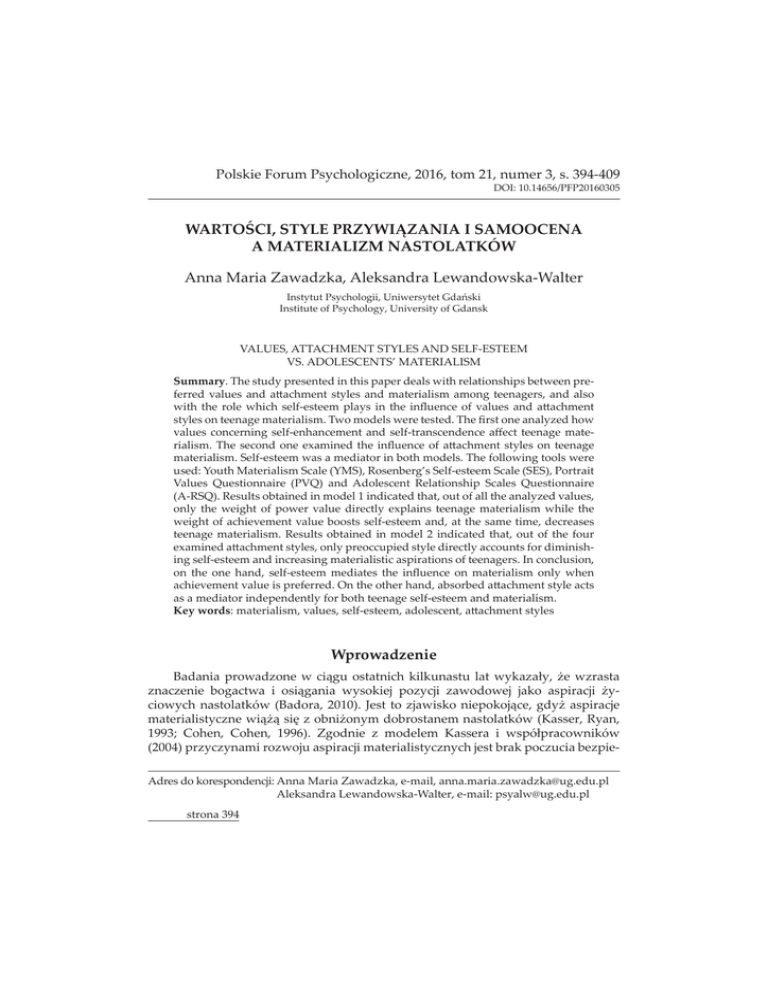 Polskie Forum Psychologiczne, 2016, tom 21, numer 3, s. 394-409 DZȱŗŖǯŗŚŜśŜȦŘŖŗŜŖřŖś gǰȱȱ&ȱȱȱ ȱȱX Anna Maria Zawadzka, Aleksandra Lewandowska-Walter ¢ȱ¢ǰȱ ¢ȱÚ Institute of Psychology, University of Gdansk VALUES, ATTACHMENT STYLES AND SELF-ESTEEM ǯȱȂȱ Summaryǯȱȱ¢ȱȱȱȱȱȱ ȱȱ ȱȱ ȱ ȱ Ĵȱ ¢ȱ ȱ ȱ ȱ ǰȱ ȱ ȱ ȱ ȱ ȱ ȱ Ȭȱ ¢ȱ ȱ ȱ Ěȱ ȱ ȱ ȱ Ĵȱ ¢ȱȱȱǯȱ ȱȱ ȱǯȱȱęȱȱ¢£ȱ ȱ ȱ ȱ Ȭȱ ȱ Ȭȱ ěȱ ȱ ǯȱ ȱ ȱ ȱ ¡ȱ ȱ Ěȱ ȱ Ĵȱ ¢ȱ ȱ ȱ ǯȱȬȱ ȱȱȱȱȱǯȱȱ ȱȱ ȱ DZȱȱȱȱǻǼǰȱȂȱȬȱȱǻǼǰȱȱ ȱ ȱ ǻǼȱ ȱ ȱ ȱ ȱ ȱ ǻȬǼǯȱȱȱȱȱŗȱȱǰȱȱȱȱȱ¢£ȱǰȱ ¢ȱ ȱ ȱ ȱ ȱ ȱ ¢ȱ ¡ȱ ȱ ȱ ȱ ȱ ȱȱȱȱȱȬȱǰȱȱȱȱǰȱȱ ȱ ǯȱ ȱ ȱ ȱ ȱ Řȱ ȱ ǰȱ ȱ ȱ ȱ ȱ ¡ȱĴȱ¢ǰȱ¢ȱȱ¢ȱ¢ȱȱȱing self-esteem and increasing materialistic aspirations of teenagers. In conclusion, ȱ ȱ ȱ ǰȱ Ȭȱ ȱ ȱ Ěȱ ȱ ȱ ¢ȱ ȱ ȱȱȱǯȱȱȱȱǰȱȱĴȱ¢ȱȱ ȱȱȱ¢ȱȱȱȱȬȱȱǯ Key wordsDZȱǰȱǰȱȬǰȱǰȱĴȱ¢ Wprowadzenie ȱ £ȱ ȱ ȱ ȱ ȱ ȱ ¢£Ù¢ǰȱ Čȱ £ȱ ££ȱ ȱ ȱ ȱ ¢ȱ £¢ȱ £ ȱ ȱ ȱ Č¢ ¢ȱ à ȱ ǻǰȱ ŘŖŗŖǼǯȱ ȱ ȱ £ ȱ ǰȱ ¢Čȱ ȱ ¢£ȱ Čȱ¿ȱ£ȱČ¢ȱȱà ȱǻǰȱ¢ǰȱ ŗşşřDzȱ ǰȱ ǰȱ ŗşşŜǼǯȱ ȱ £ȱ ȱ ȱ ȱ àÙ à ȱ ǻŘŖŖŚǼȱ£¢£¢ȱ£ ȱȱ¢£¢ȱȱȱ£ȱ£ȱȱDZȱȱȱȱ £ǰȱȬǰȱǯǯ£ £ȓǯǯȱ ȱ ȬǰȱȬDZȱ¢ ȓǯǯ strona 394 £Ú ǰȱ¿¢ȱȱȱ£ȱ ¢ȱ£ȱ¢£¢ǰȱȱDZȱ£ȱǰȱǰȱȱȱ£ȱ¢ǰȱ ȱà Čȱ£¢ȱȱ ïȱ¢£ǯȱȱ¢ȱȱ ȱ £°ǰȱȱ¢ȱ£¢ £ȱȱ ïȱ Čȱ¿ȱ£ȱ£ȱ nastolatków. ȱȱ£ £¢ȱȱȱ¢ȱ ¢£ǰȱČȱ£ȱà ȱ Čȱ¿ȱ£¢¢ ȱ£ȱȱȱǻȱȱǯǰȱŘŖŖŚDzȱǰȱǰȱ ŘŖŖŝǼȱ£ȱ¢¢ȱȱ£ȱ¢ȱǻǰȱǰȱŗşşŜǼǯȱȱǰȱ£ȱČȱïǰȱ Č ȱȱ¢Ù¢ȱÙ¢ȱ£ȱ£ǰȱȱČȱ¢ȱ £¢ £ȱȱ ïȱȱ°ȱȱ££ȱ ȱ£Ù ȱ¿ȱȱȱ¢£¢ǯȱ¢£ȱǰȱČȱȱ£ïȱ Čȱ¿ȱ£ȱ£ȱà ǯȱȱ£ȱǰȱ£¢ȱȱČȱ Ù°ȱ ¿ȱ ȱ £ £ȱ ¿£¢ȱ ¢ȱ ïȱ ȱ £ȱ £ȱ¿£¢ȱ¢ȱ£¢ £ȱǻ£¢ȱ¿ȱȱȱ£ȱ££Ú ȱȱȱ ȱȱ£ȱ¢Ǽȱȱ£ȱà ǯȱ£¢ȱ ¢Ùȱ£ȱČȱ£ǰȱ£¢ȱȱȱ ȱ£ £ȱ¿£¢ȱ ïȱȱ¢ȱ£¢ £ȱȱ£ȱǯ ¢ȱ¢Ùȱ ȱ àȱ Ùȱ ȱȱ £¢ȱȱȱ£ȱà ȱȱȱà ǯȱȱ £ǰȱ ȱ¢ȱ ¢ęȱ¿ȱ ¢ȱÚȱ £à ȱ ȱ ȱ ££ȱ ïȱ ȱ £Ù ȱ £ȱ Ù¢ǰȱ ȱ ȱ àȱ Ȯȱ à ǯȱ ȱ ǰȱ ȱ ȱ £ȱ ¿ǰȱ ȱ ££ȱ ȱ £Ù ȱ £ȱ ȱ ȱ ¢ȱ £¢ £ǰȱ £ȱ ȱȱ¢ȱȱ£ǯȱȱ£ǰȱ ȱ£ £¢ȱȱȱ¿ȱÙȱ ¢ȱ¢£ȱǰȱ£¢ȱ ïȱȱ¢ȱ£¢ £ȱȱ Ù¢ ȱȱ¿ȱǯȱȱ£ ǰȱ£ £ȱȱ£ ȱ°ǰȱ£ȱȱ ȱ¢ȱȱǰȱ£¢ȱ ¢¿ȱïȱ Ù¢ ǰȱ££ȱ¿ǰȱ ïȱ ȱ¢à ȱ£¢ £ȱȱ£ǯȱ Podstawy teoretyczne Materializm i samoocena £ȱ££ȱ£¢¢ ȱȱ££ȱȱàȱ ¢ȱǻǰȱŗşŞśDzȱǰȱ ǰȱŗşşŘǼǯȱ£ȱȱà ȱȱ¿ȱȱČǰȱ¢ ȱȱȱ££¢ȱ¢ǰȱČȱ¿£¢ǰȱ¢ȱȱ££¢ȱ¢ °ȱȱČȱ ȱ£¢£Ùïȱȱ£ à ǰȱàȱ £ ȱÙȱČ ï°ȱ ȱ £¢ȱǰȱ£ȱ¿ȱ¿£ȱ°ȱ ǻȱ ȱ ǯǰȱ ŘŖŖřǼǯȱ ȱ £ £¢ȱ ¢£ȱ Úȱ ¢ǰȱ Čȱ £ȱ Čȱ ¿ȱ £°ȱ £ȱ ȱ £ȱ ȱ ȱ Čȱ ǯȱ ȱ ȱ ¢£ȱ £Ùȱ ȱ ǻǰȱ ĵǰȱ ŗşŞŘǼȱ ȱ £¢£¢ȱ ȱ ȱ ǻǰȱ ĵǰȱ ŗşŞŗǼȱ ¢£ǰȱ Čȱ ¢ȱ ȱ ȱ ȱ ¢ȱ ǰȱ ȱ Čȱ £Ù°ȱ ȱ ¢ȱ ȱ ȱ ¢ǰȱ àȱ ȱ ¢£ǯȱ ȱ £ȱ Úȱ ȱ ȱ ȱ ȱ ǻ¢ǰȱ ǰȱ ŘŖŖŖǼȱ ¢ǰȱ Čȱ ¢ȱ ï°ȱ ȱ ȱ £Čǰȱ ȱ £ȱ ££ȱ¢ȱàǯȱȱȱ £ȱȱ¢ ¢ȱȱ ȱȱȱČȱ£ȱ Ùȱ ïȱǻǯȱǰȱǰȱŘŖŖśǼǰȱȱ£strona 395 ȱ£ȱȱȱȱ àÙ à ȱǻŘŖŖŚǼȱȱ£ȱ££Ú ǰȱ ¿¢ȱ ȱ £ȱ £ȱ ¢£¢ǰȱ ȱ DZȱ £ȱ ǰȱ ȱ Čȱ ¿ȱ £ȱ £ȱ ȱ ¢£¢ǯȱ £ȱ ȱ £ £ȱ ȱ ȱ ¢ȱ ȱ àȱ ¢Úȱ £ȱȱÙ£Č¢ȱ £ǰȱČȱČȱȱ Čȱ¿ȱ£ȱ ¢ȱ£ȱ £ȱǻǰȱǰȱŘŖŖŝǼǯȱȱ ¿ǰȱ ȱȱ£ ȱČȱ £ £ȱ£ȱ£ȱȱ ¢ȱ£ȱ£ȱ£ ¢ȱ¿¢ȱ ȱȱȱǻǯȱǰȱǰȱŘŖŖŝǼǯȱ£ǰȱČȱ ȱȱàĊȱ£Ú ȱȱ £ȱȱǻŗŘȬŗřȱǼǰȱ¢ȱȱǰȱ £ȱ £ȱ £ǯȱ ȱ ǰȱ ȱ ȱ àĊȱ ȱ ǻŗŜȬŗŞȱ Ǽǰȱ ¢ȱ ȱ £ǰȱ£ȱ£ȱà ȱǯȱȱà ČǰȱČȱ £ £ȱ¿£¢ȱȱȱ£ȱȱ££ȱ£¢ǰȱ¢ȱ¢ȱ ¿ȱǰȱČȱ¢ȱ¢ȱ¿ȱ ȱǻǰȱǰȱŘŖŗŗǼǯ ïǰȱ£ȱȱ ȱȱȱȱ¢ȱǻŗşşřǰȱŗşşŜǼȱ£ȱ¢ȱ¢£¢ȱ Čïǰȱ ȱ£¢ȱ¿ȱ£ȱȱČ¢ ¢ȱȮȱ ȱę ǰȱïȱ ȱ¢ïȱ棢£ǰȱ ȱà ȱȱ¢ȱà ȱǻǯȱǰȱ£ £ȱ £ȱ¢ǰȱ à ïǼǯȱïȱȱ£ȱȱȱȱǻǯȱ Ù£ȱ ȱ¿Ǽȱ¢£ȱȱȱȱȱ Ù¢ȱȱǻ ĵǰȱŗşşŘǼǯȱȱȱȱ¢ȱ ïȱ ȱȱ£ȱȱ£¢ ȱȱȱ ¢ȱȱȱȱ£ȱ£ȱČȱȱǰȱàȱï ȱȱ ȱČ¢ȱ £ȱàǯȱ£ ǰȱ ïȱ£ȱȱȱȱǻǯȱČ¢£ ï°ȱȱ £Ǽȱȱ¿ȱȱȱ¢ȱàǰȱ ¢£ȱ£ȱ Ùȱȱȱ¢ǯȱČȱ¿ȱȱ£ȱȱȱÙïȱ ȱȱČ£¢ǰȱȱČȱ¢ȱ£ȱȱ£¢¢ȱ£ȱȱȱ££ȱ ȱ ¢ǯȱ ȱ ȱ àȱ Ù¢ȱ £ ǰȱ Čȱ £ȱ ¢ȱ ïȱ£ȱȱȱȱ Čȱ¿ȱ£ȱ£ǰȱȱ ïȱ£ȱȱ ȱ ȱ Čȱ ¢¿ ȱ ȱ ¢£¢ȱ ǻǯȱ ǰȱĚǰȱŘŖŖŘDzȱȱȱǯǰȱŘŖŖŚDzȱ £ǰȱŘŖŖŜǼǯȱȱǰȱȱà ȱ £ǰȱ Čȱ ¢ȱ £ȱ ȱ ï°ȱ Ù£¢ȱ ǻ ï°ȱ £ȱȱȱǼǰȱȱȱ ïȱȱȱ££ȱǻ £ǰȱŘŖŗřǼǯȱ ȱ ȱ Úǰȱ àȱ £¢ Ù¢¢ȱ ȱ àȱ £ïȱ £ £ȱ ¢ȱ ïȱ ȱ ¢ǯȱ ȱ ȱ Úȱ ¢£¢ȱ ȱ ¢ȱ ȱ £ȱ ȱ ȱ ȱ £ȱ ¢ ¢£ȱ ǻ£ȱ Č£ȱ ȱ ȱ ȱ ę ȱ £Ǽȱ £ȱ ȱ ȱ Úȱ ¢£¢ȱ ¢à ȱ ¢ȱ Čȱ Čȱ £¢££°ǰȱ Čȱ ȱ ïȱ £ȱ ȱ ȱ ȱ ȱ °ȱ £ £ȱ £ȱ ǯȱ ȱ £ǰȱ £ȱ Úȱ ¢Úȱǻǯȱǰȱ¢ǰȱ¢ǰȱŗşşŝDzȱ ĴȱŘŖŖśǼȱ ¢ǰȱČȱ£ȱ ȱ£ȱ¢ ¢£ȱ£¢ȱ¿ȱ ȱȱ£ȱ£¢ £¢ °ȱ ¿ȱȱ ȱ¢ ïȱȱȱȱȱ¢ȱȱ¢ǰȱȱ¿ï°ȱ£ ȱ ¢ȱ¢ȱǻ£ȱȱȱ£ȱ ¢ȱ£¢ȱČȱǼȱȱČ¢ȱÙ£ȱǯȱȱǰȱ ¢àČȱ¿ȱ ȱ ¢¢ȱ¢¢ȱ ¢ȱ¢DZȱȱǻȬǼȱ strona 396 ȱȱȱǻȬǼȱǻǰȱ ǰȱŗşşśǼǯȱ¢ȱȱȱ¿ȱ ȱ ï £ȱ ȱ ȱ ¢ȱ £ǰȱ ȱ Ù¢ ȱ ȱ £ȱ ȱ ȱȱàȱ £ȱȱ ïȱ£ȱȱȱȱȮȱ Ù£¢ȱȱ¿°ȱ ǻǯȱȱ¿ȱȱȱ Ù¢ ȱȱǼǯȱȱȱ ¢ȱȱȱȱ¿ȱȱï £ȱȱȱ¢ȱÙ£ǰȱȱȱ£Ùȱȱ¢ȱ¢ȱ £ȱȱ ïȱ£ȱȱȱȱȮȱ £ȱȱČ¢£ ïȱ ǻǯȱȱȱȱ¢Ǽǰȱàȱȱ£ ȱȱ ïȱȱ ǯȱ ȱ ȱ ȱ ¢Čȱ £ ¢ȱ à ȱ £ȱ 