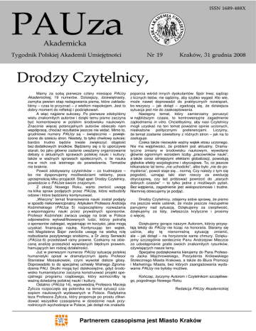 Drodzy Czytelnicy, Mamy za sobą pierwsze cztery miesiące PAUzy Akademickiej, 19 numerów. Dzisiejszy, dziewiętnasty, zamyka pewien etap redagowania pisma, które zakładaliśmy – czas to przyznać – z wielkim niepokojem. Jest to dobry moment do refleksji i podziękowań. A więc najpierw sukcesy. Po pierwsze zdobyliśmy wielu znakomitych autorów i dzięki temu pismo zaczyna być komentowane w polskim środowisku naukowym. Znacznie więcej potencjalnych autorów obiecało nam współpracę, chociaż rezultatów jeszcze nie widać. Mimo to, grudniowe numery PAUzy są – świątecznie – powiększone do sześciu stron. Niestety, to tylko chwilowy sukces: bardzo trudno będzie trwale zwiększyć objętość bez dodatkowych środków. Będziemy się o to uporczywie starali, bo jako główne zadanie uważamy organizowanie debaty o aktualnych sprawach polskiej nauki i kultury; także w ważnych sprawach społecznych, o ile nauka ma w nich coś istotnego do powiedzenia. Tematów nie braknie. Powoli zdobywamy czytelników – co trudniejsze – bo nie dysponujemy możliwościami reklamy, poza uprzejmością kilku przyjaciół. Stąd apel: Drodzy Czytelnicy, powiedzcie o PAUzie swoim znajomym. Z okazji Nowego Roku, warto zwrócić uwagę na kilka spraw podjętych przez PAUzę, które wzbudziły odzew i które będziemy kontynuować. „Wieczny” temat finansowania nauki został podjęty w sposób niekonwencjonalny. Artykułem Profesora Andrzeja Koźmińskiego (PAUza 5) rozpoczęliśmy rozważania o wspomaganiu nauki przez prywatnych sponsorów. Profesor Koźmiński zwraca uwagę na brak w Polsce odpowiednio wykwalifikowanych ludzi, którzy potrafią o sponsorów zabiegać, wyjaśniając im korzyści, jakie mogą uzyskać finansując naukę. Kontynuując ten wątek, red. Magdalena Bajer zwróciła uwagę na wielką rolę rozbudzania pozytywnego snobizmu, a Dr Jerzy Serwacki (PAUza 6) przedstawił ramy prawne. Czekamy na obiecaną analizę przeszkód wywołanych błędnym prawem, hamujących ten rodzaj działalności. Już w pierwszym numerze PAUzy sytuację polskiej humanistyki opisał w dramatycznym apelu Profesor Stanisław Mossakowski, czym wywołał dalsze głosy. Doprowadziło to do specjalnej uchwały Walnego Zgromadzenia PAU. Skutki mogą być dalekosiężne, gdyż środowisko humanistyczne zaczyna konstruować projekt specjalnego programu rządowego, który wzmocniłby tę ważną dziedzinę polskiej nauki i kultury. Ostatnio (PAUza 14), wypowiedzią Profesora Macieja Żylicza rozpoczęła się polemika na temat sytuacji czasopism naukowych wydawanych w Polsce. Radykalna teza Profesora Żylicza, który proponuje po prostu zlikwidować wszystkie czasopisma w dziedzinie nauk przyrodniczych wychodzące w Polsce, jak dotąd nie znalazła poparcia wśród innych dyskutantów. Spór trwa; sądząc z licznych listów, nie sądzimy, aby szybko wygasł. Kto wie, może nawet doprowadzi do praktycznych rozwiązań, bo wszyscy – jak dotąd – zgadzają się, że dzisiejsza sytuacja jest nie do zaakceptowania. Następny temat, który zamierzamy poruszyć w najbliższym czasie, to kontrowersyjne zagadnienie zapłodnienia in vitro. Chcielibyśmy, aby nasi Czytelnicy mogli uzyskać na ten temat poważne opinie uczonych, nieskażone politycznymi preferencjami. Liczymy, że temat zostanie oświetlony z różnych stron – jak na to zasługuje. Czeka także niezwykle ważny wątek etosu uczonego. Nie ma wątpliwości, że problem jest aktualny. Dramatyczne zmiany w środowisku naukowym, wywołane głównie ogromnym wzrostem liczby „pracowników nauki”, a także coraz silniejszymi efektami globalizacji, powodują głębokie efekty socjologiczne i obyczajowe. To, co jeszcze kilkanaście lat temu „nie uchodziło”, albo było „nie do pomyślenia”, powoli staje się... normą. Czy należy z tym się pogodzić, uznając taki stan rzeczy za ewolucję obyczajową, czy też próbować powrócić do „starych dobrych czasów” – to tylko jedne z możliwych pytań. Bez wątpienia, zagadnienie jest wielopoziomowe i trudne. Niemniej obiecujemy je podjąć. Drodzy Czytelnicy, zdajemy sobie sprawę, że pismo ma jeszcze wiele usterek, że może jeszcze niezupełnie panujemy nad sytuacją. Dziękujemy za cierpliwość, dziękujemy za listy, zwłaszcza krytyczne i prosimy o więcej. Dziękujemy gorąco naszym Autorom, którzy przysyłają teksty do PAUzy nie licząc na honoraria. Staramy się usilnie, aby tę nienormalną sytuację zmienić, ale – jak dotąd – na horyzoncie same chmury. Dziękujemy szczególnie serdecznie Panu Andrzejowi Mleczce za udostępnianie gratis swoich znakomitych rysunków, ożywiających nasze łamy. Specjalne podziękowania kierujemy do Pana Profesora Jacka Majchrowskiego, Prezydenta Królewskiego Stołecznego Miasta Krakowa, a także do Biura Promocji i Marketingu Miasta, bez których zaangażowania wydawanie PAUzy nie byłoby możliwe. Kończąc, życzymy Autorom i Czytelnikom szczęśliwego, pogodnego Nowego Roku. Redakcja PAUzy Akademickiej Partnerem czasopisma jest Miasto Kraków