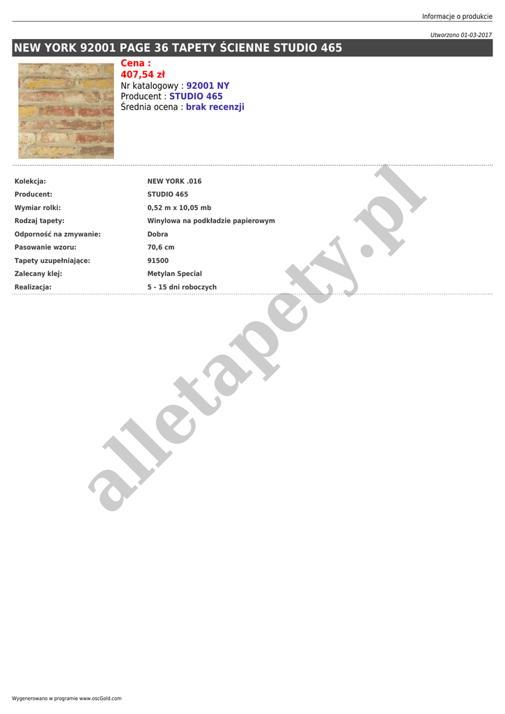 Informacje o produkcie Utworzono 01-03-2017 NEW YORK 92001 PAGE 36 TAPETY ŚCIENNE STUDIO 465 Cena : 407,54 zł NEW YORK .016 Producent: STUDIO 465 Wymiar rolki: 0,52 m x 10,05 mb Rodzaj tapety: Winylowa na podkładzie papierowym Odporność na zmywanie: Dobra Pasowanie wzoru: 70,6 cm Tapety uzupełniające: 91500 Zalecany klej: Metylan Special Realizacja: 5 - 15 dni roboczych al le ta pe ty Kolekcja: .p l Nr katalogowy : 92001 NY Producent : STUDIO 465 Średnia ocena : brak recenzji Wygenerowano w programie www.oscGold.com