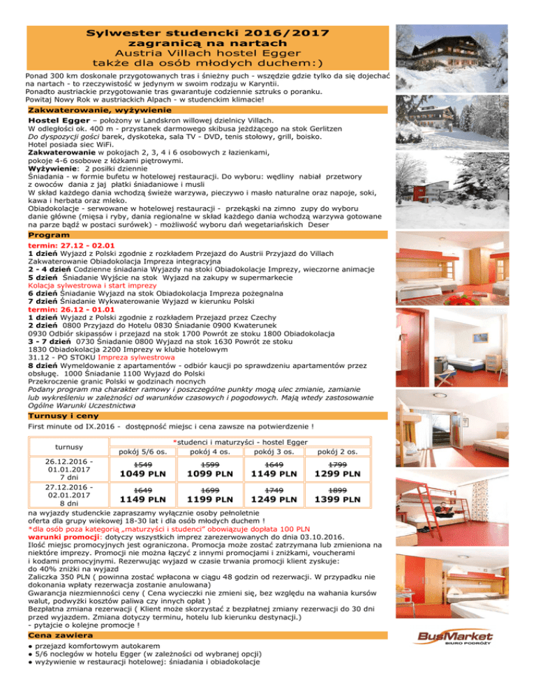 Sylwester studencki 2016/2017 zagranicą na nartach Austria Villach hostel Egger także dla osób młodych duchem:) Ponad 300 km doskonale przygotowanych tras i śnieżny puch - wszędzie gdzie tylko da się dojechać na nartach - to rzeczywistość w jedynym w swoim rodzaju w Karyntii. Ponadto austriackie przygotowanie tras gwarantuje codziennie sztruks o poranku. Powitaj Nowy Rok w austriackich Alpach - w studenckim klimacie! Zakwaterowanie, wyżywienie Hostel Egger – położony w Landskron willowej dzielnicy Villach. W odległości ok. 400 m - przystanek darmowego skibusa jeżdżącego na stok Gerlitzen Do dyspozycji gości barek, dyskoteka, sala TV - DVD, tenis stołowy, grill, boisko. Hotel posiada siec WiFi. Zakwaterowanie w pokojach 2, 3, 4 i 6 osobowych z łazienkami, pokoje 4-6 osobowe z łóżkami piętrowymi. Wyżywienie: 2 posiłki dziennie Śniadania - w formie bufetu w hotelowej restauracji. Do wyboru: wędliny nabiał przetwory z owoców dania z jaj płatki śniadaniowe i musli W skład każdego dania wchodzą świeże warzywa, pieczywo i masło naturalne oraz napoje, soki, kawa i herbata oraz mleko. Obiadokolacje - serwowane w hotelowej restauracji - przekąski na zimno zupy do wyboru danie główne (mięsa i ryby, dania regionalne w skład każdego dania wchodzą warzywa gotowane na parze bądź w postaci surówek) - możliwość wyboru dań wegetariańskich Deser Program termin: 27.12 - 02.01 1 dzień Wyjazd z Polski zgodnie z rozkładem Przejazd do Austrii Przyjazd do Villach Zakwaterowanie Obiadokolacja Impreza integracyjna 2 - 4 dzień Codzienne śniadania Wyjazdy na stoki Obiadokolacje Imprezy, wieczorne animacje 5 dzień Śniadanie Wyjście na stok Wyjazd na zakupy w supermarkecie Kolacja sylwestrowa i start imprezy 6 dzień Śniadanie Wyjazd na stok Obiadokolacja Impreza pożegnalna 7 dzień Śniadanie Wykwaterowanie Wyjazd w kierunku Polski termin: 26.12 - 01.01 1 dzień Wyjazd z Polski zgodnie z rozkładem Przejazd przez Czechy 2 dzień 0800 Przyjazd do Hotelu 0830 Śniadanie 0900 Kwaterunek 0930 Odbiór skipassów i przejazd na stok 1700 Powrót ze stoku 1800 Obiadokolacja 3 - 7 dzień 0730 Śniadanie 0800 Wyjazd na stok 1630 Powrót ze stoku 1830 Obiadokolacja 2200 Imprezy w klubie hotelowym 31.12 - PO STOKU Impreza sylwestrowa 8 dzień Wymeldowanie z apartamentów - odbiór kaucji po sprawdzeniu apartamentów przez obsługę. 1000 Śniadanie 1100 Wyjazd do Polski Przekroczenie granic Polski w godzinach nocnych Podany program ma charakter ramowy i poszczególne punkty mogą ulec zmianie, zamianie lub wykreśleniu w zależności od warunków czasowych i pogodowych. Mają wtedy zastosowanie Ogólne Warunki Uczestnictwa Turnusy i ceny First minute od IX.2016 - dostępność miejsc i cena zawsze na potwierdzenie ! turnusy pokój 5/6 os. *studenci i maturzyści - hostel Egger pokój 4 os. pokój 3 os. pokój 2 os. 26.12.2016 1549 1599 1649 1799 01.01.2017 1049 PLN 1099 PLN 1149 PLN 1299 PLN 7 dni 27.12.2016 1649 1699 1749 1899 02.01.2017 1149 PLN 1199 PLN 1249 PLN 1399 PLN 8 dni na wyjazdy studenckie zapraszamy wyłącznie osoby pełnoletnie oferta dla grupy wiekowej 18-30 lat i dla osób młodych duchem ! *dla osób poza kategorią „maturzyści i studenci” obowiązuje dopłata 100 PLN warunki promocji: dotyczy wszystkich imprez zarezerwowanych do dnia 03.10.2016. Ilość miejsc promocyjnych jest ograniczona. Promocja może zostać zatrzymana lub zmieniona na niektóre imprezy. Promocji nie można łączyć z innymi promocjami i zniżkami, voucherami i kodami promocyjnymi. Rezerwując wyjazd w czasie trwania promocji klient zyskuje: do 40% zniżki na wyjazd Zaliczka 350 PLN ( powinna zostać wpłacona w ciągu 48 godzin od rezerwacji. W przypadku nie dokonania wpłaty rezerwacja zostanie anulowana) Gwarancja niezmienności ceny ( Cena wycieczki nie zmieni się, bez względu na wahania kursów walut, podwyżki kosztów paliwa czy innych opłat ) Bezpłatna zmiana rezerwacji ( Klient może skorzystać z bezpłatnej zmiany rezerwacji do 30 dni przed wyjazdem. Zmiana dotyczy terminu, hotelu lub kierunku destynacji.) - pytajcie o kolejne promocje ! Cena zawiera ● przejazd komfortowym autokarem ● 5/6 noclegów w hotelu Egger (w zależności od wybranej opcji) ● wyżywienie w restauracji hotelowej: śniadania i obiadokolacje ● bal sylwestrowy w hotelu (gorące posiłki, szwedzki stół, szampan, fajerwerki) ● codzienne transfery na różne stoki: Moltaler Gletsher (lodowiec) Gerlitzen Bad Kleinkirchheim Nassfeld ● opiekę kadry ● program animacyjny ● SMS-owy serwis informacyjny (wiadomości wyjazdowe na Twoja komórkę ● bagaż główny: 1 sztuka, bagaż podręczny 1 sztuka (dokładne info poniżej) Cena nie zawiera dopłaty obowiązkowe: ● ubezpieczenia KL, NNW, SKI (70 PLN - doliczane do umowy) ● opłat klimatycznych około 10 € (40 PLN - doliczane do umowy) ● kaucja: 25 € / os. (płatne w autokarze) - kaucja zwracana ostatniego dnia jeżeli nie zostały wyrządzone żadne szkody opcjonalnie (decyzja i opłata przed wyjazdem): ● skipass (zaliczka na konto + płatność w € w autokarze): Gerlitzen 5 dni (183 EUR | zaliczka 15 EUR=65 PLN) Gerlitzen 6 dni (202 EUR | zaliczka 15 EUR=65 PLN) Top Gold 5 dni (201 EUR | zaliczka 15 EUR=65 PLN) Top Gold 6 dni (224 EUR | zaliczka 15 EUR=65 PLN) ● kaucja za skipass 5 € - płatne w autokarze ( kaucja zwrotna Oficjalne ceny skipassu (5 dniowy) 205 € - dla osób urodzonych między 1951 - 1996 rokiem 164 € - dla osób urodzonych między 1997 - 2000 rokiem Ważne! Możliwość zakupu karnetu ze zniżką! Prosimy zaznaczać chęć zakupu skipassu maksymalnie do 3 dni przed rozpoczęciem imprezy. Po upływie tego terminu nie ma możliwości zakupu, zwrotu ani wymiany karnetu. Potwierdzeniem wyboru będzie wpłata zaliczki (65 zł doliczane do umowy). Kwota ta (15 €) zostanie odjęta od ceny, którą należy zapłacić na miejscu do naszego rezydenta. Promocyjne ceny przy zakupie karnetu: 20