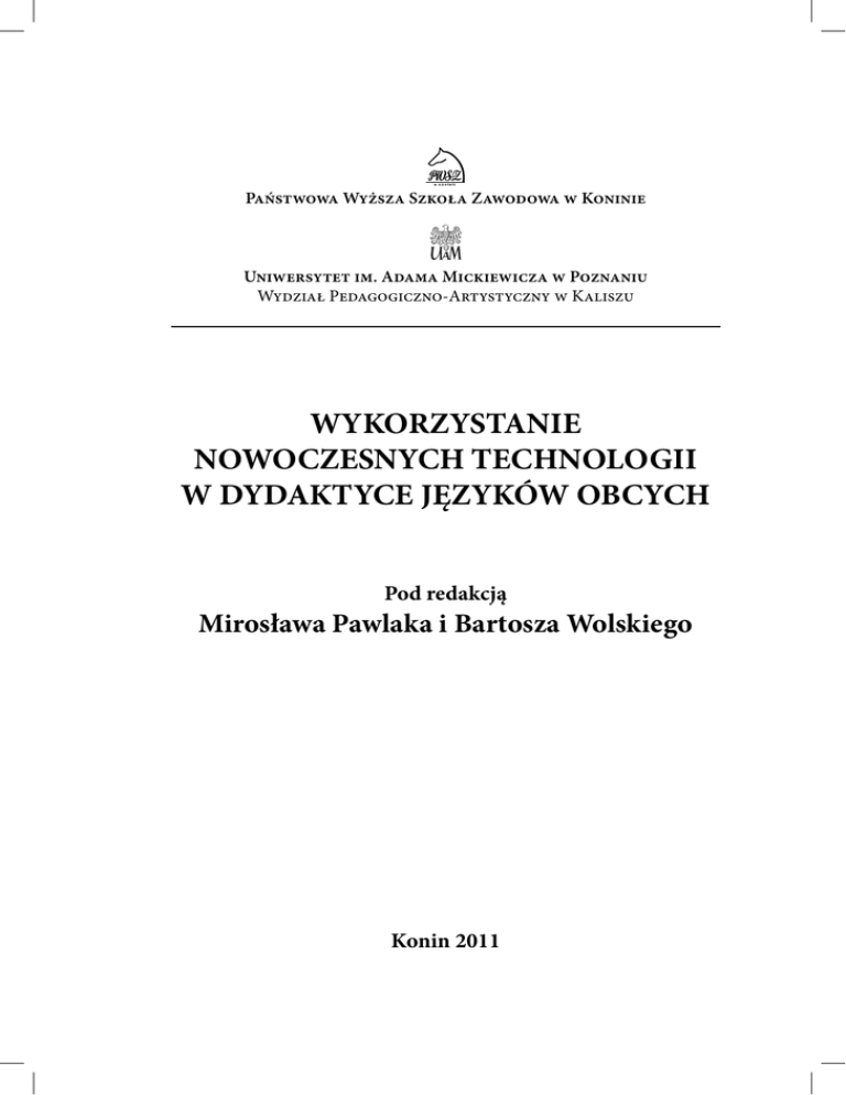 Państwowa Wyższa Szkoła Zawodowa w Koninie Uniwersytet im. Adama Mickiewicza w Poznaniu Wydział Pedagogiczno-Artystyczny w Kaliszu WYKORZYSTANIE NOWOCZESNYCH TECHNOLOGII W DYDAKTYCE JĘZYKÓW OBCYCH Pod redakcją Mirosława Pawlaka i Bartosza Wolskiego Konin 2011 Tytuł Wykorzystanie nowoczesnych technologii w dydaktyce języków obcych Autorzy Wiesława Ferlacka, Katarzyna Gramsz, Jarosław Krajka, Mariusz Kruk, Mirosław Pawlak, Arkadiusz Rojczyk, Anna Turula, Małgorzata Twardoń, Włodzimierz Sobkowiak, Bogusława Whyatt, Bartosz Wolski Recenzja naukowa prof. dr hab. Halina Widła Rada Wydawnicza prof. nadzw. dr hab. Wojciech Poznaniak – przewodniczący, prof. nadzw.dr hab. Jan Grzesiak prof. PWSZ, dr Marek Naglewski, prof. nadzw.dr hab. Mirosław Pawlak, prof. dr hab. Marian Walczak, mgr inż. Ewa Kapyszewska – sekretarz Rady Redakcja i korekta Maria Sierakowska Projekt okładki Agnieszka Jankowska Łamanie i skład Krzysztof Przybylak Druk i oprawa SOWA Sp. z o.o. ul. Hrubieszowska 6a 01-209 Warszawa tel. 022 431 81 40, fax 022 431 81 50 e-mail: [email protected] ISBN 978-83-88335-68-6 © Copyright by Państwowa Wyższa Szkoła- Zawodowa w Koninie © Wydział Pedagogiczno-Artystyczny UAM w Poznaniu Wydawnictwo Państwowej Wyższej Szkoły Zawodowej w Koninie ul. kard. S. Wyszyńskiego 3C, 62-510 Konin tel. 63-249-72-09 e-mail: [email protected] oraz Wydzial Pedagogiczno-Artystyczny w Kaliszu Uniwersytet im. Adama Mickiewicza w Poznanniu 62-800 Kalisz, al. Nowy Świat 28-30 tel. 62-767-07-30, fax 62-764-57-21 Spis treści Wstęp 5 Część I Nowoczesne technologie w nauczaniu podsystemów i sprawności języka Mirosław Pawlak Nowoczesne technologie a uczenie się i nauczanie gramatyki 9 Jarosław Krajka Nauczanie sprawności pisania w środowisku elektronicznym – od procesora tekstu do wiki 31 Małgorzata Twardoń Multimedia na lekcji języka obcego. Przykład wykorzystania programów narzędziowych do tworzenia interaktywnych i multimedialnych pomocy do nauki języków obcych 47 Część II Programy, narzędzia, aplikacje Arkadiusz Rojczyk Wykorzystanie programu do analizy mowy w nauce wymowy języka obcego: nagłosowy kontrast dźwięczności w języku angielskim 65 Bogusława Whyatt Wzmacnianie autorefleksji językowej wśród studentów neofilologii. Translog jako nowoczesna technologia pozwalająca na wgląd w proces tworzenia tekstu 75 4 Wykorzystanie nowoczesnych technologii … Mariusz Kruk Wykorzystanie internetowych narzędzi autorskich w nauczaniu języków obcych 91 Wiesława Ferlacka, Włodzimierz Sobkowiak Indeks trudności fonetycznej a elektroniczne książki RA Z 103 Włodzimierz Sobkowiak „Happiness I hadn't felt before", czyli nauka języków obcych w Drugim Życiu 123 Część III Nowoczesne technologie w kształceniu nauczycieli-filologów Anna Turula Nauczyciel języków obcych jutro: O wykorzystaniu nowych technologii w kształceniu przyszłych nauczycieli 133 Bartosz Wolski Problem jakości źródeł internetowych w kontekście studiów filologicznych. Propozycja pragmatyki ewaluacyjnej. 145 Katarzyna Gramsz Kształtowanie kompetencji informacyjno – medialnej nauczycieli i studentów kierunków neofilologicznych warunkiem efektywnego wykorzystywania technologii informacyjno-komunikacyjnych w dydaktyce161