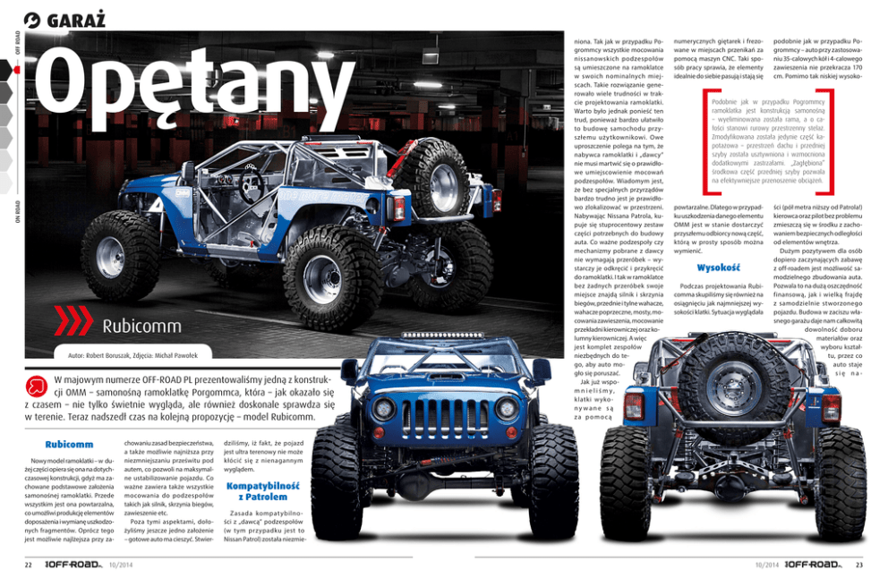 Opętany ON ROAD OFF ROAD GARAŻ Rubicomm Autor: Robert Boruszak, Zdjęcia: Michał Pawołek W majowym numerze OFF-ROAD PL prezentowaliśmy jedną z konstrukcji OMM – samonośną ramoklatkę Porgommca, która – jak okazało się z czasem – nie tylko świetnie wygląda, ale również doskonale sprawdza się w terenie. Teraz nadszedł czas na kolejną propozycję – model Rubicomm. Rubicomm Nowy model ramoklatki – w dużej części opiera się ona na dotychczasowej konstrukcji, gdyż ma zachowane podstawowe założenia samonośnej ramoklatki. Przede wszystkim jest ona powtarzalna, co umożliwi produkcję elementów doposażenia i wymianę uszkodzonych fragmentów. Oprócz tego jest możliwie najlżejsza przy za- 22 chowaniu zasad bezpieczeństwa, a także możliwie najniższa przy niezmniejszaniu prześwitu pod autem, co pozwoli na maksymalne ustabilizowanie pojazdu. Co ważne zawiera także wszystkie mocowania do podzespołów takich jak silnik, skrzynia biegów, zawieszenie etc. Poza tymi aspektami, dołożyliśmy jeszcze jedno założenie – gotowe auto ma cieszyć. Stwier- 10/2014 niona. Tak jak w przypadku Pogrommcy wszystkie mocowania nissanowskich podzespołów są umieszczone na ramoklatce w swoich nominalnych miejscach. Takie rozwiązanie generowało wiele trudności w trakcie projektowania ramoklatki. Warto było jednak ponieść ten trud, ponieważ bardzo ułatwiło to budowę samochodu przyszłemu użytkownikowi. Owe uproszczenie polega na tym, że nabywca ramoklatki i „dawcy” nie musi martwić się o prawidłowe umiejscowienie mocowań podzespołów. Wiadomym jest, że bez specjalnych przyrządów bardzo trudno jest je prawidłowo zlokalizować w przestrzeni. Nabywając Nissana Patrola, kupuje się stuprocentowy zestaw części potrzebnych do budowy auta. Co ważne podzespoły czy mechanizmy pobrane z dawcy nie wymagają przeróbek – wystarczy je odkręcić i przykręcić do ramoklatki. I tak w ramoklatce bez żadnych przeróbek swoje miejsce znajdą silnik i skrzynia biegów, przednie i tylne wahacze, wahacze poprzeczne, mosty, mocowania zawieszenia, mocowanie przekładni kierowniczej oraz kolumny kierowniczej. A więc jest komplet zespołów niezbędnych do tego, aby auto mogło się poruszać. Jak już wspom ni e liśmy, klatki w ykony wane są za pomocą numerycznych giętarek i frezowane w miejscach przenikań za pomocą maszyn CNC. Taki sposób pracy sprawia, że elementy idealnie do siebie pasują i stają się podobnie jak w przypadku Pogrommcy – auto przy zastosowaniu 35-calowych kół i 4-calowego zawieszenia nie przekracza 170 cm. Pomimo tak niskiej wysoko- Podobnie jak w przypadku Pogrommcy ramoklatka jest konstrukcją samonośną – wyeliminowana została rama, a o całości stanowi rurowy przestrzenny stelaż. Zmodyfikowana została jedynie część kapotażowa – przestrzeń dachu i przedniej szyby została usztywniona i wzmocniona dodatkowymi zastrzałami. „Zagłębiona” środkowa część przedniej szyby pozwala na efektywniejsze przenoszenie obciążeń. powtarzalne. Dlatego w przypadku uszkodzenia danego elementu OMM jest w stanie dostarczyć przyszłemu odbiorcy nową część, którą w prosty sposób można wymienić. Wysokość Podczas projektowania Rubicomma skupiliśmy się również na osiągnięciu jak najmniejszej wysokości klatki. Sytuacja wyglądała ści (pół metra niższy od Patrola!) kierowca oraz pilot bez problemu zmieszczą się w środku z zachowaniem bezpiecznych odległości od elementów wnętrza. Dużym pozytywem dla osób dopiero zaczynających zabawę z off-roadem jest możliwość samodzielnego zbudowania auta. Pozwala to na dużą oszczędność finansową, jak i wielką frajdę z samodzielnie stworzonego pojazdu. Budowa w zaciszu własnego garażu daje nam całkowitą dowolność doboru materiałów oraz wyboru kształtu, przez co auto staje się na- dziliśmy, iż fakt, że pojazd jest ultra terenowy nie może kłócić się z nienagannym wyglądem. Kompatybilność z Patrolem Zasada kompat ybilno ści z „dawcą” podzespołów (w tym przypadku jest to Nissan Patrol) została niezmie- 10/2014 23 RUBICOMM – dane technicznoeksploatacyjne » Silnik Nissan Patrol RD28 » Skrzynia biegów Nissan Patrol Y60 » Skrzynia rozdzielcza Nissan Patrol Y60 » Zawieszenie przednie szt y wny most Nissan Patrol sprężyny i amortyzatory +4 cale, Amada Xtreme przeznaczone do Nissana Patrola z dodatkowymi zbiornikami gazu » Zawieszenie tylne sztywny most Nissan Patrol, sprężyny i amortyzatory +4 cale, Amada Xtreme przeznaczone do Nissana Patrola z dodatkowymi zbiornikami gazu ????????????????? ????????????????????????????????????? (kilka cennych kilogramów) udało się obniżyć środek ciężkości, co sprawiło, że auto jest jeszcze bardziej „przyklejone” do nawierzchni, po której się porusza. Wnętrze » Układ kierowniczy przekładnia kierownicza i kolumna kierownicza 100% – Nissan Patrol Y60 » Koła opony Maxxis Creepy Crawler 77/14.5/15, felgi Enkei 10x15 » Nadwozie oryginalne poszycie – Jeep Wrangler Rubicon » Układ hamulcowy oryginalny od Nissana Patrola, pompy hamulcowe podzielone na dwie sekcje: przednia i tylna, skierowane do wewnątrz kabiny; hamulec ręczny zamiast bębnowego – tarczowy, uruchamiany hydraulicznie » Wymiary i masy długość x szerokość x wysokość – 3 900 x 2 060 x 1 630 mm, rozstaw osi – 2 750 mm, wysokość kabiny – 1 100 mm, Masa kompletnej klatki – 187 kg ????????????????? ????????????????????????????????????? kiego rozwiązania polega na tym, że poszycie zewnętrzne to niezmienione blachy dostępne również w formie zamienników. Wnętrze to natomiast panele aluminiowe, mocowane za pomocą specjalnych łączników (całość nie wymaga spawania), co obniża koszt budowy, ale również – co istotne – umożliwia szybki całkowity demontaż wnętrza (np. w celu serwisu pomiędzy sezonami). Dla ułatwienia budowy wnętrze zostało zaprojektowane w t