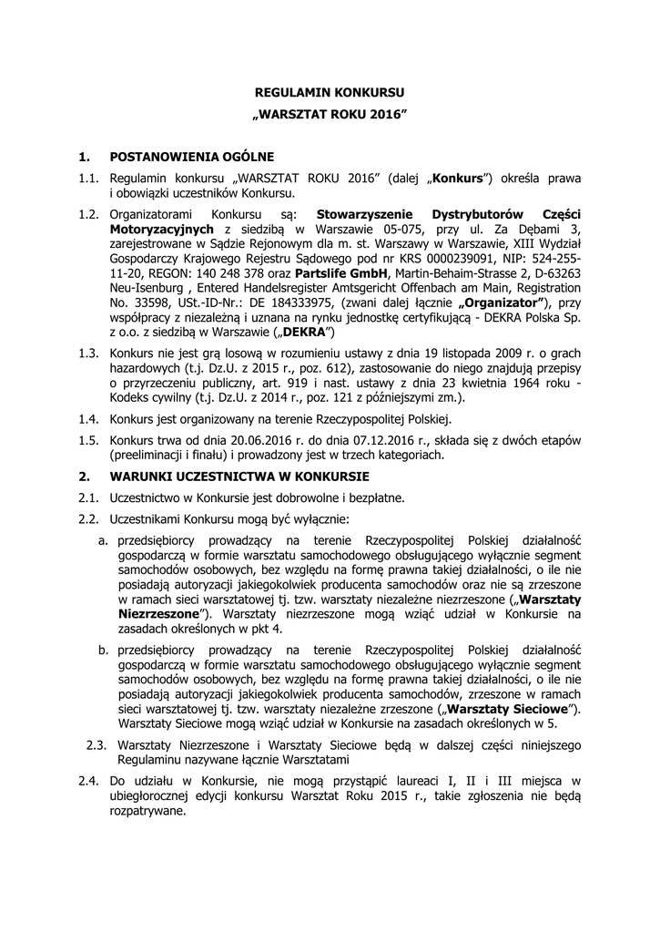 REGULAMIN KONKURSU „WARSZTAT ROKU 2016” 1. POSTANOWIENIA OGÓLNE 1.1. Regulamin konkursu „WARSZTAT ROKU 2016” (dalej „Konkurs”) określa prawa i obowiązki uczestników Konkursu. 1.2. Organizatorami Konkursu są: Stowarzyszenie Dystrybutorów Części Motoryzacyjnych z siedzibą w Warszawie 05-075, przy ul. Za Dębami 3, zarejestrowane w Sądzie Rejonowym dla m. st. Warszawy w Warszawie, XIII Wydział Gospodarczy Krajowego Rejestru Sądowego pod nr KRS 0000239091, NIP: 524-25511-20, REGON: 140 248 378 oraz Partslife GmbH, Martin-Behaim-Strasse 2, D-63263 Neu-Isenburg , Entered Handelsregister Amtsgericht Offenbach am Main, Registration No. 33598, USt.-ID-Nr.: DE 184333975, (zwani dalej łącznie „Organizator”), przy współpracy z niezależną i uznana na rynku jednostkę certyfikującą - DEKRA Polska Sp. z o.o. z siedzibą w Warszawie („DEKRA”) 1.3. Konkurs nie jest grą losową w rozumieniu ustawy z dnia 19 listopada 2009 r. o grach hazardowych (t.j. Dz.U. z 2015 r., poz. 612), zastosowanie do niego znajdują przepisy o przyrzeczeniu publiczny, art. 919 i nast. ustawy z dnia 23 kwietnia 1964 roku Kodeks cywilny (t.j. Dz.U. z 2014 r., poz. 121 z późniejszymi zm.). 1.4. Konkurs jest organizowany na terenie Rzeczypospolitej Polskiej. 1.5. Konkurs trwa od dnia 20.06.2016 r. do dnia 07.12.2016 r., składa się z dwóch etapów (preeliminacji i finału) i prowadzony jest w trzech kategoriach. 2. WARUNKI UCZESTNICTWA W KONKURSIE 2.1. Uczestnictwo w Konkursie jest dobrowolne i bezpłatne. 2.2. Uczestnikami Konkursu mogą być wyłącznie: a. przedsiębiorcy prowadzący na terenie Rzeczypospolitej Polskiej działalność gospodarczą w formie warsztatu samochodowego obsługującego wyłącznie segment samochodów osobowych, bez względu na formę prawna takiej działalności, o ile nie posiadają autoryzacji jakiegokolwiek producenta samochodów oraz nie są zrzeszone w ramach sieci warsztatowej tj. tzw. warsztaty niezależne niezrzeszone („Warsztaty Niezrzeszone”). Warsztaty niezrzeszone mogą wziąć udział w Konkursie na zasadach określonych w pkt 4. b. przedsiębiorcy prowadzący na terenie Rzeczypospolitej Polskiej działalność gospodarczą w formie warsztatu samochodowego obsługującego wyłącznie segment samochodów osobowych, bez względu na formę prawna takiej działalności, o ile nie posiadają autoryzacji jakiegokolwiek producenta samochodów, zrzeszone w ramach sieci warsztatowej tj. tzw. warsztaty niezależne zrzeszone („Warsztaty Sieciowe”). Warsztaty Sieciowe mogą wziąć udział w Konkursie na zasadach określonych w 5. 2.3. Warsztaty Niezrzeszone i Warsztaty Sieciowe będą w dalszej części niniejszego Regulaminu nazywane łącznie Warsztatami 2.4. Do udziału w Konkursie, nie mogą przystąpić laureaci I, II i III miejsca w ubiegłorocznej edycji konkursu Warsztat Roku 2015 r., takie zgłoszenia nie będą rozpatrywane. 3. KATEGORIE 3.1. Konkurs prowadzony jest w 3 kategoriach („Kategorie”): a) Kategoria I – Warsztat Mały. Kategoria ta przeznaczona jest dla Warsztatów posiadających od 1 - 3 stanowisk naprawczych; b) Kategoria II – Warsztat Średni. Kategoria ta przeznaczona jest dla Warsztatów posiadających od 4 –-6 stanowisk naprawczych; c) Kategoria III – Warsztat Duży. Kategoria ta przeznaczona jest dla Warsztatów posiadających powyżej 6 stanowisk naprawczych. 4. ZASADY ZGŁOSZENIA DO KONKURSU WARSZTATÓW NIEZRZESZONYCHPREELIMINACJE 4.1. W celu wzięcia udziału w Konkursie Warsztat Niezrzeszony powinien przesłać poprawne i kompletne zgłoszenie konkursowe, które stanowi Załącznik nr 1 do Regulaminu („Formularz”). Formularz należy wypełnić i przesłać za pośrednictwem strony www.motofocus.pl, na której Formularz został udostępniony. Dokonać zgłoszenia konkursowego może wyłącznie osoba uprawniona do reprezentowania i składania oświadczeń woli w imieniu Warsztatu Niezrzeszonego. Wypełnione powinny zostać wszystkie wymagane pola Formularza. Zgłoszenia niekompletne nie będą rozpatrywane. 4.2. Kwalifikacji Warsztatu Niezrzeszonego do konkretnej Kategorii dokonuje Organizator, na podstawie informacji zawartych w Formularzu. 4.3. Organizator będzie przyjmować zgłoszenia konkursowe Warsztatów Niezrzeszonych w terminie od dnia 20.06.2016 r. do dnia 20.09.2016 r. 4.4. Spośród nadesłanych zgłoszeń Organizator wybierze 6 Warsztatów – po 2 z każdej Kategorii („Finaliści”), które uzyskały największą liczbę punktów obliczonych na podstawie danych zawartych w Formularzu, Warsztaty te zostaną zakwalifikowane do Finału Konkursu. 5. ZASADY ZGŁOSZENIA PREELIMIMINACJE DO KONKURSU WARSZTATÓW SIECIOWYCH - 5.1. Warsztaty Sieciowe mogą zgłosić się do Konkursu wyłącznie, za pośrednictwem sieci warsztatowej, w której są zrzeszone („Sieć”). Sieć uczestnicząca w konkursie akceptuje warunki przystąpienia do konkursu. 5.2. Sieć chcąca zgłosić swoje warsztaty w Konkursie powinna skontaktować się z Organizatorem za pośrednictwem wiadomości e-mail przesłanej na adres e-mail [email protected]. Organizator w odpowiedzi prześle Sieci wzór Formularza, w oparciu o który Sieć dokona preeliminacji we własnym zakresie tj., wyłoni swoich reprezentantów – maksymalnie po dwa w każdej z Kategorii, o których mowa w pkt 3. („Finaliści Sieciowi”). 5.3. Sieć zobowiązana jest zgłosić Organizatorowi wyłonionych przez siebie Finalistów Sieciowych w terminie do dnia 20.09.2016 r., przesyłając kompletnie i prawidłowo wypełnione Formularze wybranych przez siebie Finalistów Sieciowych. Sieć zobowiązana jest uzyskać dla siebie i dla Organizatora zgodę na przetwarzanie danych osobowych przedsiębiorców prowadzących Warsztaty Sieciowe w celach związanych z prowadzeniem Konkursu i ogłoszeniem jego Zwycięzców. 5.4. Zgłoszenie niekompletne lub przesłane po upływie terminu wskazanego w pkt 5.3. powyżej nie będą rozpatrywane. 5.5. Za wszelkie niepraw
