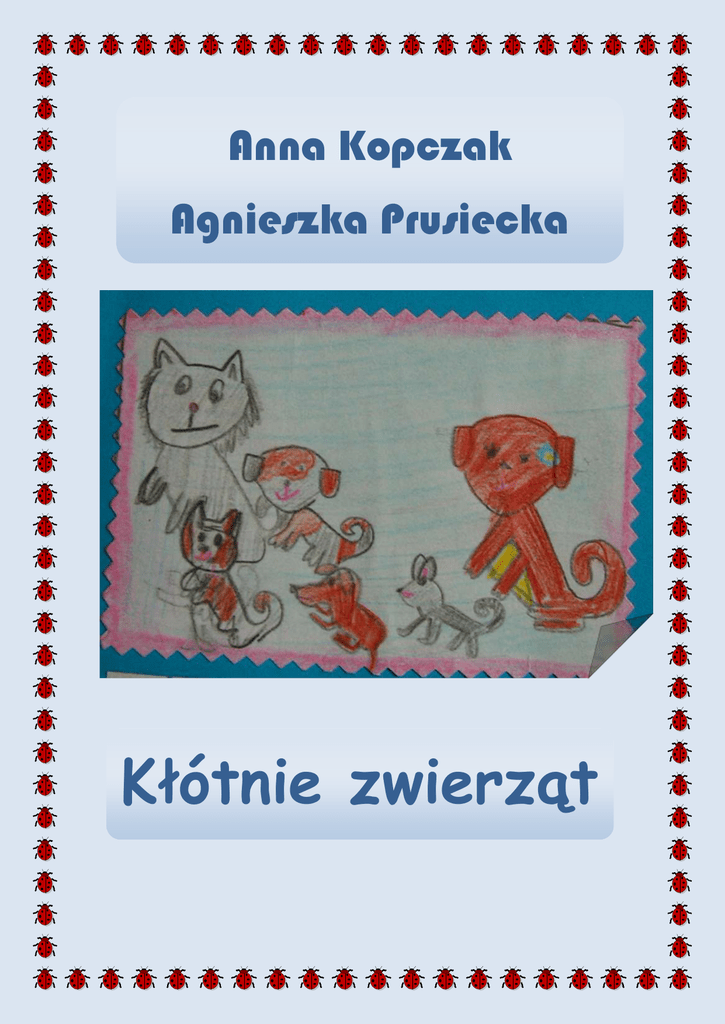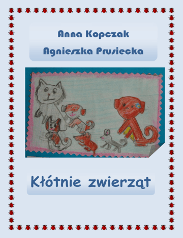 Anna Kopczak Agnieszka Prusiecka Kłótnie zwierząt Ania Kopczyk Agnieszka Prusiecka Pięć miesięcy temu psy, koty i inne zwierzęta się kłóciły. Wreszcie sowa powiedziała do nich: „Już dwa dni się kłócicie, wreszcie przestańcie!”. Pies powiedział, że kot mu zabrał miejsce do spania. Chomiki i szczur, mysz i zając, żółw i ślimak wszystkie zwierzęta się kłóciły. Sowa patrzyła na te zwierzęta, które się kłóciły i myślała w głowie: „Kiedy one zrozumieją, że nie wolno się kłócić z przyjaciółmi?”. Nagle piesek haski Tina, zobaczyła ślicznego wilczura, który wabił się Pluto. I wprost niezmiernie go pokochała. Po chwili podeszła do niego i zapytała się czy chcę z nią pójść na randkę do parku w cieniu drzew. Pluto zgodził się i zakochali się w sobie od pierwszego wejrzenia. Tina piesek haski chciała mieć z nim małe szczeniaczki. chciał je nazwać szczeniątka Timon. Wilczur Róża Jak i małe szczeniątka wyszły na świat okazało się, że to byli dwaj dwie chłopcy i dziewczynki. Wilczur pomyślał sobie tak: „Dwa imiona już nadaliśmy, a pozostałe nazywać będą się Azor i Misia”. Dzieci wyrosły na duże pieski. Wreszcie Tina sobie przypomniała, że się nadal kłóci z kotem. Po pary minutach podeszła do kotka z którym się pokłóciła i zapytała go: „Czy chcesz ze mną pójść na spacer i z moim mężem i dziećmi?”. „Bardzo chętnie” – powiedział kotek. „Ale najpierw mnie przeproś” powiedziała Tina. Kotek powiedział do niej: „Przepraszam, przepraszam”. „Bardzo dziękuję. Obiecuję, że nie będę się z Tobą kłóciła”, „Ja też obiecuję, że nie będę się z Tobą kłócił”. I w ten sposób wszystkie zwierzaki się pogodziły. I wszyscy żyli długo i szczęśliwie w przyjaźni.