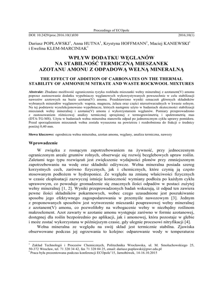 Proceedings of ECOpole DOI: 10.2429/proc.2016.10(1)030 2016;10(1) Dariusz POPŁAWSKI1, Anna HUTNA1, Krystyna HOFFMANN1, Maciej KANIEWSKI1 i Ewelina KLEM-MARCINIAK1 WPŁYW DODATKU WĘGLANÓW NA STABILNOŚĆ TERMICZNĄ MIESZANEK AZOTANU AMONU Z ODPADOWĄ WEŁNĄ MINERALNĄ THE EFFECT OF ADDITION OF CARBONATES ON THE THERMAL STABILITY OF AMMONIUM NITRATE AND WASTE ROCKWOOL MIXTURES Abstrakt: Zbadano możliwość ograniczenia ryzyka rozkładu mieszanki wełny mineralnej z azotanem(V) amonu poprzez zastosowanie dodatku wypełniaczy węglanowych wykorzystywanych powszechnie w celu stabilizacji nawozów azotowych na bazie azotanu(V) amonu. Przedstawiono wyniki oznaczeń głównych składników wybranych minerałów węglanowych: wapnia, magnezu, żelaza oraz części nieroztwarzalnych w kwasie solnym. Na tej podstawie wyselekcjonowano wypełniacze, których następnie użyto w badaniach skuteczności stabilizacji mieszanek wełny mineralnej i azotanu(V) amonu z wykorzystaniem węglanów. Pomiary przeprowadzono z zastosowaniem różnicowej analizy termicznej sprzężonej z termograwimetrią i spektrometrią mas (DTA-TG-MS). Użyta w badaniach wełna mineralna stanowiła odpad po jednorocznym cyklu uprawy pomidora. Przed sporządzeniem mieszanek wełna została wysuszona na powietrzu i rozdrobniona do frakcji o średnicy poniżej 0,40 mm. Słowa kluczowe: ogrodnicza wełna mineralna, azotan amonu, węglany, analiza termiczna, nawozy Wprowadzenie W związku z rosnącym zapotrzebowaniem na żywność, przy jednoczesnym ograniczonym areale gruntów rolnych, obserwuje się rozwój bezglebowych upraw roślin. Zaletami tego typu rozwiązań jest zwiększenie wydajności plonów przy zmniejszonym zapotrzebowaniu na wodę oraz składniki odżywcze. Wełna mineralna posiada szereg korzystnych cech, zarówno fizycznych, jak i chemicznych, które czynią ją często stosowanym podłożem w hydroponice. Ze względu na zmianę właściwości fizycznych w czasie eksploatacji zazwyczaj istnieje konieczność wymiany podłoża po każdym cyklu uprawowym, co powoduje gromadzenie się znacznych ilości odpadów w postaci zużytej wełny mineralnej [1, 2]. Wyniki przeprowadzonych badań wskazują, iż odpad ten zawiera pewne ilości składników pokarmowych, wobec czego uzasadnione jest poszukiwanie sposobu jego efektywnego zagospodarowania w przemyśle nawozowym [3]. Jednym z proponowanych sposobów jest wytworzenie mieszanki pouprawowej wełny mineralnej z azotanem(V) amonu, co pozwoliłoby na wzbogacenie wełny w niezbędny roślinom makroelement. Azot zawarty w azotanie amonu występuje zarówno w formie azotanowej, dostępnej dla roślin bezpośrednio po aplikacji, jak i amonowej, która pozostaje w glebie i może zostać wykorzystana w późniejszym czasie, gdy ulegnie procesowi nitryfikacji [4]. Wełna mineralna ze względu na swój skład jest termicznie stabilna. Zjawiska obserwowane podczas jej ogrzewania to kolejno: odparowanie wody w temperaturze 1 Zakład Technologii i Procesów Chemicznych, Politechnika Wrocławska, ul. M. Smoluchowskiego 25, 50-372 Wrocław, tel. 71 320 34 42, fax 71 328 04 25, email: [email protected] * Praca była prezentowana podczas konferencji ECOpole’15, Jarnołtówek, 14-16.10.2015 274 Dariusz Popławski, Anna Hutna, Krystyna Hoffmann, Maciej Kaniewski i Ewelina Klem-Marciniak poniżej 200°C, utlenianie organicznego lepiszcza rozpoczynające się w temperaturze 230°C oraz utlenianie grup krzemowych powyżej 650°C. Rolę lepiszcza pełnią związki organiczne, takie jak odpowiednio dobrane żywice fenolowo-formaldehydowe i dodawane są one na etapie wytwarzania wełny w ilościach 2-4% mas. [5, 6]. Gwałtowny rozkład azotanu amonu obserwuje się w temperaturze powyżej 200°C. W określonych warunkach może mieć on charakter wybuchowy. Dodatkowo dekompozycję azotanu amonu mogą katalizować takie zanieczyszczenia, jak kwasy nieorganiczne, jony chlorkowe i jony metali lub niektóre substancje organiczne [7, 8]. W związku z tym obecność różnego rodzaju zanieczyszczeń stanowi potencjalne źródło zagrożenia niekontrolowanym rozkładem azotanu amonu. Jak zostało stwierdzone, połączenie azotanu amonu z wełną mineralną, w zależności od zastosowanych proporcji, może wpływać na zmniejszenie stabilności termicznej mieszanki w stosunku do pojedynczych substratów. Prawdopodobnie jest to skutek utleniania przez azotan amonu organicznego lepiszcza zawartego w wełnie [9]. W przemyśle nawozowym w celu stabilizacji azotanu amonu stosuje się minerały węglanowe, co dodatkowo zapobiega nadmiernemu zakwaszeniu gleby oraz wzbogaca ją w wapń i magnez [10, 11]. Wybór minerału o odpowiedniej zawartości węglanów oraz korzystnym stosunku CaO/MgO jest kwestią kluczową, ponieważ zasadniczo wpływa na stabilność termiczną mieszanek nawozowych [10]. Działanie węglanów polega na reakcji z azotanem amonu w warunkach jego rozkładu. Uproszczony przebieg tych reakcji przedstawiają równania (1) i (2): CaCO3 + 2NH4NO3 → Ca(NO3)2 + 2NH3 + H2O + CO2 (1) MgCO3 + 2NH4NO3 → Mg(NO3)2 + 2NH3 + H2O + CO2 (2) Wydzielający się amoniak skutecznie inhibituje proces dalszego rozkładu azotanu amonu w zakresie niższych temperatur [12]. Powyższe działanie surowców węglanowych daje podstawę do zbadania ich wpływu na stabilność termiczną mieszanek azotanu amonu i odpadowej wełny mineralnej. Metodyka badań Do badań wykorzystano wełnę mineralną będącą odpadem po jednorocznym cyklu uprawy pomidora, wysuszoną na powietrzu i rozdrobnioną do frakcji poniżej 0,40 mm. W celu doboru minerału węglanowego o odpowiednich właściwościach przeprowadzono oznaczenia zawartości wapnia i magnezu dla pięciu wybranych surowców. Roztwarzanie przeprowadzano w mineralizatorze Kjeldatherm KB8S-BS firmy Gerhardt. Do kolb Kjeldahla odważano po około 5 g surowca węglanowego, zwilżano go wodą, dodawano niewielkiej ilości stężonego kwasu azotowego(V) i chwilę ogrz