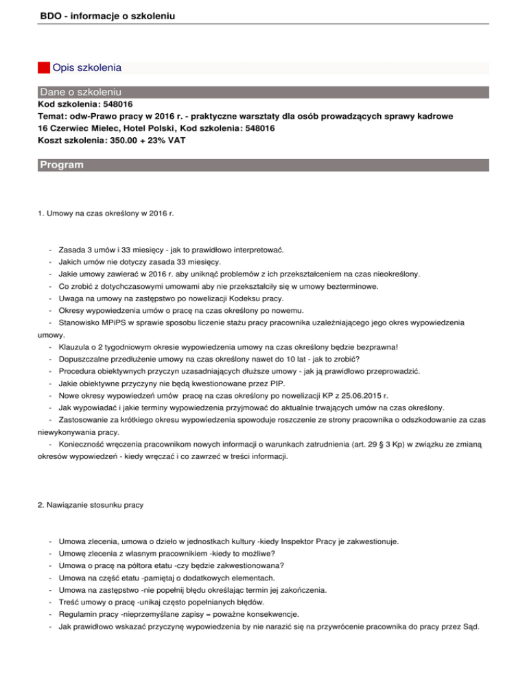 BDO - informacje o szkoleniu Opis szkolenia Dane o szkoleniu Kod szkolenia: 548016 Temat: odw-Prawo pracy w 2016 r. - praktyczne warsztaty dla osób prowadzących sprawy kadrowe 16 Czerwiec Mielec, Hotel Polski, Kod szkolenia: 548016 Koszt szkolenia: 350.00 + 23% VAT Program 1. Umowy na czas określony w 2016 r. - Zasada 3 umów i 33 miesięcy - jak to prawidłowo interpretować. - Jakich umów nie dotyczy zasada 33 miesięcy. - Jakie umowy zawierać w 2016 r. aby uniknąć problemów z ich przekształceniem na czas nieokreślony. - Co zrobić z dotychczasowymi umowami aby nie przekształciły się w umowy bezterminowe. - Uwaga na umowy na zastępstwo po nowelizacji Kodeksu pracy. - Okresy wypowiedzenia umów o pracę na czas określony po nowemu. - Stanowisko MPiPS w sprawie sposobu liczenie stażu pracy pracownika uzależniającego jego okres wypowiedzenia umowy. - Klauzula o 2 tygodniowym okresie wypowiedzenia umowy na czas określony będzie bezprawna! - Dopuszczalne przedłużenie umowy na czas określony nawet do 10 lat - jak to zrobić? - Procedura obiektywnych przyczyn uzasadniających dłuższe umowy - jak ją prawidłowo przeprowadzić. - Jakie obiektywne przyczyny nie będą kwestionowane przez PIP. - Nowe okresy wypowiedzeń umów pracę na czas określony po nowelizacji KP z 25.06.2015 r. - Jak wypowiadać i jakie terminy wypowiedzenia przyjmować do aktualnie trwających umów na czas określony. - Zastosowanie za krótkiego okresu wypowiedzenia spowoduje roszczenie ze strony pracownika o odszkodowanie za czas niewykonywania pracy. - Konieczność wręczenia pracownikom nowych informacji o warunkach zatrudnienia (art. 29 § 3 Kp) w związku ze zmianą okresów wypowiedzeń - kiedy wręczać i co zawrzeć w treści informacji. 2. Nawiązanie stosunku pracy - Umowa zlecenia, umowa o dzieło w jednostkach kultury -kiedy Inspektor Pracy je zakwestionuje. - Umowę zlecenia z własnym pracownikiem -kiedy to możliwe? - Umowa o pracę na półtora etatu -czy będzie zakwestionowana? - Umowa na część etatu -pamiętaj o dodatkowych elementach. - Umowa na zastępstwo -nie popełnij błędu określając termin jej zakończenia. - Treść umowy o pracę -unikaj często popełnianych błędów. - Regulamin pracy -nieprzemyślane zapisy = poważne konsekwencje. - Jak prawidłowo wskazać przyczynę wypowiedzenia by nie narazić się na przywrócenie pracownika do pracy przez Sąd. BDO - informacje o szkoleniu 3. Dokumentacja pracownicza - Akta osobowe -nie żądaj dokumentów, za które kontrolujący może skierować zawiadomienie do prokuratury o bezprawne gromadzenie danych osobowych. - Badania lekarskie, szkolenia bhp - oryginały czy kopie? - Informacja o warunkach zatrudnienia (art. 29 § 3 Kp) - najczęstsze błędy. - Wydawanie świadectw pracy po nowemu -kiedy wydać by nie popełnić wykroczenia? - Najczęstsze błędy w treści świadectwa pracy. - W której części akt umieścić świadectwa pracy i dyplomy doniesione przez pracownika w trakcie zatrudnienia. - W której części akt umieścić porozumienie urlopowe. 4. Przygotowanie pracowników do pracy - Kiedy są ważne badania lekarskie i szkolenia bhp z innego zakładu. - W jakich terminach przeprowadzać badania lekarskie i szkolenia bhp by uniknąć popełnienia wykroczenia. - Czy pracownik nieposiadający badań po długiej chorobie może skorzystać z urlopu wypoczynkowego. - Badania lekarskie i szkolenia bhp dla zatrudnionych na umowę zlecenia lub o dzieło w kulturze. - Badania lekarskie i szkolenia bhp dla stażysty. - Kiedy badania lekarskie i szkolenia bhp trzeba powtórzyć chociaż nie upłyną jeszcze okres ich ważności. - Czy pracownik prowadzący pojazd służbowy ma mieć badania psychotechniczne. 5. Urlopy wypoczynkowe i okolicznościowe - Kiedy można wykorzystać połówkę urlopu. - Pracownik nie dostarczył żadnych świadectw pracy - jaki przyjąć wymiar urlopu. - Czy potwierdzona przez pracownika działalność gospodarcza ma wpływ na wymiar urlopu. - Kto może udzielać urlopów w zakładzie. - Kogo Inspektor Pracy uzna winnym wykroczenia niewykorzystania zaległych urlopów przez pracowników. - Co zrobić gdy pracownik nie chce iść na urlop. - Kiedy niepełnosprawny nabędzie pełne 10 dni urlopu wypoczynkowego. - Proporcjonalny urlop niepełnosprawnego - czy liczyć odrębnie, czy łącznie z normalnym urlopem wypoczynkowym (20 lub 26 dni) - Porozumienie urlopowe przy zawieraniu kolejnej umowy -najczęstsze błędy.] - Jak liczyć 4 dni urlopu na żądanie, gdy pracownik pracuje po 12 godzin. - Urlopy okolicznościowe - w jakim czasie od zdarzenia można udzielić. - Czy w grafiku czasu pracy można planować urlop pracownika. 6. Czas pracy BDO - informacje o szkoleniu - Czas pracy niepełnosprawnych w 2016 r. -jak uniknąć błędów? - Jak powinien brzmieć wniosek o dopuszczenie niepełnosprawnego do dłuższej pracy (w porze nocnej, w godzinach nadliczbowych). - Jak udzielać odpoczynku dobowego po podróży służbowej (8 czy 11 godzin) - Czas pracy w podróży służbowej -najczęstsze błędy. - Szkolenia inne niż bhp a czas pracy. - Czas pracy a palenie papierosów i rozmowa przez prywatną komórkę. - Spóźnienia do pracy a odpracowywanie wyjść osobistych. - Czy wyjście osobiste można odpracować w wolna sobotę. - Książna wyjść osobistych jako oficjalny dokument z zakresu czasu pracy. - Wymiar czasu pracy w 2016 r. - uwaga na niektóre miesiące. - Jak prawidłowo stworzyć grafik pracy pracowników. - Jak rozliczyć czas pracy, gdy naruszenia już wystąpiły. - Kiedy pracownik może rozpocząć pracę wcześniej niż w dniu poprzednim, aby nie narazić się na popełnienie wykroczenia naruszenia doby pracowniczej. - Jak uniknąć tworzenia grafików czasu pracy. - Jak uniknąć wykroczeń, gdy zaistniała konieczność zmiany grafiku pracownika. - Jak prawidłowo wprowadzić ruchomy (elastyczny) rozkład czasu pracy. - Czy niepełnosprawny może pracować w rucho