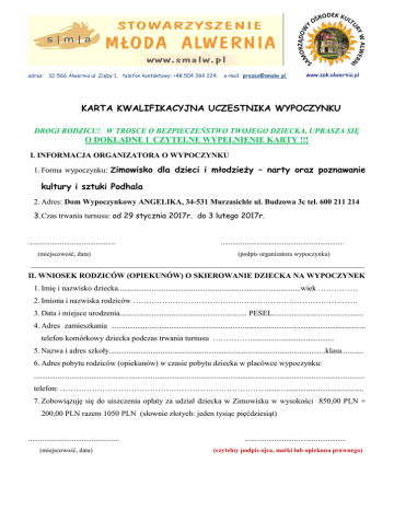 adres: 32-566 Alwernia ul. Zięby 1, telefon kontaktowy: +48 504 384 224; e-mail: [email protected] www.sok.alwernia.pl KARTA KWALIFIKACYJNA UCZESTNIKA WYPOCZYNKU DROGI RODZICU! W TROSCE O BEZPIECZEŃSTWO TWOJEGO DZIECKA, UPRASZA SIĘ O DOKŁADNE I CZYTELNE WYPEŁNIENIE KARTY !!! I. INFORMACJA ORGANIZATORA O WYPOCZYNKU 1. Forma wypoczynku: Zimowisko dla dzieci i młodzieży – narty oraz poznawanie kultury i sztuki Podhala 2. Adres: Dom Wypoczynkowy ANGELIKA, 34-531 Murzasichle ul. Budzowa 3c tel. 600 211 214 3. Czas trwania turnusu: od 29 stycznia 2017r. do 3 lutego 2017r. ............................................ (miejscowość, data) .............................................................. (podpis organizatora wypoczynku) II. WNIOSEK RODZICÓW (OPIEKUNÓW) O SKIEROWANIE DZIECKA NA WYPOCZYNEK 1. Imię i nazwisko dziecka............................................................................................wiek …………… 2. Imiona i nazwiska rodziców …………………………………………………………………………. 3. Data i miejsce urodzenia................................................................ PESEL.............................................. 4. Adres zamieszkania …............................................................................................................................ telefon komórkowy dziecka podczas trwania turnusu ……………......................................... 5. Nazwa i adres szkoły.............................................................................................................klasa........... 6. Adres pobytu rodziców (opiekunów) w czasie pobytu dziecka w placówce wypoczynku: ....................................................................................................................................................................... telefon: ……………………………………………………………………......…....................................... 7. Zobowiązuję się do uiszczenia opłaty za udział dziecka w Zimowisku w wysokości 850,00 PLN + 200,00 PLN razem 1050 PLN (słownie złotych: jeden tysiąc pięćdziesiąt) .............................................. (miejscowość, data) ................................................... (czytelny podpis ojca, matki lub opiekuna prawnego) III. INFORMACJA RODZICÓW (OPIEKUNÓW) O STANIE ZDROWIA DZIECKA(niepotrzebne skreślić) 1. Przebyte choroby (podać w którym roku życia): odra ..........., ospa .........., różyczka......... świnka.........., żółtaczka zakaźna ........ szkarlatyna ………., koklusz……………., inne choroby .............................................................................................................................................................. 2. Interwencje chirurgiczne/zabiegi/złamania (wyrostek tak/nie*) inne wykonane w ostatnim roku ……………………………………………………………………………………………… 3. U dziecka występowały w ostatnim roku lub występują obecnie (niepotrzebne skreślić): drgawki, omdlenia, utraty przytomności, zaburzenia równowagi, częste bóle głowy, częste bóle brzucha, trudności w zasypianiu, tiki, moczenia nocne, lęki nocne, wymioty, krwawienia z nosa, przewlekły kaszel, przewlekły katar, bóle stawów, duszności, szybkie męczenie się, niedosłuch, jąkanie, inne (jakie)................................................................................................................................................ .......................................................................................................................................................... 4. Dziecko (niepotrzebne skreślić) - jest nieśmiałe, ma trudności w nawiązywaniu kontaktów, jest nadpobudliwe, inne informacje o usposobieniu i zachowaniu dziecka:...................................... ......................................................................................................................................................... 5. Dziecko jest / nie jest (niepotrzebne skreślić) zalecane działania w przypadku wystąpienia ) uczulone ( gdy występują uczulenia podać na co oraz na: ................................................................................ ....................................................................................................................................................... Zalecenia dotyczące diety dziecka: …………………………………………………………….. Występujące alergie oraz zalecane działania w przypadku wystąpienia ………………………. ………………………………………………………………………………………………….. 6. Dziecko nosi: okulary, soczewki kontaktowe, aparat ortodontyczny, wkładki ortopedyczne (niepotrzebne skreślić), inne ............................................... ............................................................... 7. Jazdę samochodem dziecko znosi: dobrze / źle (niepotrzebne skreślić) 8. Dziecko nie przyjmuje stałych leków* Dziecko przyjmuje stałe leki (podać jakie i w jakich dawkach)* (*niepotrzebne skreślić) ………………………………………………………………………………………………………………………………………. ………………………………………………………………………………………………………………………………………. 9. Inne uwagi o zdrowiu dziecka oraz informacja o specjalnych potrzebach edukacyjnych uczestnika wypoczynku, w szczególności o potrzebach wynikających z niepełnosprawności, niedostosowania społecznego lub zagrożenia niedostosowaniem społecznym....................................................... .........................................................................................................