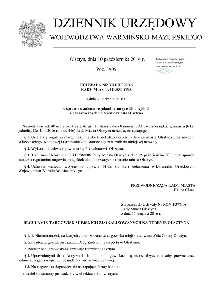 DZIENNIK URZĘDOWY WOJEWÓDZTWA WARMIŃSKO-MAZURSKIEGO Olsztyn, dnia 10 października 2016 r. Elektronicznie podpisany przez: Mariola Katarzyna Porczyńska Data: 2016-10-10 10:26:23 Poz. 3905 UCHWAŁA NR XXVII/378/16 RADY MIASTA OLSZTYNA z dnia 31 sierpnia 2016 r. w sprawie ustalenia regulaminu targowisk miejskich zlokalizowanych na terenie miasta Olsztyna Na podstawie art. 40 ust. 2 pkt 4 i art. 41 ust. 1 ustawy z dnia 8 marca 1990 r. o samorządzie gminnym (tekst jednolity Dz. U. z 2016 r., poz. 446) Rada Miasta Olsztyna uchwala, co następuje: § 1. Ustala się regulamin targowisk miejskich zlokalizowanych na terenie miasta Olsztyna przy ulicach: Wilczyńskiego, Kolejowej i Grunwaldzkiej, stanowiący załącznik do niniejszej uchwały. § 2. Wykonanie uchwały powierza się Prezydentowi Olsztyna. § 3. Traci moc Uchwała nr LXIX/880/06 Rady Miasta Olsztyn z dnia 25 października 2006 r. w sprawie ustalenia regulaminu targowisk miejskich zlokalizowanych na terenie miasta Olsztyn. § 4. Uchwała wchodzi w życie po upływie 14 dni od dnia ogłoszenia w Dzienniku Urzędowym Województwa Warmińsko-Mazurskiego. PRZEWODNICZĄCA RADY MIASTA Halina Ciunel Załącznik do Uchwały Nr XXVII/378/16 Rady Miasta Olsztyna z dnia 31 sierpnia 2016 r. REGULAMIN TARGOWISK MIEJSKICH ZLOKALIZOWANYCH NA TERENIE OLSZTYNA § 1. 1. Nieruchomości, na których zlokalizowane są targowiska miejskie są własnością Gminy Olsztyn. 2. Zarządcą targowisk jest Zarząd Dróg Zieleni i Transportu w Olsztynie. 3. Nadzór nad targowiskami sprawuje Prezydent Olsztyna § 2. Uprawnionymi do dokonywania handlu na targowiskach są osoby fizyczne, osoby prawne oraz jednostki organizacyjne nie posiadające osobowości prawnej. § 3. Na targowisku dopuszcza się następujące formy handlu: 1) handel stacjonarny prowadzony w obiektach budowlanych, Dziennik Urzędowy Województwa Warmińsko-Mazurskiego –2– Poz. 3905 2) handel okrężny (obwoźny, obnośny – prowadzony z ziemi, ręki, koszów, pojazdów mechanicznych, przyczep itp.), 3) handel z ław targowych. § 4. 1. Zarządca targowisk miejskich odpowiedzialny jest za ich prawidłowe funkcjonowanie. 2. Zarządca targowisk miejskich ma w szczególności obowiązek: 1) utrzymać w czystości teren targowisk miejskich, 2) organizować techniczną i sanitarną obsługę targowisk miejskich; 3) konserwować i remontować majątek trwały znajdujący się na targowiskach miejskich; 4) prowadzić targowiska miejskie w sposób umożliwiający ruch kołowy i pieszy na ich terenie oraz przyległych bezpośrednio do nich ulicach, 5) wykonywać inne czynności zlecone przez Prezydenta Olsztyna związane z prawidłowym prowadzeniem targowisk miejskich; § 5. Na targowiskach miejskich mogą być sprzedawane wszystkie towary za wyjątkiem: 1) napojów alkoholowych, 2) środków odurzających, 3) nafty, benzyny, spirytusu skażonego (denaturatu), trucizn, środków leczniczych, 4) kamieni i metali szlachetnych oraz wykonywanych z nich przedmiotów, 5) zagranicznych banknotów i monet, 6) żywych zwierząt bez stwierdzenia spełnienia wymagań weterynaryjnych oraz wyraźnej zgody Zarządcy, 7) papierów wartościowych, 8) broni, amunicji, materiałów i artykułów pirotechnicznych i wybuchowych, 9) grzybów świeżych rosnących w warunkach naturalnych bez wymaganego atestu wydanego przez uprawnionego klasyfikatora grzybów lub grzyboznawcę, 10) innych artykułów, których sprzedaż zabroniona jest na podstawie odrębnych przepisów. § 6. Sprzedaż mięsa i przetworów mięsnych, drobiu bitego i przetworów drobiowych, ryb i przetworów rybnych, tłuszczów zwierzęcych i roślinnych, mleka i przetworów mlecznych, lodów i innych środków spożywczych wymagających zabezpieczenia przed niewłaściwą temperaturą i nasłonecznieniem może być prowadzona pod warunkiem spełnienia wymogów określonych przepisami sanitarnymi, fitosanitarnymi i weterynaryjnymi. § 7. Organizowanie targów, wystaw, pokazów, kiermaszy, konkursów itp. jest nadzorowane przez odpowiednie organy po spełnieniu wymagań określonych dla prowadzenia danego rodzaju działalności, a podmiot zamierzający prowadzić taką działalność składa odpowiednie wnioski do tych organów oraz Zarządcy. § 8. Zabrania się na targowiskach: 1) wystawiania, podawania oraz spożywania napojów alkoholowych, 2) uprawiania gier losowych i hazardowych oraz sprzedaży towarów w drodze publicznych losowań, 3) wnoszenia i używania materiałów i substancji niebezpiecznych, 4) handlu na ciągach komunikacyjnych pieszych i jezdniach targowiska, 5) wprowadzenia na teren targowisk psów bez smyczy i kagańca, 6) wywieszania reklam bez zgody Zarządcy. § 9. Miejsca sprzedaży na targowiskach wyznacza ich Zarządca. Dziennik Urzędowy Województwa Warmińsko-Mazurskiego –3– Poz. 3905 § 10. 1. Podmioty i osoby prowadzące handel na targowiskach obowiązane są przestrzegać regulaminu targowisk, przepisów przeciwpożarowych, BHP, sanitarnych, fitosanitarnych, weterynaryjnych. 2. Sprzedawcy i inne osoby przebywające na targowisku powinny wykonywać swoje czynności w taki sposób, aby nie przeszkadzać w sprzedaży i zakupie innym. 3. Po zakończeniu sprzedaży miejsce handlu i najbliższego otoczenia winno być pozostawione w stanie czystym i uporządkowanym, a odpady i śmieci usunięte do przeznaczonych na ten cel pojemników. 4. Za znajdujące się na terenie targowiska towary, opakowania i urządzenia oraz ich należyte składowanie i zabezpieczenie odpowiada ich właściciel. 5. Zabrania się pozostawiania na placu i w najbliższym otoczeniu po godzinach handlu: wózków, skrzynek, innych opakowań. Wszelkie pozostawione przedmioty będą usuwane na koszt i ryzyko handlującego. § 11. 1. Osoba dokonująca handlu na targowisku jest obowiązana uwidocznić cenę na towarach wystawionych do sprzedaży. 2. Do ważenia lub mierzenia towarów mogą być używane wyłącznie jednostki miar obowiązujące w obrocie t