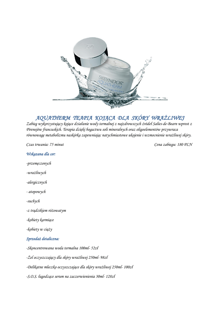 AQUATHERM TEAPIA KOJĄCA DLA SKÓRY WRAŻLIWEJ Zabieg wykorzystujący kojące działanie wody termalnej z najzdrowszych źródeł Salies-de-Bearn wprost z Pirenejów francuskich. Terapia dzięki bogactwu soli mineralnych oraz oligoelementów przywraca równowagę metabolizmu naskórka zapewniając natychmiastowe ukojenie i wzmocnienie wrażliwej skóry. Czas trwania: 75 minut Wskazana dla cer: -przemęczonych -wrażliwych -alergicznych - atopowych -suchych -z trądzikiem różowatym -kobiety karmiące -kobiety w ciąży Sprzedaż detaliczna: -Skoncentrowana woda termalna 100ml- 52zł -Żel oczyszczający dla skóry wrażliwej 250ml- 98zł -Delikatne mleczko oczyszczające dla skóry wrażliwej 250ml- 100zł -S.O.S. łagodzące serum na zaczerwienienia 30ml- 128zł Cena zabiegu: 180 PLN CORRECTIVE TERAPIA BOTOX LIKE Zaawansowana terapia botox-like stanowiąca alternatywę dla efektów medycyny estetycznej. Bogactwo stymulujących peptydów, zapobiegających skurczom mięśni neuro-peptydom, substancji wypełniających oraz głęboko nawilżającego kwasu hialuronowego zapewnia natychmiastową poprawę o walu twarzy, skutecznego korygowania mimicznych oraz głębokich zmarszczek oraz wyraźne zwiększenie elastyczności. Czas trwania: 75 minut Wskazana dla cer: -40, 45+ -które chcą opóźnić oznaki starzenia -mieszanych, tłustych, suchych, normalnych -które chcą poprawić kondycję skóry Sprzedaż detaliczna: -Krem skutecznie wygładzający zmarszczki mimiczne 50ml-243zł -Skoncentrowane serum wygładzające o działaniu anti- ageing 30ml- 210zł -Wygładzający krem na okolice oka 20ml- 145zł -Żel wygładzający zmarszczki mimiczne w okolicach ust 15ml- 112zł Cena zabiegu: 300 PLN ETERNAL KOMÓRKI MACIERZYSTE W TERAPII ANTI- AGEING Intensywna terapia anti-ageing zainspirowana najnowszymi badaniami inżynierii genetycznej. Dostarczane za pomocą nanotechnologii komórki macierzyste ekologicznie czystej jabłoni odmiany Uttwiler Spatlauber zapewniają natychmiastową odnowę, energetyzację i regenerację uszkodzonych komórek skóry. Tajemnica długowieczności zawarta w tych unikalnych fito-komórkach stymuluje pełną i trwałą obronę przed czynnikami zewnętrznymi sprawiając , że skóra pozostaje młoda na dłużej. Czas trwania: 75minut Wskazania dla cer: -25+, 35+ -u których widać pierwsze oznaki starzenia -mocno odwodnionych -po diecie -młode mamy karmiące Sprzedaż detaliczna: -Regenerujące serum do ciała 200ml- 155zł -Krem pod oczy 15ml- 155zł -Krem z komórkami macierzystymi 50ml- 229zł -Serum z komórkami macierzystymi 30ml- 219zł Cena zabiegu: 280 PLN SKEYNDOR MEN Specjalnie wyselekcjonowane substancje aktywne optymalnie nawilżają, likwidując szorstkość i niepożądane ściągnięcie skóry a także przyspieszają proces gojenia skóry, wzmacniając jej funkcje ochronne. Produkty linii SKEYNDOR MEN, opracowane zostały na bazie kompozycji składników o udowodnionym naukowo działaniu, wygładzającym, nawilżającym i wzmacniającym. Czas trwania: 60 minut Sprzedaż detaliczna: -Emulsja nawilżająco- matująca 50ml- 86zł -Serum przeciwzmarszczkowe 30ml- 152zł -Detoksykujący żel do mycia twarzy 150ml- 70zł -Żel do golenia 150ml- 54zł -Łagodząca emulsja po goleniu 100ml- 85zł Cena zabiegu: 200 PLN GLOBAL LIFT Nowy sposób zrozumienia istoty liftingujących zabiegów kosmetycznych. To nowa, globalna strategia anty-age, osiągająca efekt pełnego liftingu, przywracająca prawidłowy kształt owalu twarzy oraz poprawiająca strukturę tkanki podskórnej bez użycia skalpela. Program adresowany jest do białek – progerin, które decydują o tempie starzenia się komórek. Stężenie tego białka w jądrze komórkowym pozwala obliczyć biologiczny wiek komórek. Czas trwania: 75 minut Wskazana dla cer: -45, 50+ -Pań które boją się operacji plastycznych -Panie wcześniej ostrzykiwane botoksem Sprzedaż detaliczna: -Krem na twarz dla cer suchych/ normalnych/ mieszanych 50ml- 274zł -Krem pod oczy 15ml- 162zł Cena zabiegu: 350 PLN Posiadamy w sprzedaży detalicznej produkty z linii odżywczej: Aksamitne mleczko oczyszczające do codziennej pielęgnacji skóry. Zawartość naturalnych substancji przeciwutleniających wspomaga działanie przeciwstarzeniowe. Skóra pozostaje gładka i miękka w dotyku, doskonale przygotowana do dalszych zabiegów pielęgnacyjnych. Cena 155zł Pielęgnujący tonik o silnym działaniu ujędrniającym, nawilżającym i kojącym. Zawartość aminokwasów, białek i węglowodanów pochodzenia roślinnego skutecznie wygładza i odżywia skórę pozostawiając ją aksamitnie gładką. Cena 107zł Nocna kuracja odżywczo-ujędrniająca. Synergiczna kombinacja aminokwasów, oligoelementów i witamin, zapewnia głęboką rewitalizację skóry, pozostawiając ją odżywioną i pełną blasku. Cena 155zł POWER C+ Opatentowana Wit.C z kiwi w formie tłuszczowej, nadaje trwałość z dodatkiem koncentratu z granatu. Posiadające silne działanie antyoksydacyjne i przeciwrodnikowe. Rozświetla mocno zmęczoną skórę. Zwiększa wchłanianie komórkowe. Zwiększa wchłanianie kolagenu. Zahamowuje działanie enzymów rozkładające kolagen. Ochrania przed szkodliwymi działaniami promieni słonecznych. Czas trwania: 60 minut Wskazane dla cer: -sucha -zmęczona -skóra palacza -skóra mocno opalona -pierwsze objawy fotostarzenia -skóry przed latem / po lecie Sprzedaż detaliczna: -Emulsja do pielęgnacji skóry okolic oczu 15ml-119zł -Krem do twarzy dla cer normalnej/suchej 50ml-179zł -Krem do twarzy dla cer mieszanej i tłustej 50ml-179zł Cena zabiegu: 200 PLN