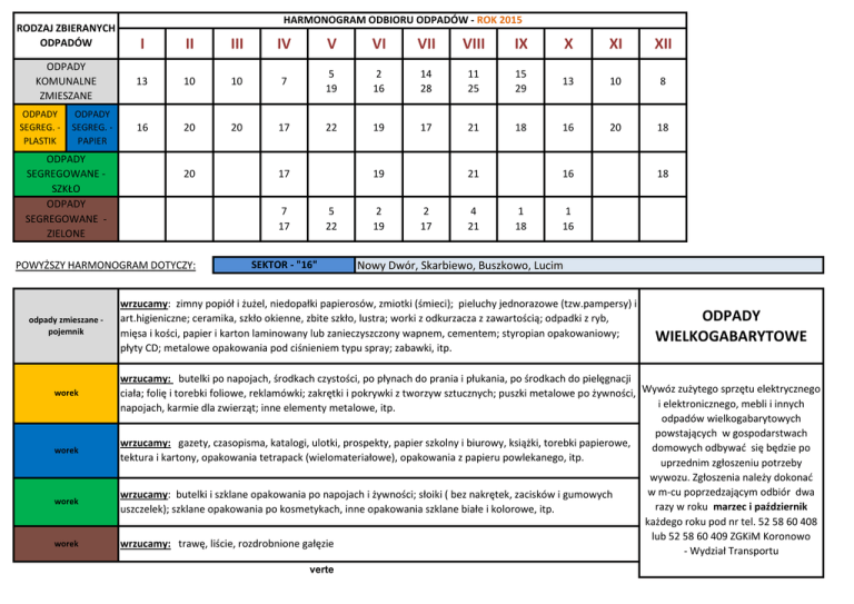 RODZAJ ZBIERANYCH ODPADÓW ODPADY KOMUNALNE ZMIESZANE ODPADY SEGREG. PLASTIK ODPADY SEGREG. PAPIER ODPADY SEGREGOWANE SZKŁO ODPADY SEGREGOWANE ZIELONE HARMONOGRAM ODBIORU ODPADÓW - ROK 2015 I II III IV V VI VII VIII IX X XI XII 13 10 10 7 5 19 2 16 14 28 11 25 15 29 13 10 8 16 20 20 17 22 19 17 21 18 16 20 18 20 worek worek worek worek 19 7 17 POWYŻSZY HARMONOGRAM DOTYCZY: odpady zmieszane pojemnik 17 5 22 SEKTOR - "16" 2 19 21 2 17 4 21 16 1 18 18 1 16 Nowy Dwór, Skarbiewo, Buszkowo, Lucim wrzucamy: zimny popiół i żużel, niedopałki papierosów, zmiotki (śmieci); pieluchy jednorazowe (tzw.pampersy) i art.higieniczne; ceramika, szkło okienne, zbite szkło, lustra; worki z odkurzacza z zawartością; odpadki z ryb, mięsa i kości, papier i karton laminowany lub zanieczyszczony wapnem, cementem; styropian opakowaniowy; płyty CD; metalowe opakowania pod ciśnieniem typu spray; zabawki, itp. ODPADY WIELKOGABARYTOWE wrzucamy: butelki po napojach, środkach czystości, po płynach do prania i płukania, po środkach do pielęgnacji ciała; folię i torebki foliowe, reklamówki; zakrętki i pokrywki z tworzyw sztucznych; puszki metalowe po żywności, Wywóz zużytego sprzętu elektrycznego i elektronicznego, mebli i innych napojach, karmie dla zwierząt; inne elementy metalowe, itp. odpadów wielkogabarytowych powstających w gospodarstwach wrzucamy: gazety, czasopisma, katalogi, ulotki, prospekty, papier szkolny i biurowy, książki, torebki papierowe, domowych odbywać się będzie po tektura i kartony, opakowania tetrapack (wielomateriałowe), opakowania z papieru powlekanego, itp. uprzednim zgłoszeniu potrzeby wywozu. Zgłoszenia należy dokonać w m-cu poprzedzającym odbiór dwa wrzucamy: butelki i szklane opakowania po napojach i żywności; słoiki ( bez nakrętek, zacisków i gumowych razy w roku marzec i październik uszczelek); szklane opakowania po kosmetykach, inne opakowania szklane białe i kolorowe, itp. każdego roku pod nr tel. 52 58 60 408 lub 52 58 60 409 ZGKiM Koronowo wrzucamy: trawę, liście, rozdrobnione gałęzie - Wydział Transportu verte Podane terminy odbioru odpadów komunalnych dotyczą tylko posesji wyposażonych w pojemniki o pojemności od 60 do 1100 litrów. W dniu wywozu należy wystawić pojemniki i zawiązane worki przed posesją w widocznym miejscu do godziny 7:00. Pojemniki do zbiórki odpadów zmieszanych można zakupić w ZGKiM Koronowo. Worki do segregacji odpadów dla terenów NIEZAMIESZKAŁYCH są dostępne w sprzedaży w ZGKiM Koronowo. Informujemy, iż odbierane będą również worki z segregacją bez zachowania kolorów - warunkiem jest opisanie zawartości worka.