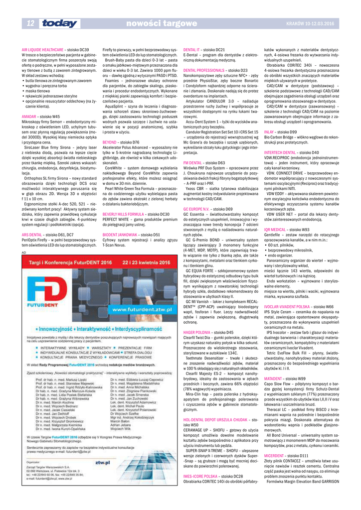 12 AIR LIQUIDE HEALTHCARE – stoisko DC39 W trosce o bezpieczeństwo pacjenta w gabinecie stomatologicznym irma poszerzyła swoją ofertę o podręczne, w pełni wyposażone zestawy tlenowe z butlą z zaworem zintegrowanym. W skład zestawu wchodzą: • butla tlenowa ze zintegrowanym zaworem • wygodna i poręczna torba • maska tlenowa • rękawiczki jednorazowe sterylne • opcjonalnie resuscytator oddechowy (na życzenie klienta). nowości targowe Firely to pierwszy, w pełni bezprzewodowy system oświetlenia LED do lup stomatologicznych. Brush-Baby pasta dla dzieci 0-3 lat – pasta o smaku jabłkowo-miętowym przeznaczona dla dzieci w wieku 0-3 lat. Zawiera 1000 ppm luoru – dawkę zgodną z wytycznymi PASD i PTSD. Foamies – jednorazowe okulary ochronne dla pacjentów, do zabiegów skalingu, piaskowania i procedur endodontycznych. Wykonane z miękkiej pianki zapewniają komfort i bezpieczeństwo pacjenta. AquaSplint – szyna do leczenia i diagnozowania schorzeń stawu skroniowo-żuchwowego, dzięki zastosowaniu technologii poduszek wodnych pozwala szczęce i żuchwie na ustawienie się w pozycji anatomicznej, szybka i prosta w użyciu. AMADAR – stoisko W45 Mikroskopy irmy Semorr – endodontyczny mikroskop z oświetleniem LED, uchylnym tubusem oraz płynną regulacją powiększenia (model 3000D). Wysokiej klasy niemiecka optyka i przystępna cena. SiroLaser Blue irmy Sirona – jedyny laser z niebieska diodą, pozwala na lepsze cięcie dzięki wysokiej absorbcji światła niebieskiego przez tkankę miękką. Szeroki zakres wskazań: chirurgia, endodoncja, dezynfekcja, biostymulacja. Orthophos SL firmy Sirona – nowy standard obrazowania dzięki technologii DCS oraz możliwości interaktywnego poruszania się w głąb obrazu 2D. Wersja 3D o objętości f 11 x 10 cm. Ergonomiczne stołki A-dec 520, 521 – niezrównany komfort pracy! Aktywny system siedziska, który zapewnia prawidłową cyrkulacje krwi w czasie długich zabiegów. 4-punktowy system regulacji i podłokietniki (opcja). BEVERLY HILLS FORMULA – stoisko DC30 PERFECT WHITE – gama produktów premium do pielęgnacji jamy ustnej. ARS DENTAL – stoisko D61, DC7 PeriOptix Firely – w pełni bezprzewodowy system oświetlenia LED do lup stomatologicznych. BIODENT JANKOWIAK – stoisko D51 Cyfrowy system rejestracji i analizy zgryzu T-Scan Novus. AD BEYOND – stoisko D76 Akcelerator Polus Advanced – wyposażony nie tylko w 5-krotnie nagradzaną technologię Lightbridge, ale również w kilka ciekawych udoskonaleń. CoreWhite – system domowego wybielania nakładkowego Beyond CoreWhite zapewnia profesjonalne efekty, które możesz osiągnąć w domu w 30 min. dziennie. Pearl White Green Tea Formula – przeznaczona do codziennego użytku wybielająca pasta do zębów zawiera ekstrakt z zielonej herbaty o działaniu bakteriobójczym. DENTAL IT – stoisko DC21 E-Dental – program dla dentystów z elektroniczną dokumentacją medyczną. DENTAL PROFESSIONALS – stoisko D23 Nanokompozytowe zęby sztuczne NFC+ - zęby przednie PhysioStar, zęby boczne Bonartic i Condyloform najbardziej odporne na ścieranie i złamania. Doskonale nadają się do protez overdenture na implantach. Artykulator CANDULOR 3.0 – naśladuje przestrzenne ruchy żuchwy i współpracuje ze wszystkimi dostępnymi na rynku łukami twarzowymi. Accu-Dent System 1 – łyżki do wycisków anatomicznych przy bezzębiu. Candulor Registration Set Set 10 i CRS Set 15 – urządzenia do rejestracji wewnątrzustnej wg Mc Grane’a do bezzębia i szczęk uzębionych, wykreślanie strzały łuku gotyckiego i jego interpretacja. FM DENTAL – stoisko D63 Wirówka PRF Duo System – opracowane przez J. Choukruna najnowsze urządzenie do pozyskiwania dwóch frakcji ibryny bogatopłytkowej – A-PRF oraz I-PRF. Yxoss CBR – siatka tytanowa stabilizująca augmentat kostny indywidulanie projektowana w technologii CAD/CAM. GC EUROPE N.V. – stoisko D69 GC Essentia – światłoutwardzalny kompozyt do estetycznych uzupełnień, innowacyjna i wyznaczająca nowe trendy koncepcja 7 odcieni stworzonych z myślą o naśladowaniu naturalnych zębów. GC G-Premio BOND – uniwersalny system łączący zawierający 3 monomery funkcyjne (4-MET, MDP, MDTP), które zapewniają trwałe wiązanie nie tylko z tkanką zęba, ale także z kompozytami, metalami oraz tlenkiem cyrkonu i tlenkiem glinu. GC EQUIA FORTE – szkłojonomerowy system hybrydowy do estetycznej odbudowy typu bulk ill, dzięki zwiększonym właściwościom izycznym wynikającym z nowatorskiej technologii hybrydy szkła, dodatkowo rekomendowany do stosowania w ubytkach klasy II. GC MI Varnish – lakier z kompleksem RECALDENT TM (CPP-ACP) uwalniający biodostępny wapń, fosforan i luor. Leczy nadwrażliwość zębów i zapewnia zwiększoną, długotrwałą ochronę. HAGER POLONIA – stoisko D45 Clearil Twist Dia – gumki polerskie, dzięki którym uzyskasz naturalny połysk w kilka sekund. Przeznaczone do wielokrotnego stosowania, sterylizowane w autoklawie 134C. Teethmate Desensitizer – trwałe i skuteczne znoszenie nadwrażliwości zębów, materiał w 100 % składający się z naturalnych składników. Clearil Majesty ES-2 – kompozyt nanohybrydowy, idealny do zastosowania w zębach przednich i bocznych, zawiera 66% objętości (78% wagowych) wypełniacza. Mira-Clin hap – pasta polerska z hydroksyapatytem do profesjonalnego polerowania i czyszczenia zębów w gabinecie stomatologicznym. HOL-DENTAL DEPOT URSZULA CHUDAK – stoisko W50 CERAMAGE UP – SHOFU – gotowy do użycia kompozyt umożliwia dowolne modelowanie kształtu zębów bezpośrednio z aplikatora przy użyciu instrumentu lub pędzla. SUPER-SNAP X-TREME – SHOFU – ulepszone wersje zielonych i czerwonych dysków Super-Snap – są grubsze i mogą być mocniej dociskane do powierzchni polerowanej. IMES-ICORE POLSKA – stoisko DC28 Obrabiarka CORiTEC 140i do obróbki półfabry- KRAKÓW 10-12.03.2016 katów wykonanych z materia